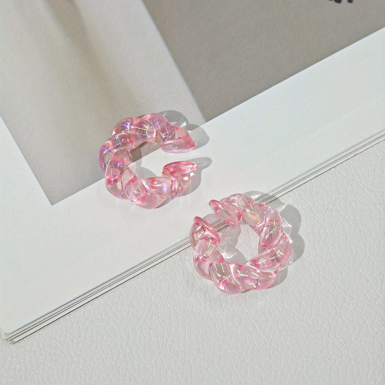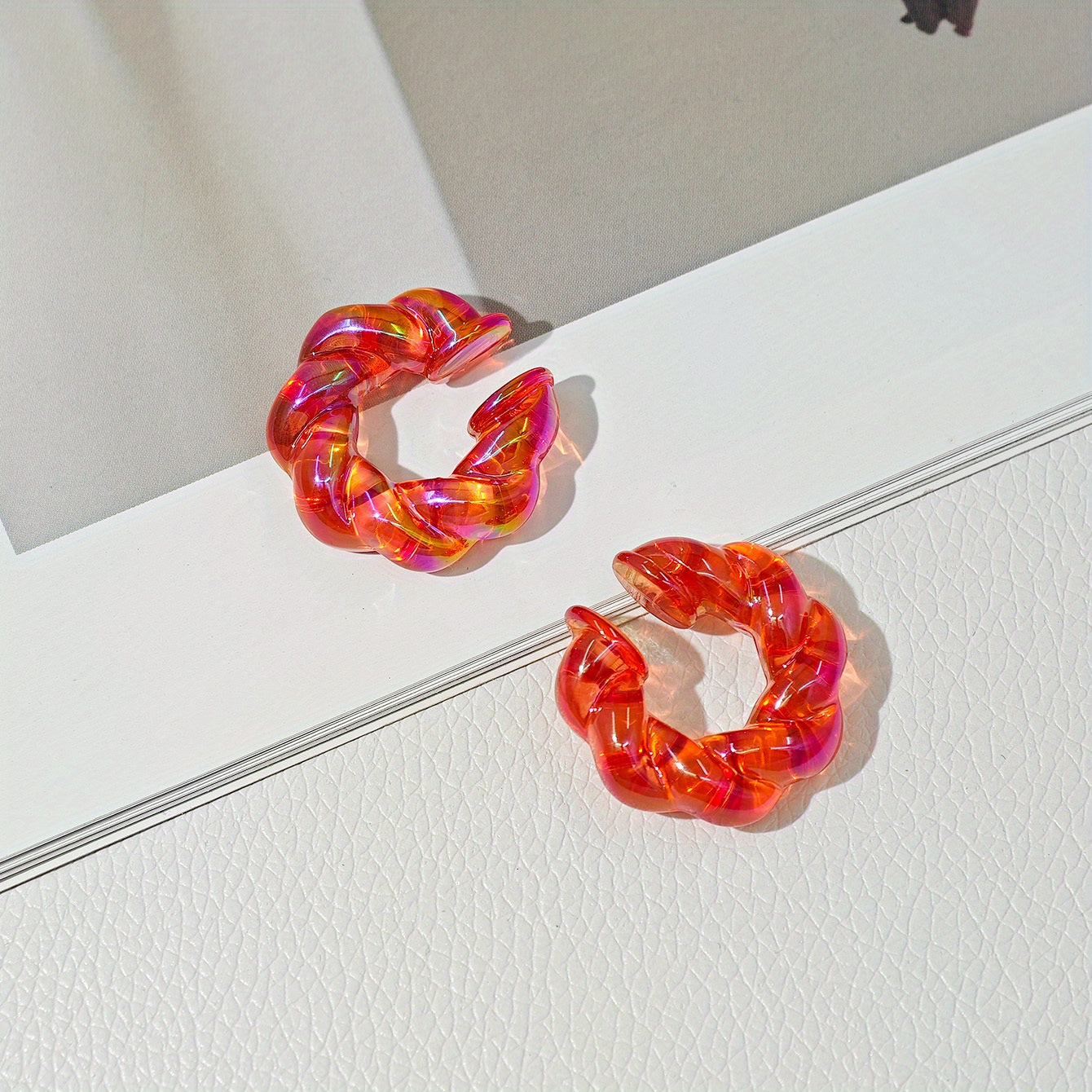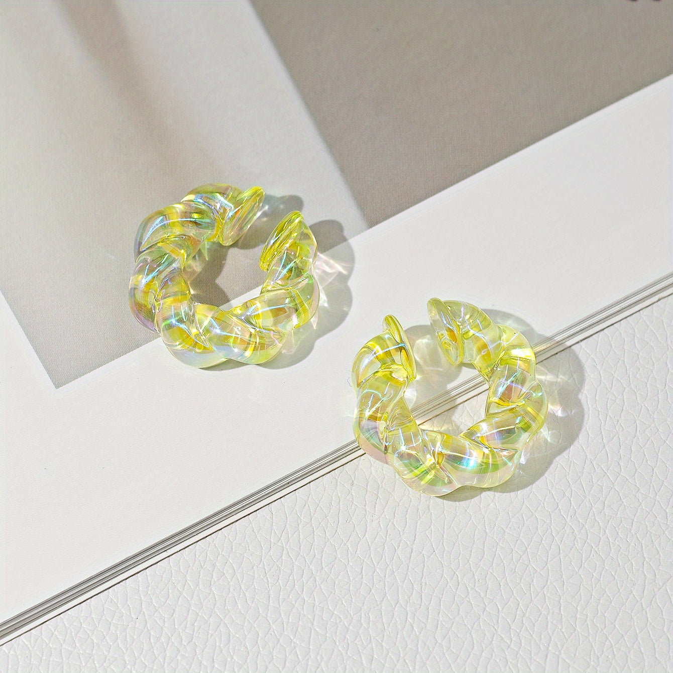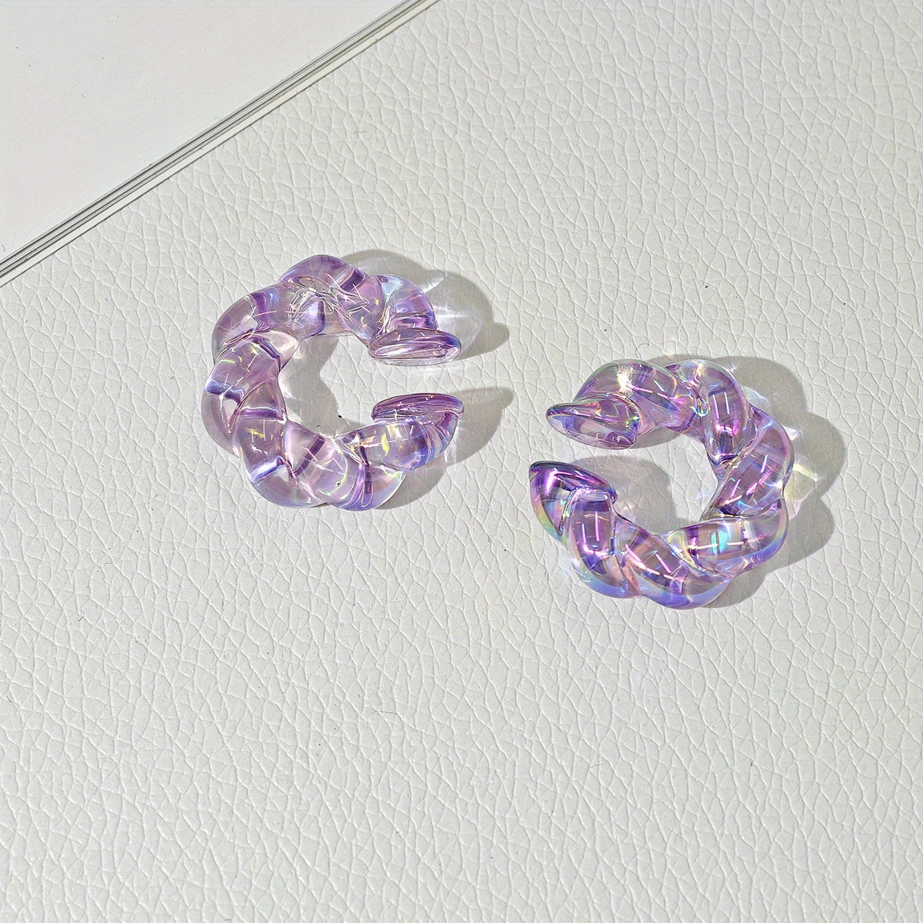 Get this European and American style earring set featuring transparent twist acrylic ear clips in vibrant colors. No piercing required for a trendy look.