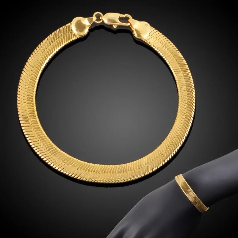 Enhance your party look with this light and stylish set featuring a golden flat chain bracelet and necklace. Ideal for Middle East and Latin America styles.
