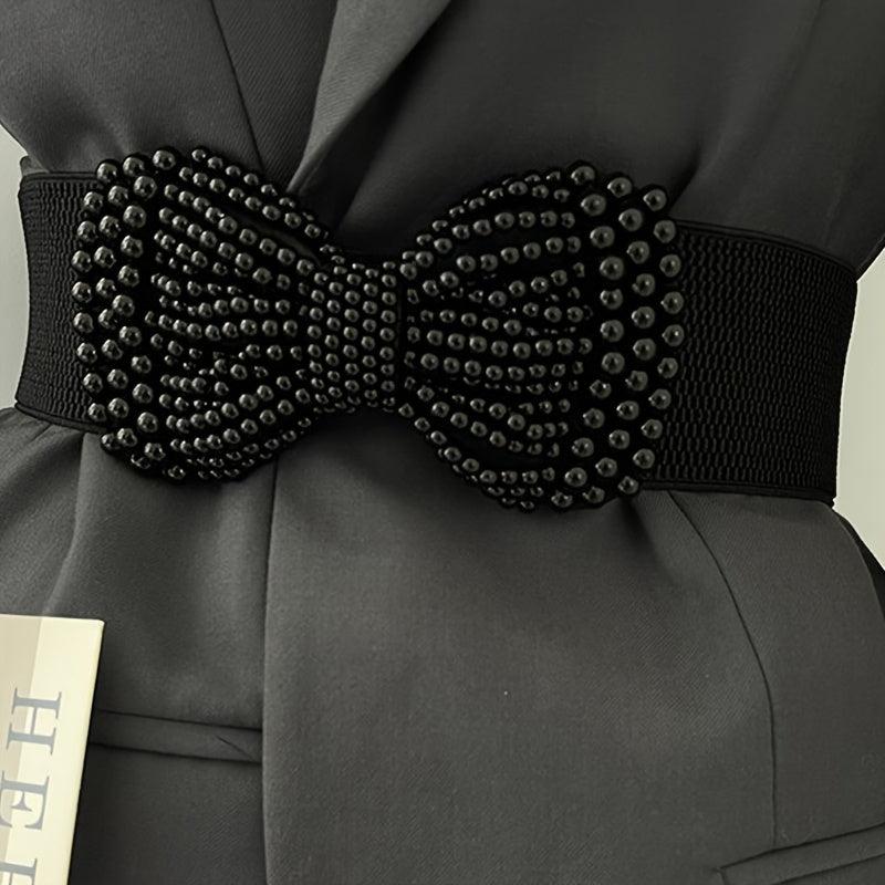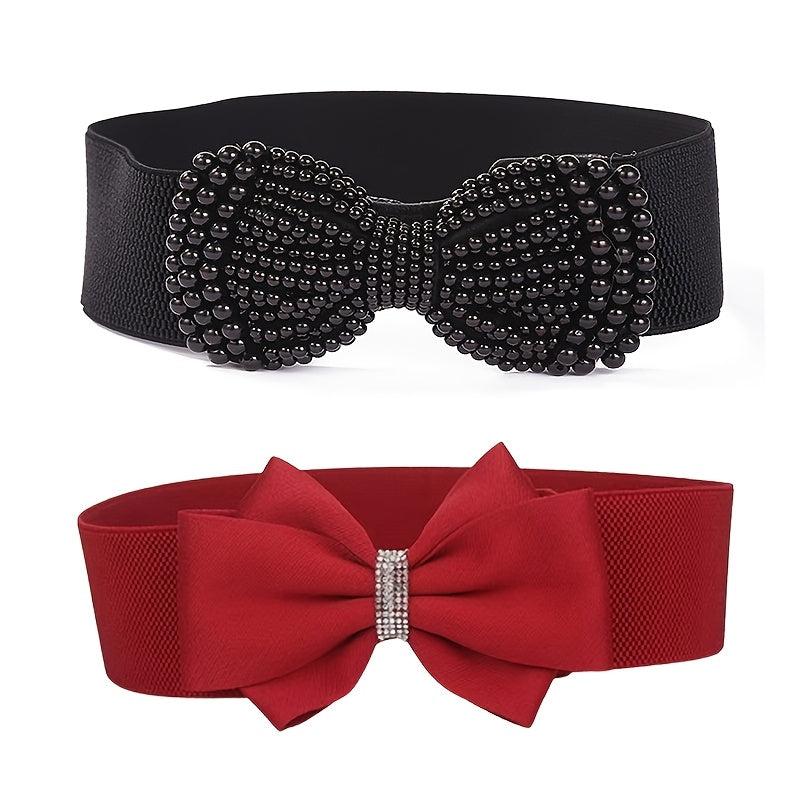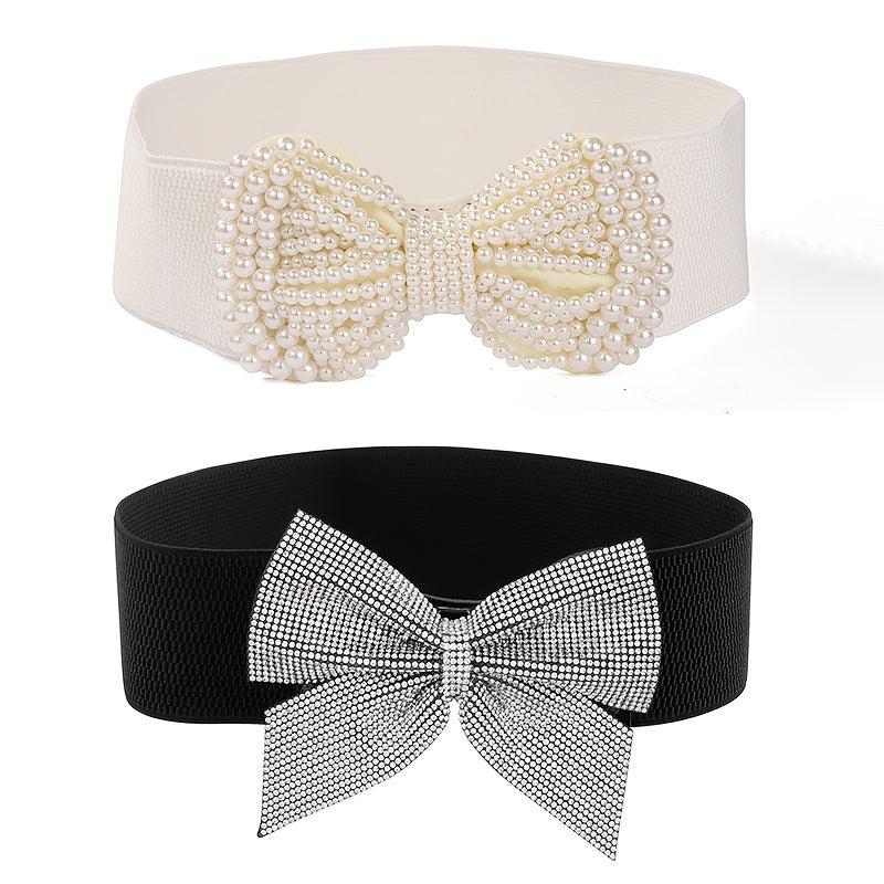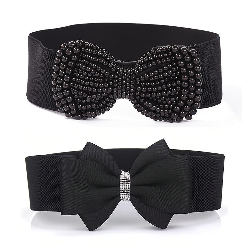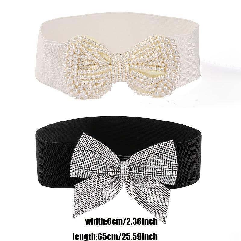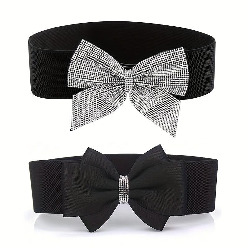 Stylish knit belt perfect for dresses, coats, and shirts. Ideal for casual to formal occasions. Features a bow and rhinestone accents for a touch of elegance.