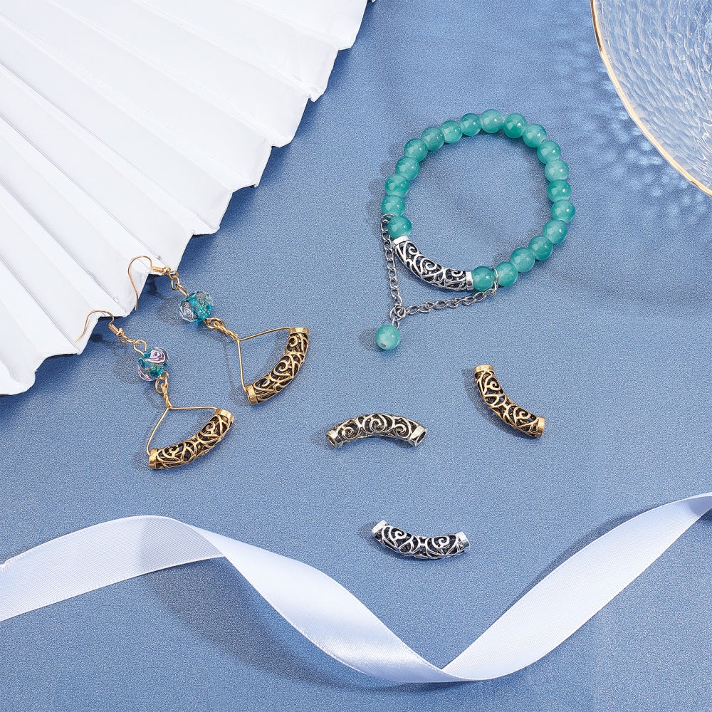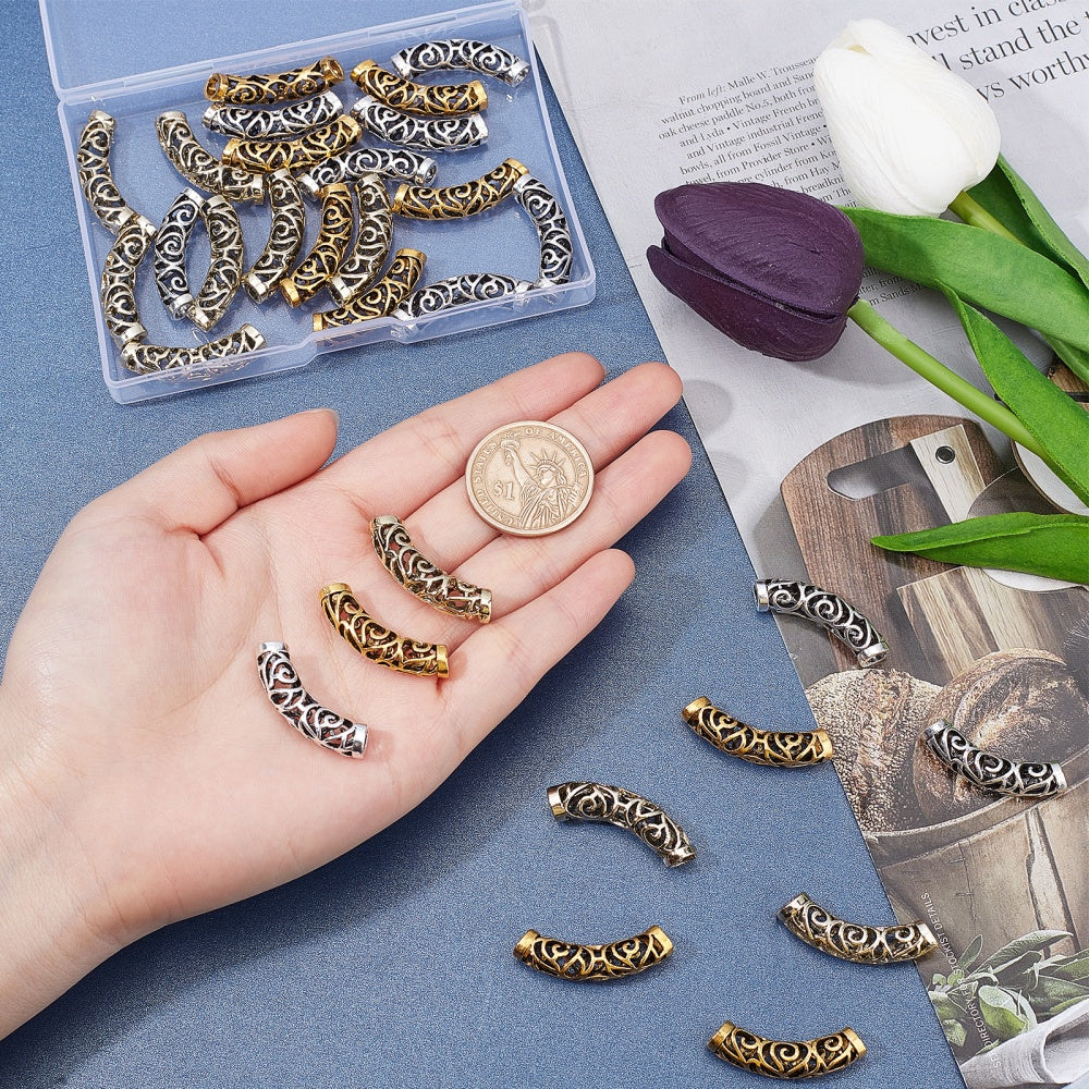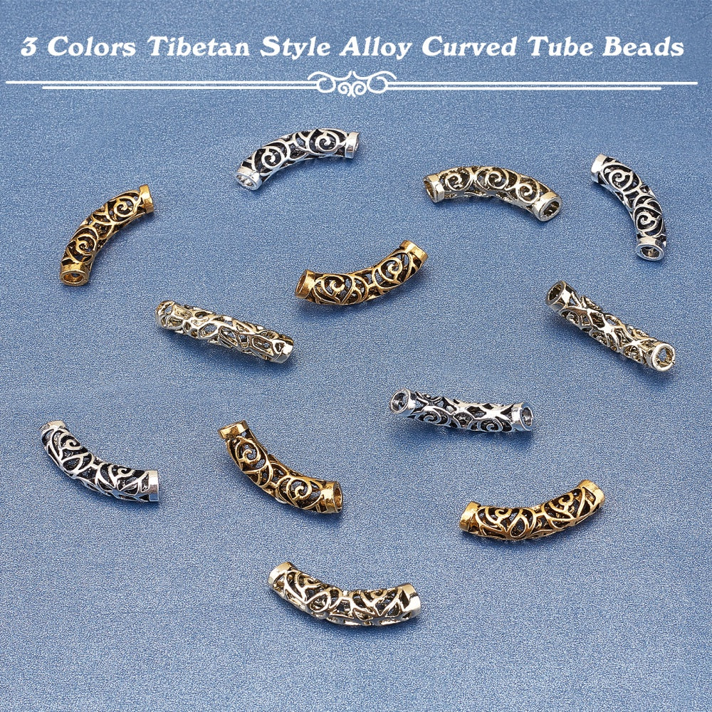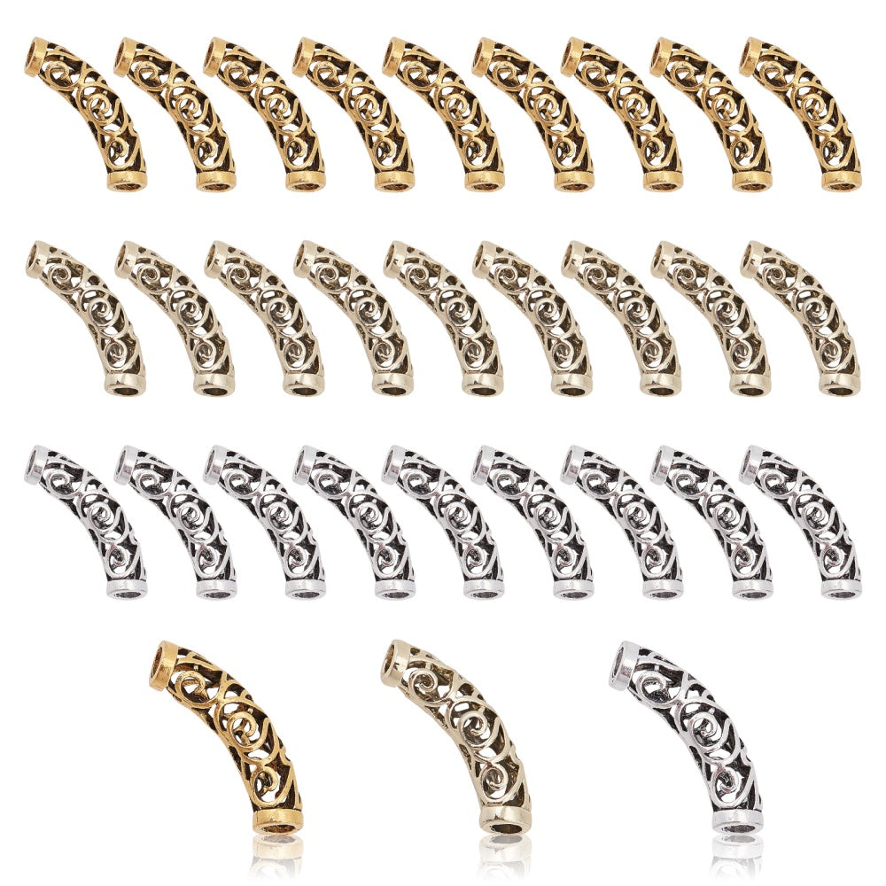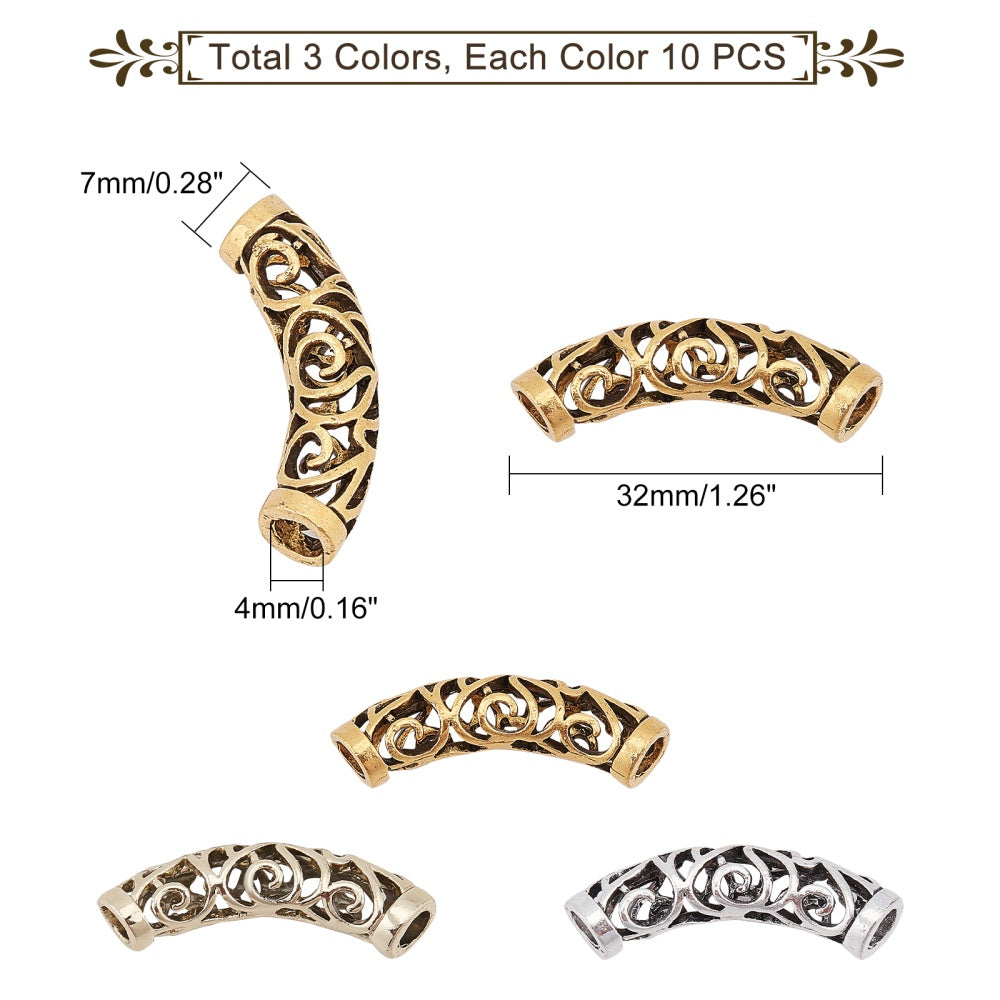 This set includes 30 pieces of 32mm curved tube beads in 3 different colors. These twisted tube spacers are hollow and perfect for DIY jewelry making, necklaces, and bracelets with a 4mm hole.