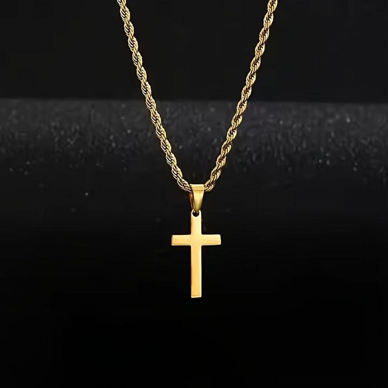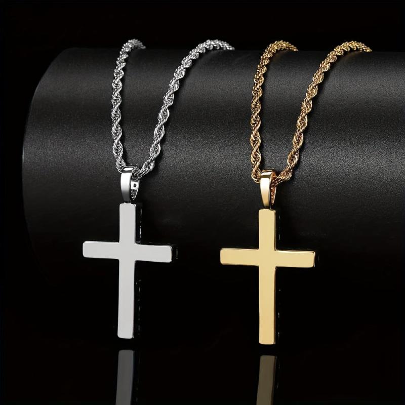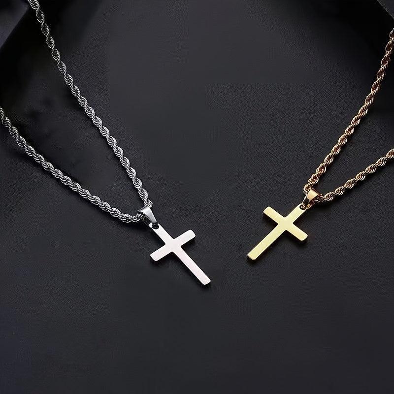 This hipster style cross necklace is made of durable stainless steel, perfect for daily wear or gifting. It features a twisted rope chain design that adds a unique touch to your outfit. The necklace is waterproof and ideal for everyday use.