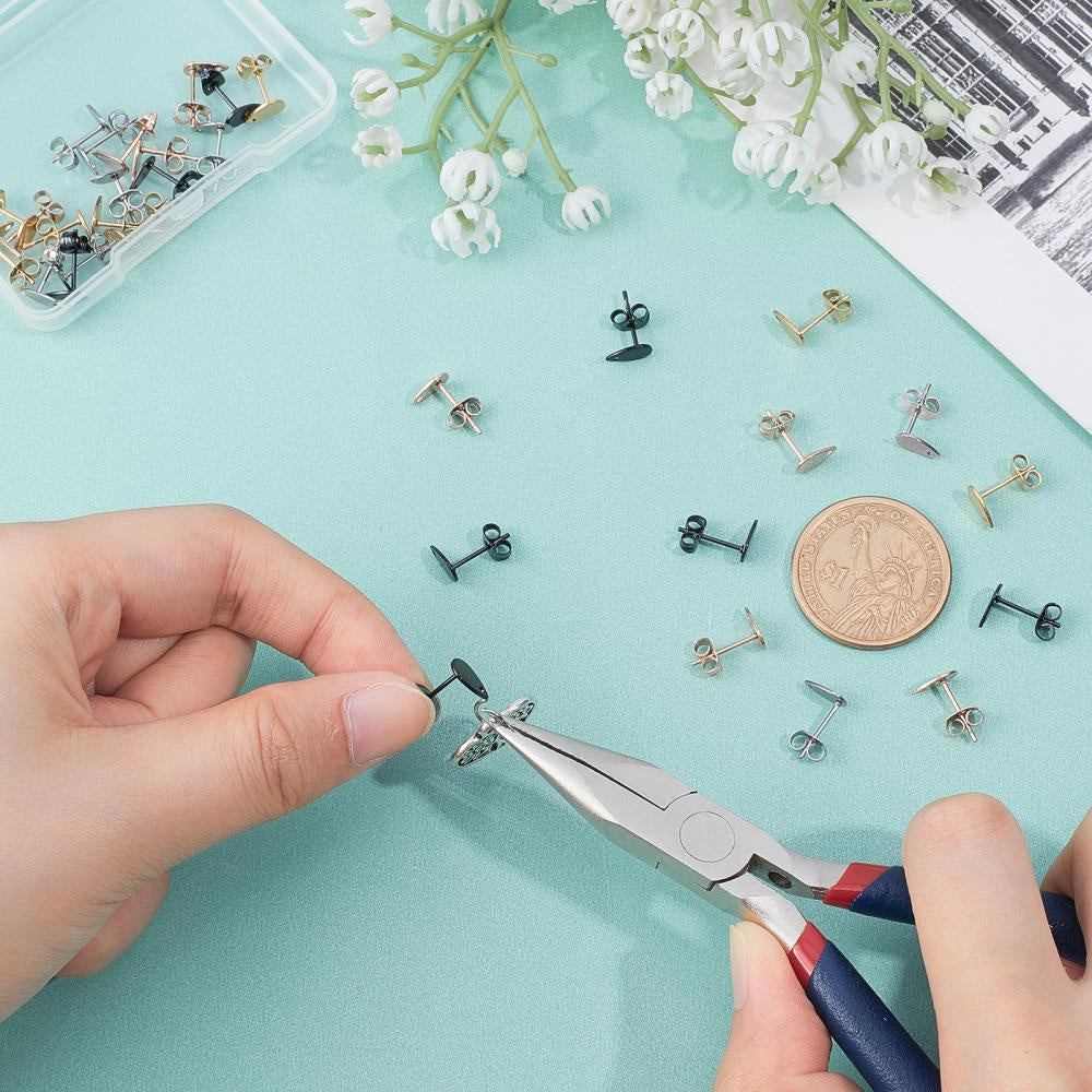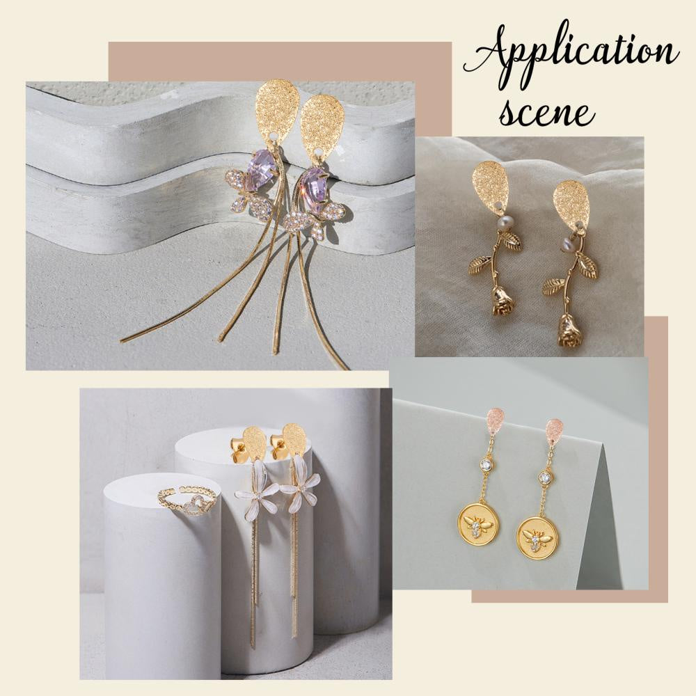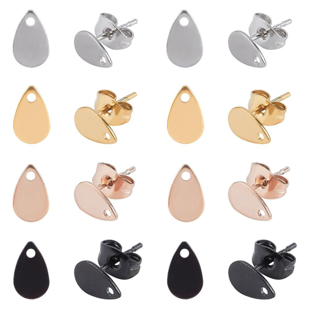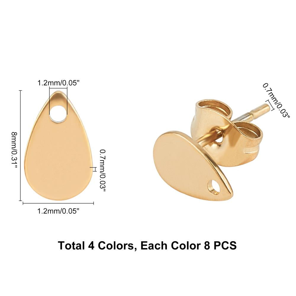 This box contains 32 earring findings with a flat teardrop plate in 4 different colors. Each piece measures 8x5x0.6mm with a hole of 1.2mm and pin of 0.7mm.