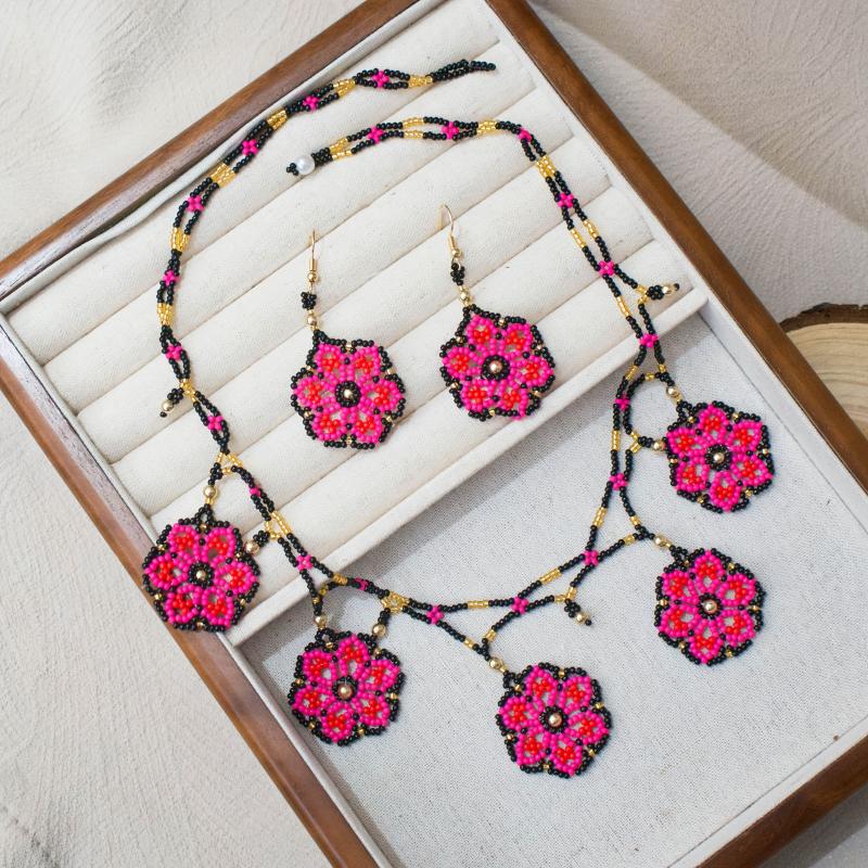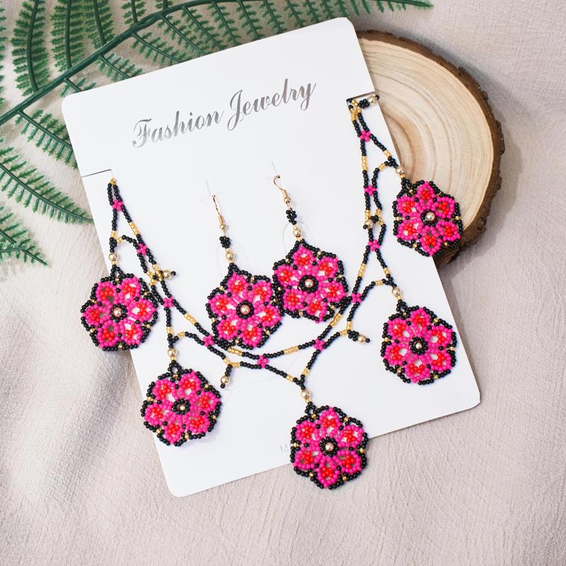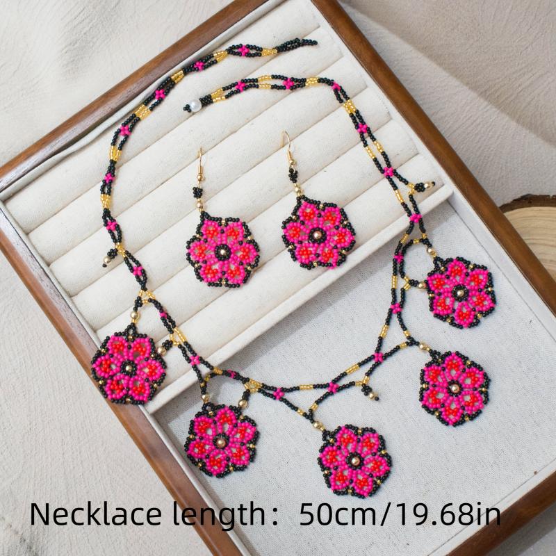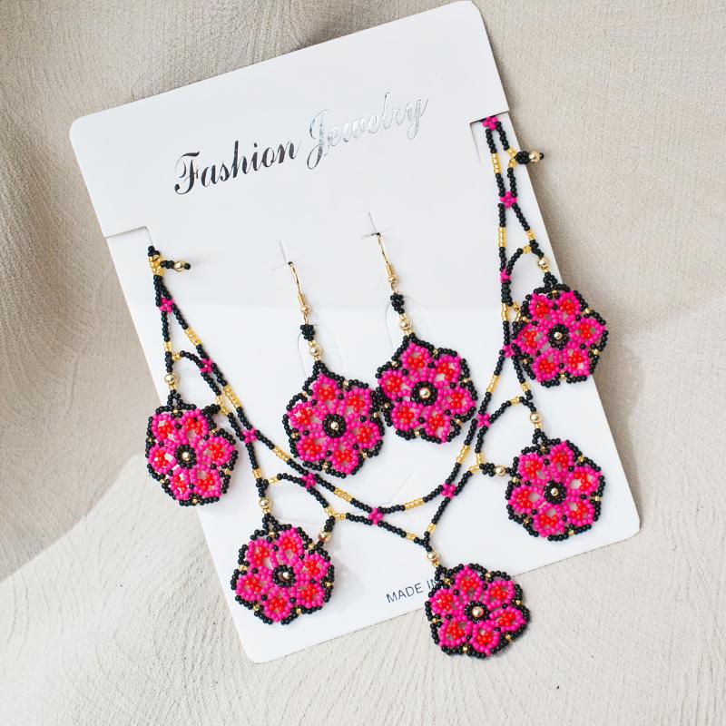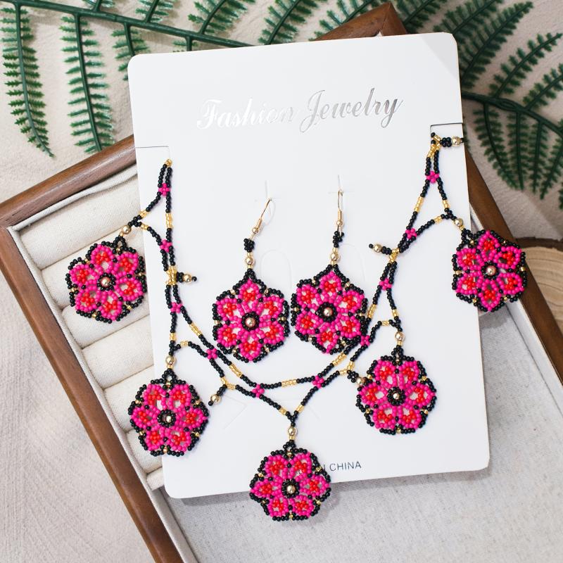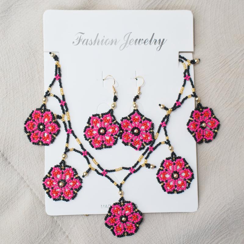 Add a touch of bohemian flair to your look with this handcrafted 3-piece jewelry set featuring intricate beading and floral designs. Perfect for adding a pop of color and style to any outfit.