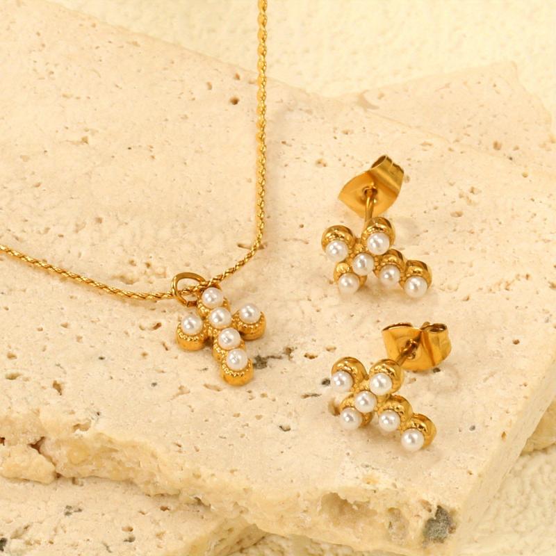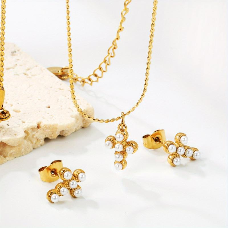 Complete your casual attire with this elegant 3-piece jewelry set featuring a cross pendant necklace and sophisticated earrings. Perfect for parties, banquets, and music festivals.