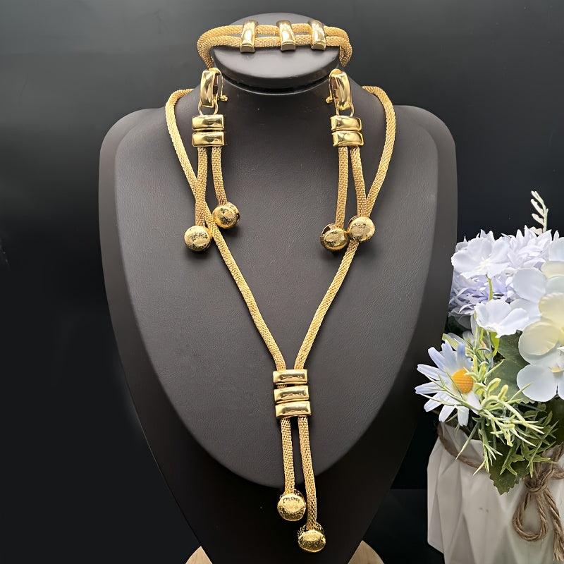 This 3-piece jewelry set includes drop earrings, necklace, and bracelet, making it suitable for daily wear, parties, and weddings. It is perfect for brides looking to add a touch of elegance to their outfit.