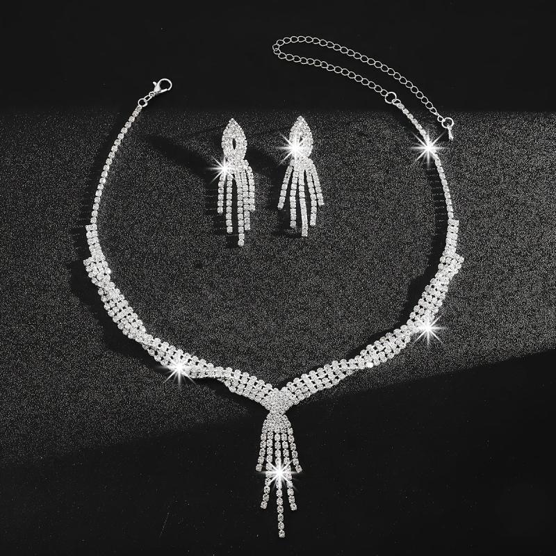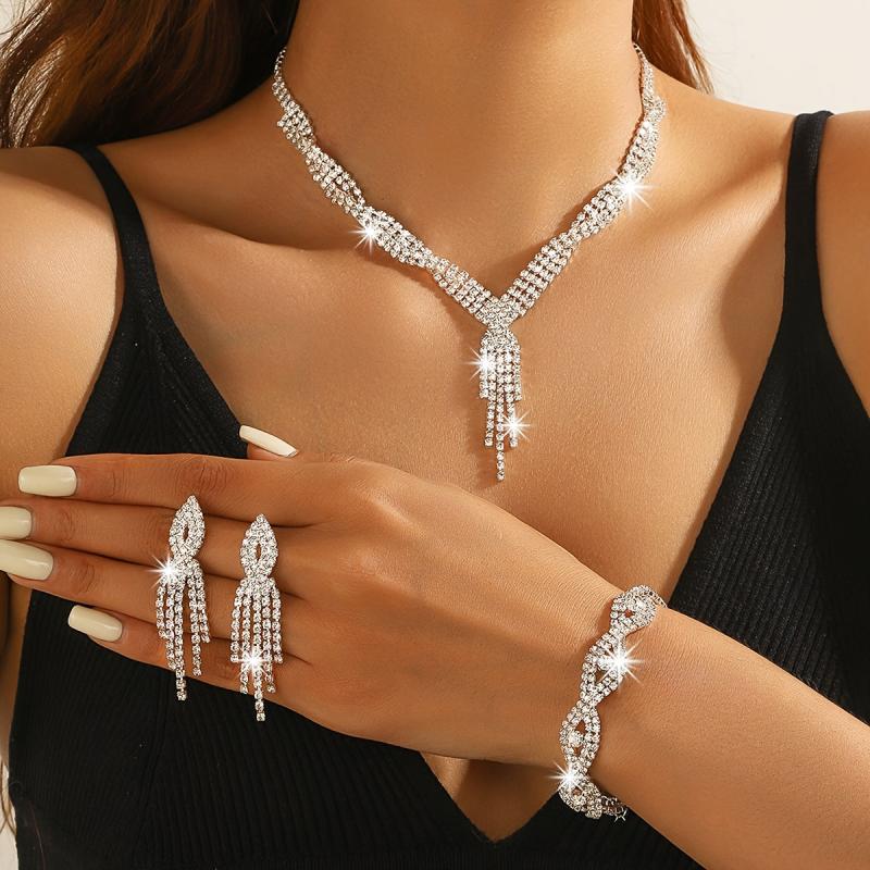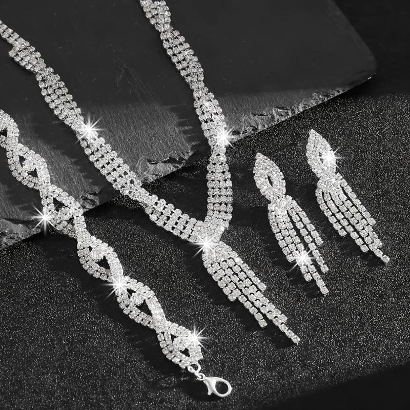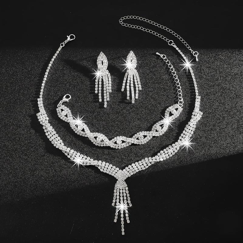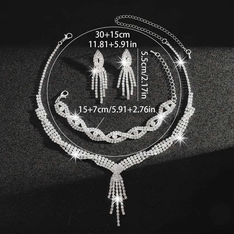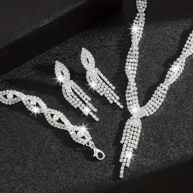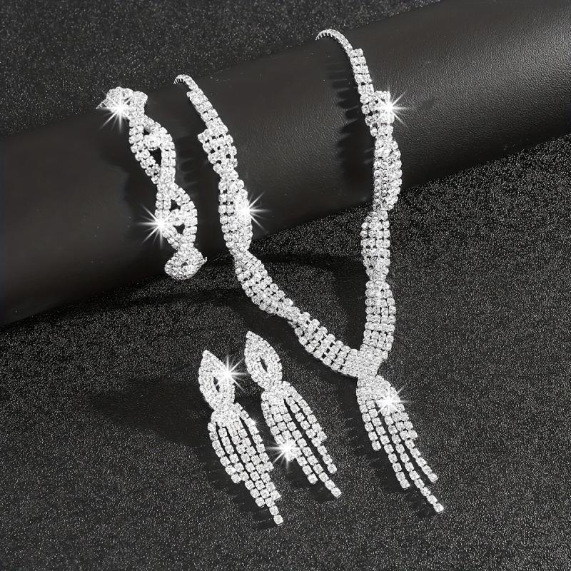 This elegant jewelry set features twisted rhinestones that sparkle beautifully. It includes a necklace, bracelet, and earrings, making it perfect for weddings and formal events.