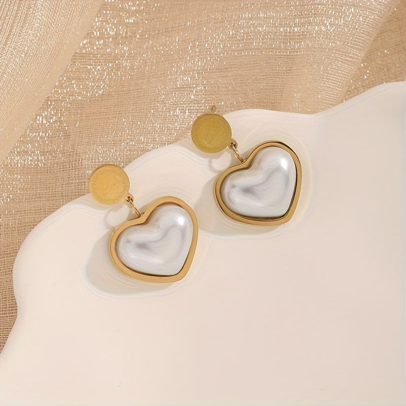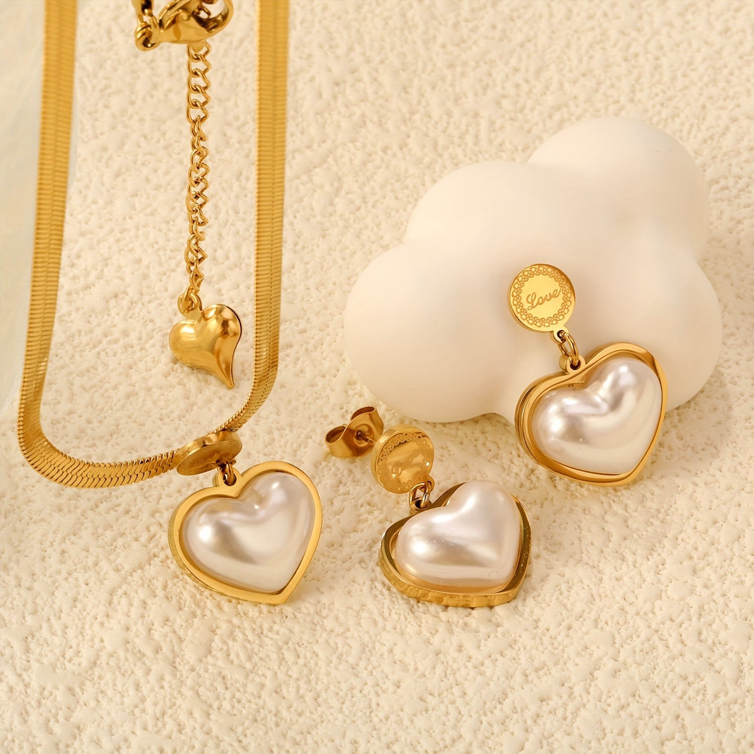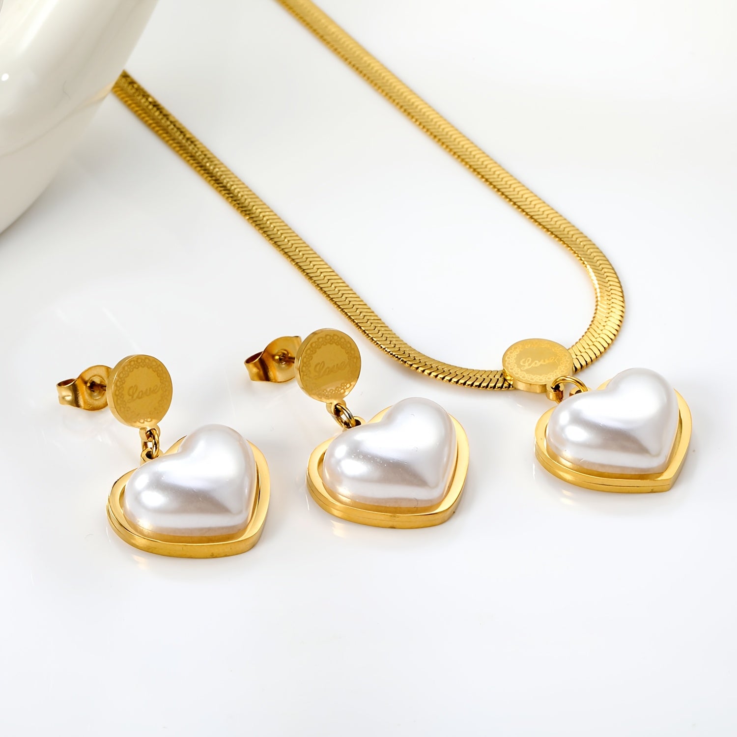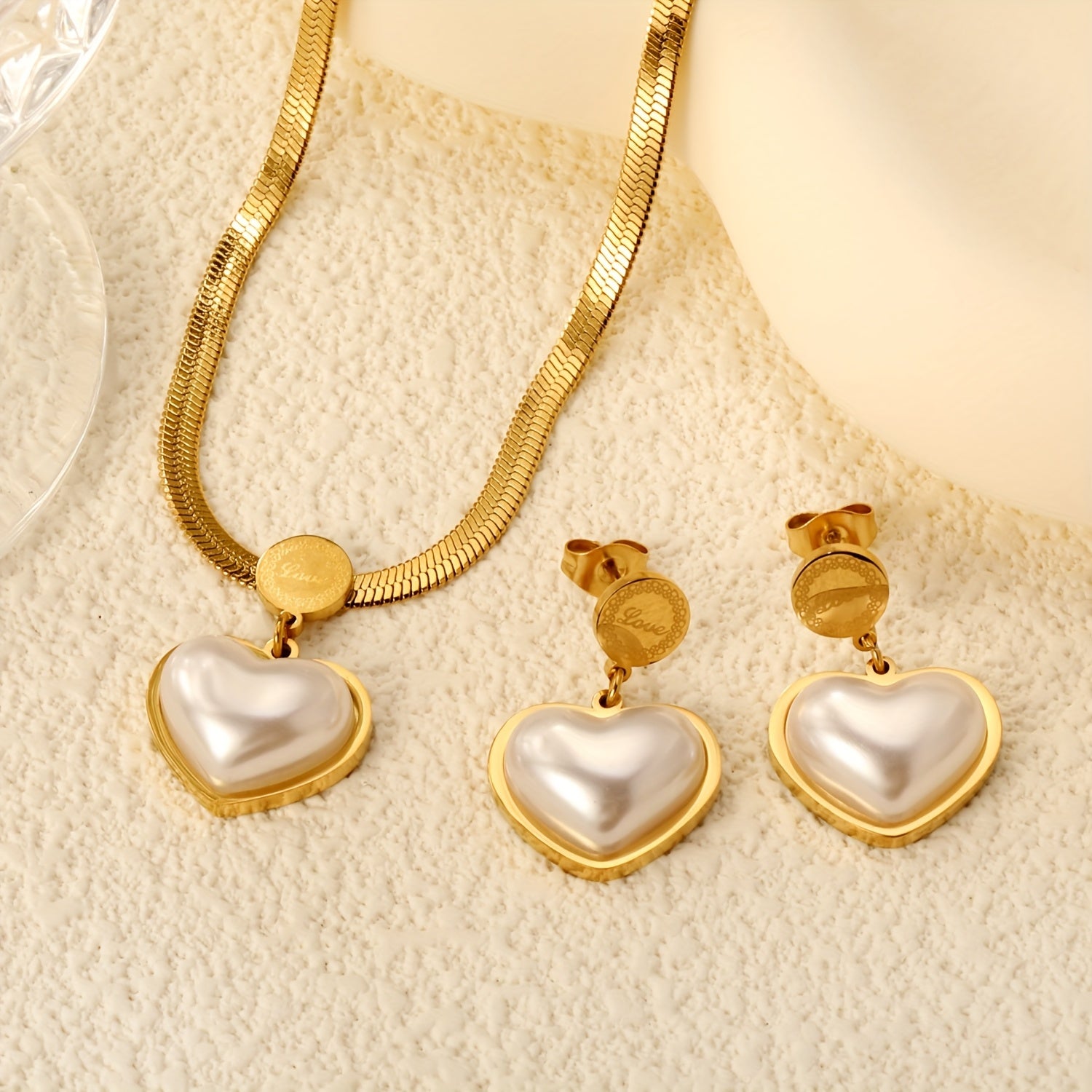 3pcs Stainless Steel Heart Inlaid Shell Golden Necklace Earrings Set