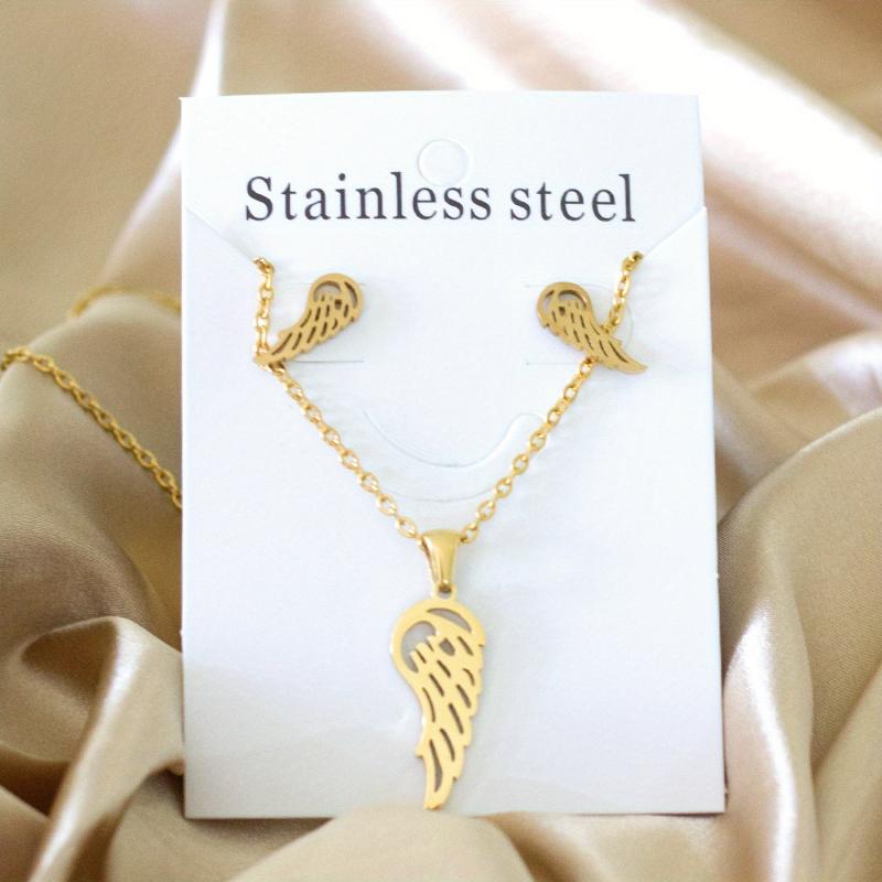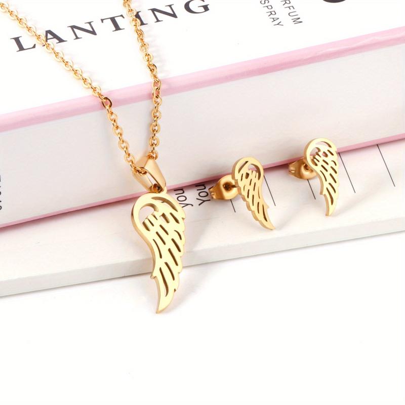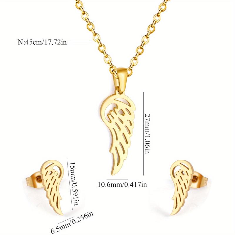 Complete your casual attire with this 3-piece jewelry set. It includes a hollow wing charm chain necklace and matching earrings. Crafted from stainless steel with 18K golden plating, these hypoallergenic studs are perfect for everyday wear.