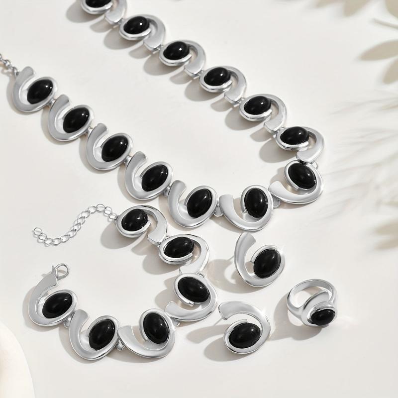 This stunning jewelry set includes a necklace, earrings, bracelet, and ring. The pieces feature a spiral splicing design with acrylic inlay. Perfect for adding a touch of elegance to any outfit.