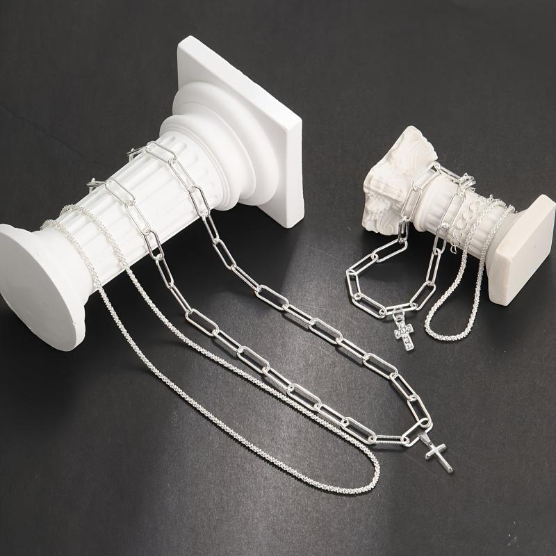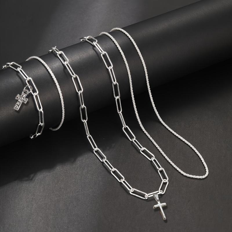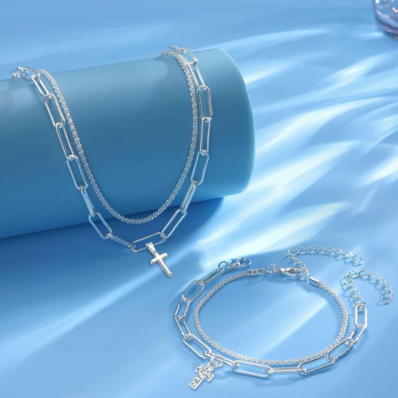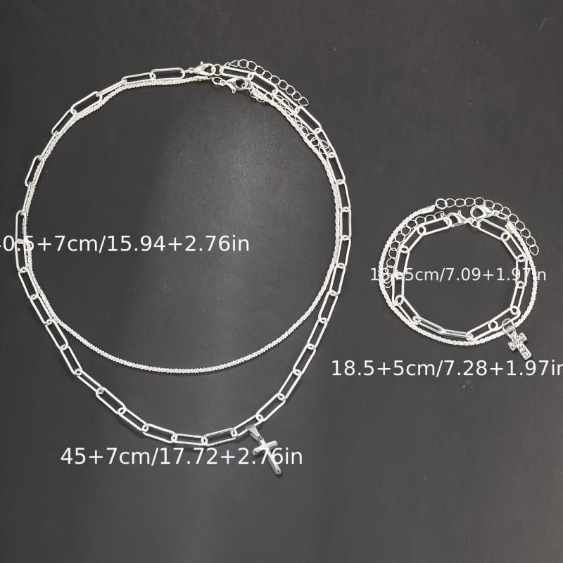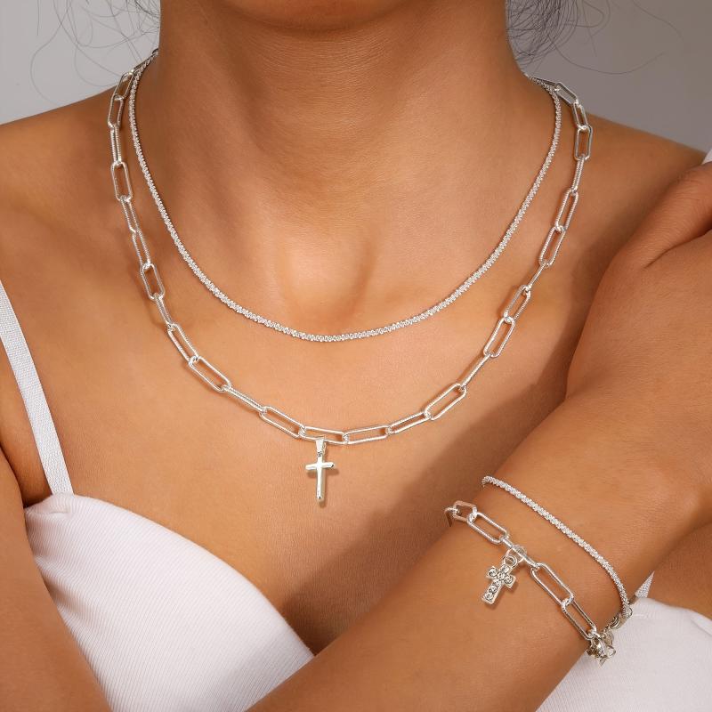 Enhance your style with this elegant 4-piece set that includes a sparkling cross bracelet and necklace. Perfect for dates, vacations, casual attire, parties, and gifting.