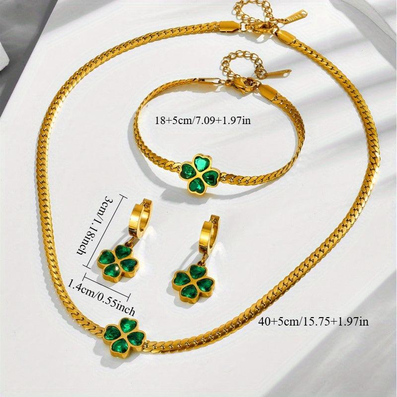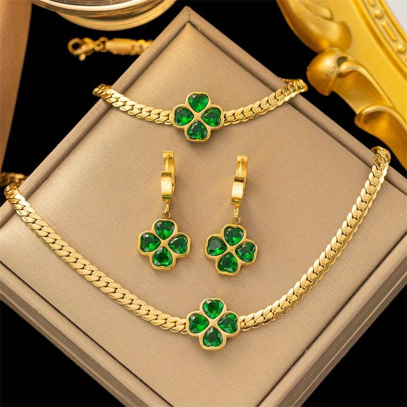 Elegant and stylish 4-piece stainless steel emerald flower set including pendant necklace and earrings. Perfect for women who love green jewelry.