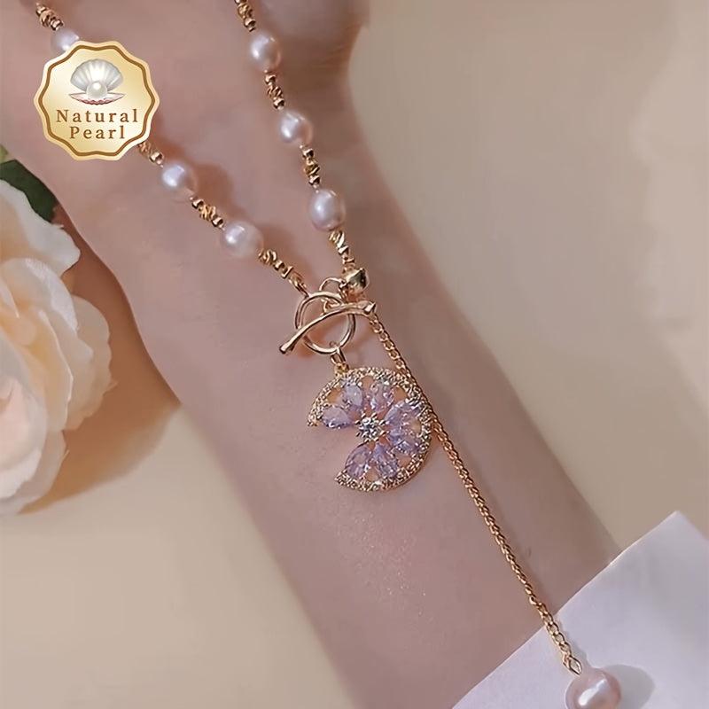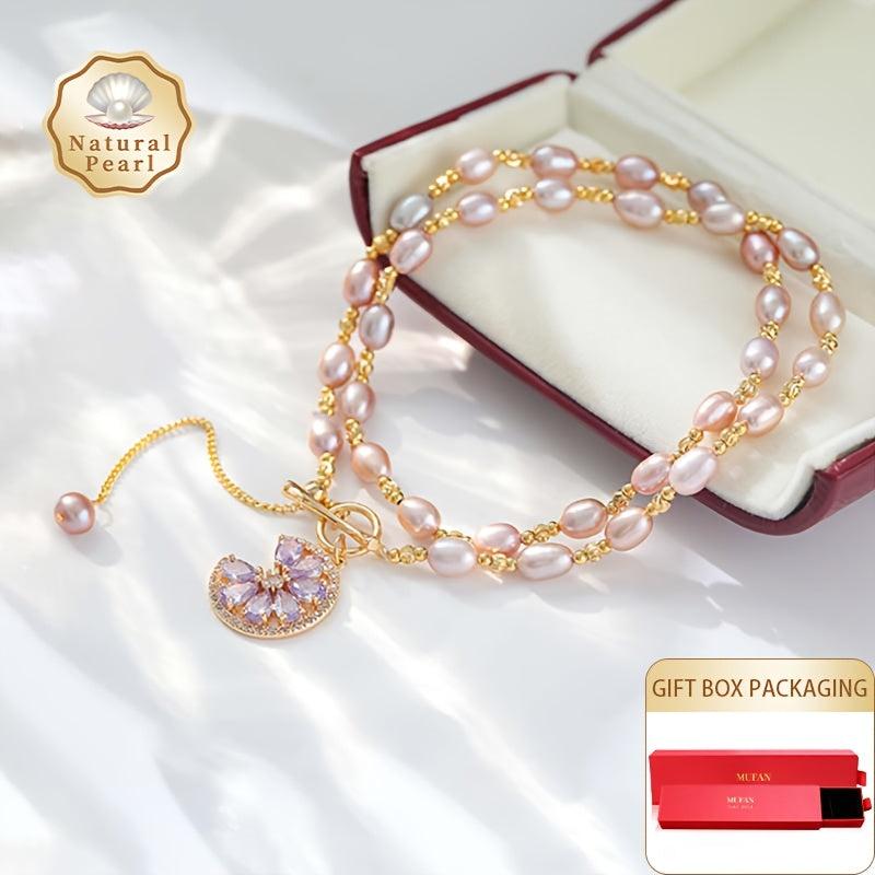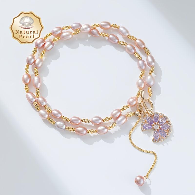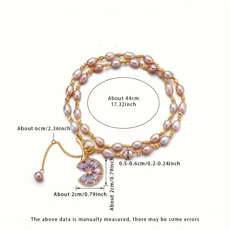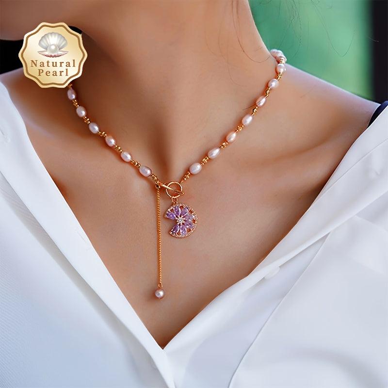 This elegant necklace features 5-6mm natural freshwater pearls in a beautiful pinkish purple hue. Accented with golden tone spacers, this piece is perfect for June birthdays or any special occasion.