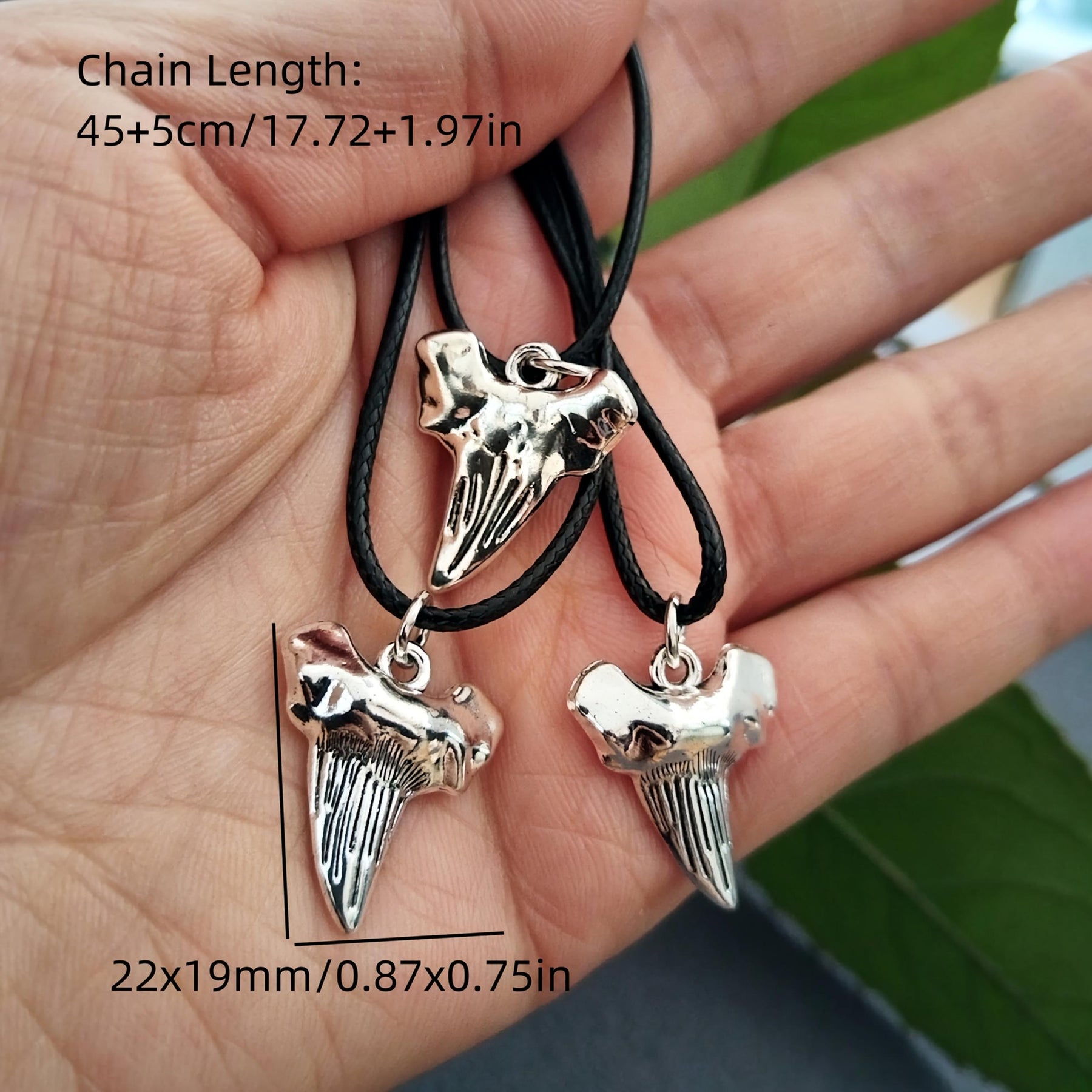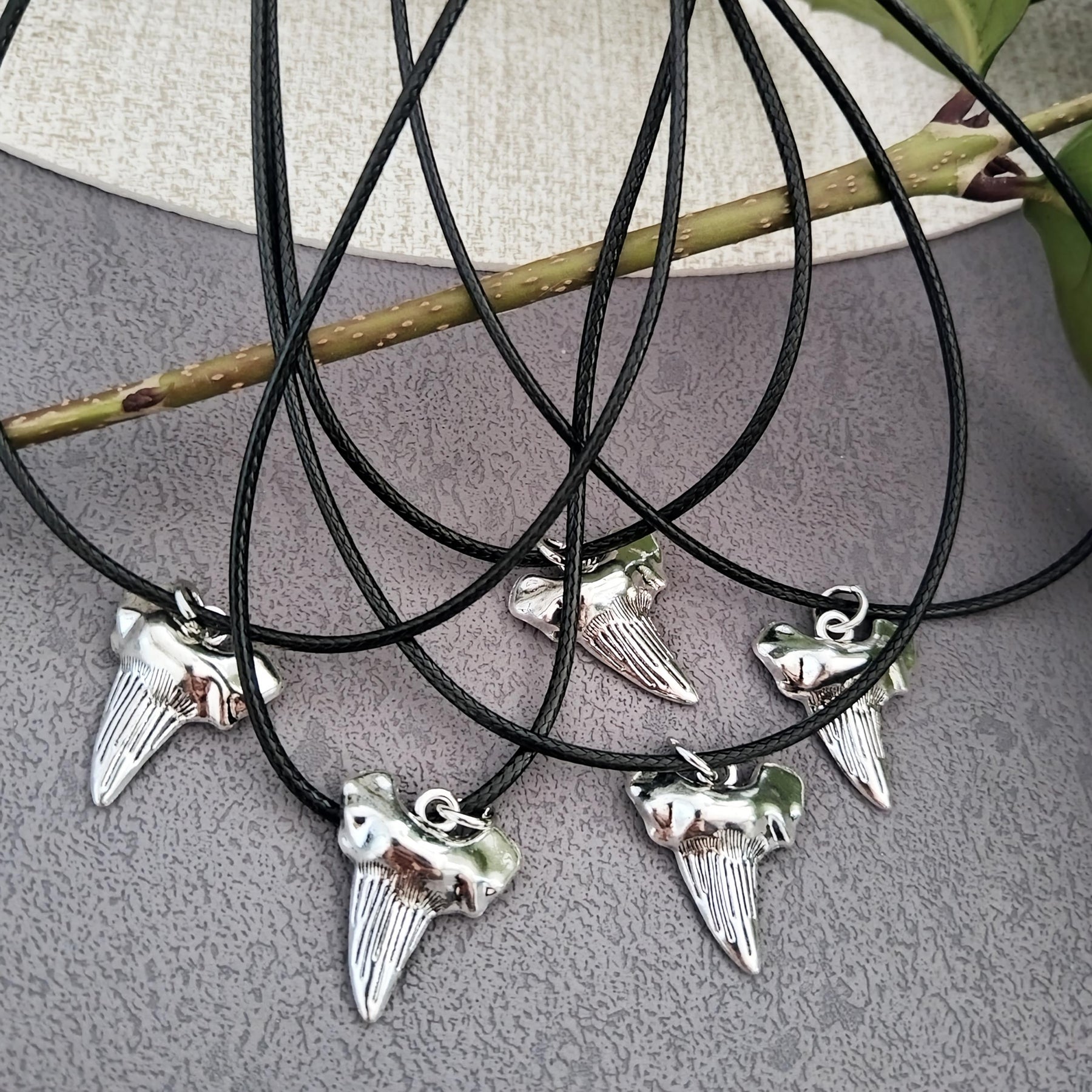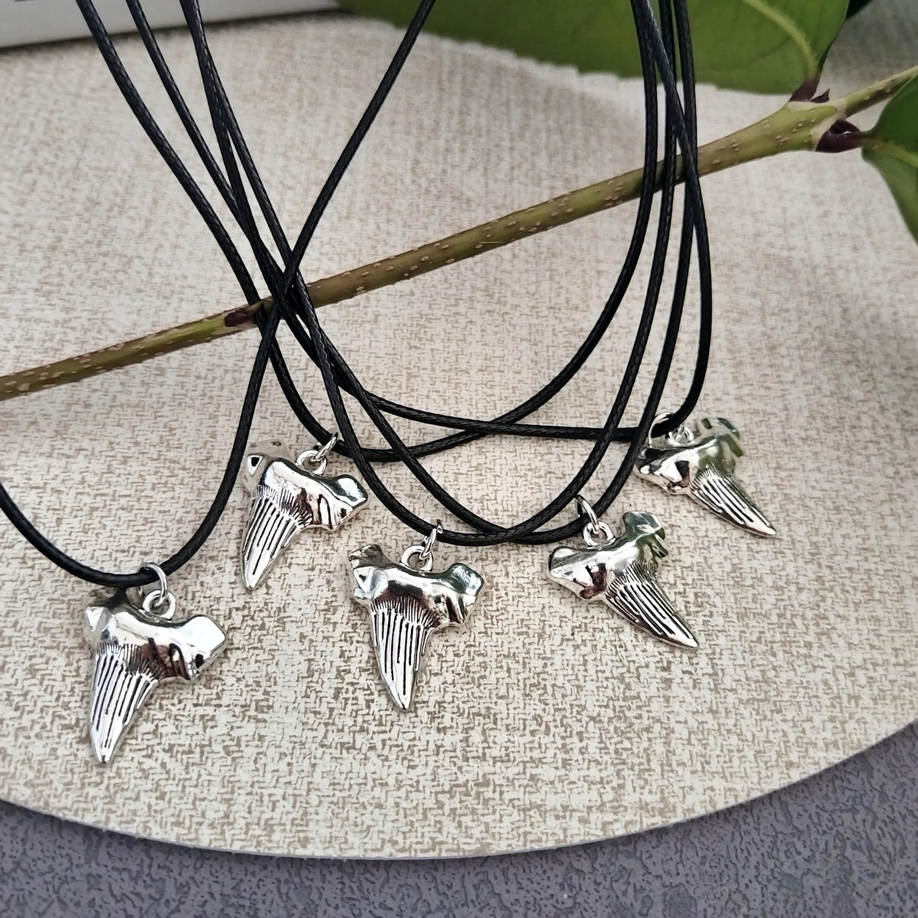 Vintage nautical-inspired necklace set with shark tooth pendants. Made from polyester and leather cords, suitable for daily wear and special occasions.