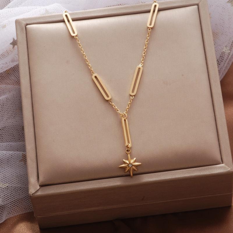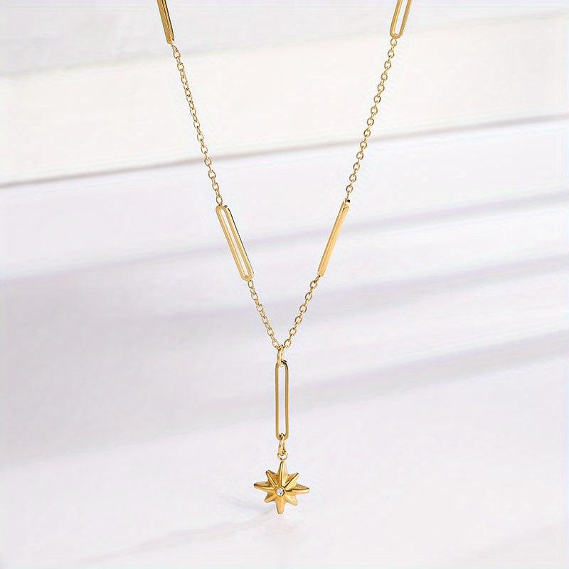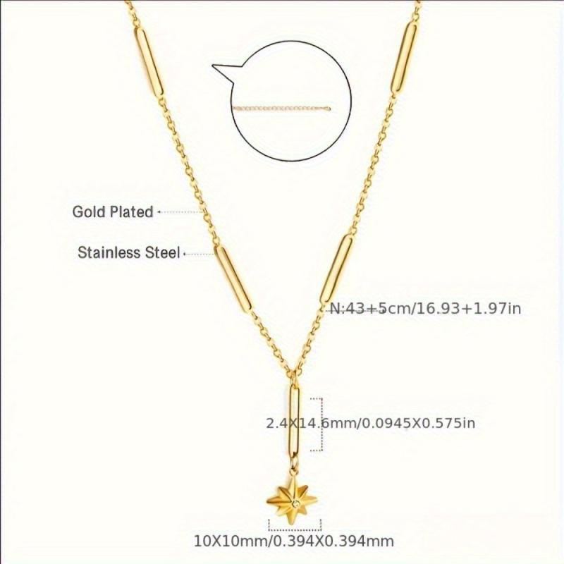 This necklace features a beautiful eight-pointed star pendant made of 18K gold plated stainless steel. The delicate chain adds a modern touch to this versatile piece, perfect for everyday wear or formal occasions.