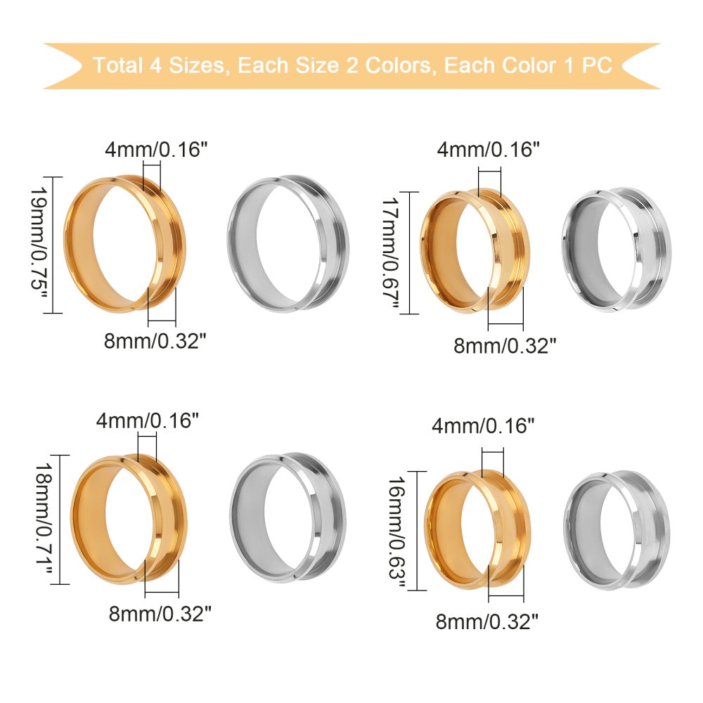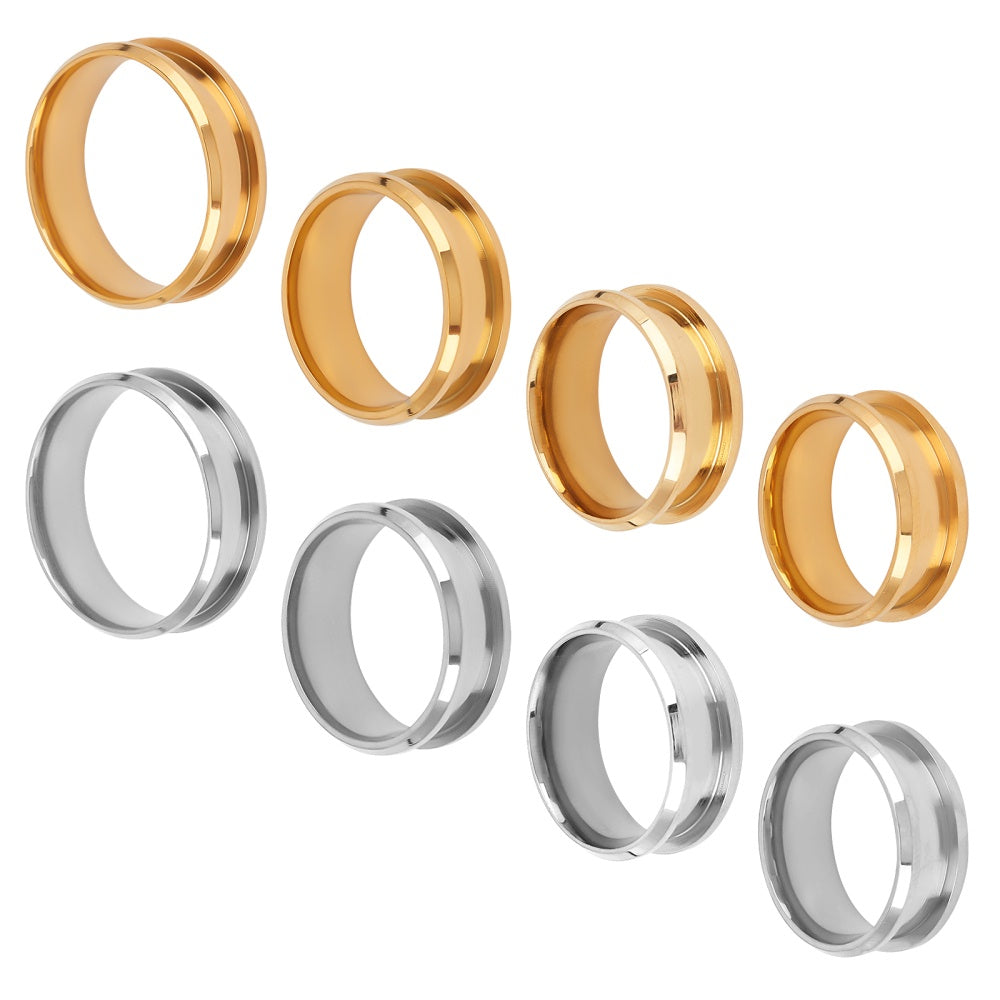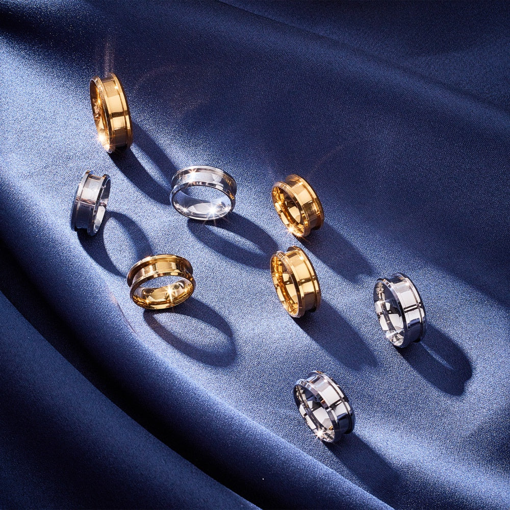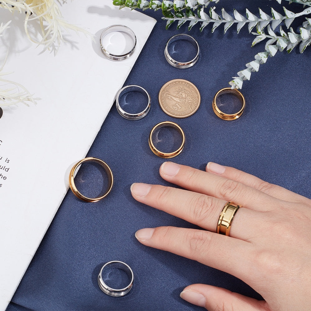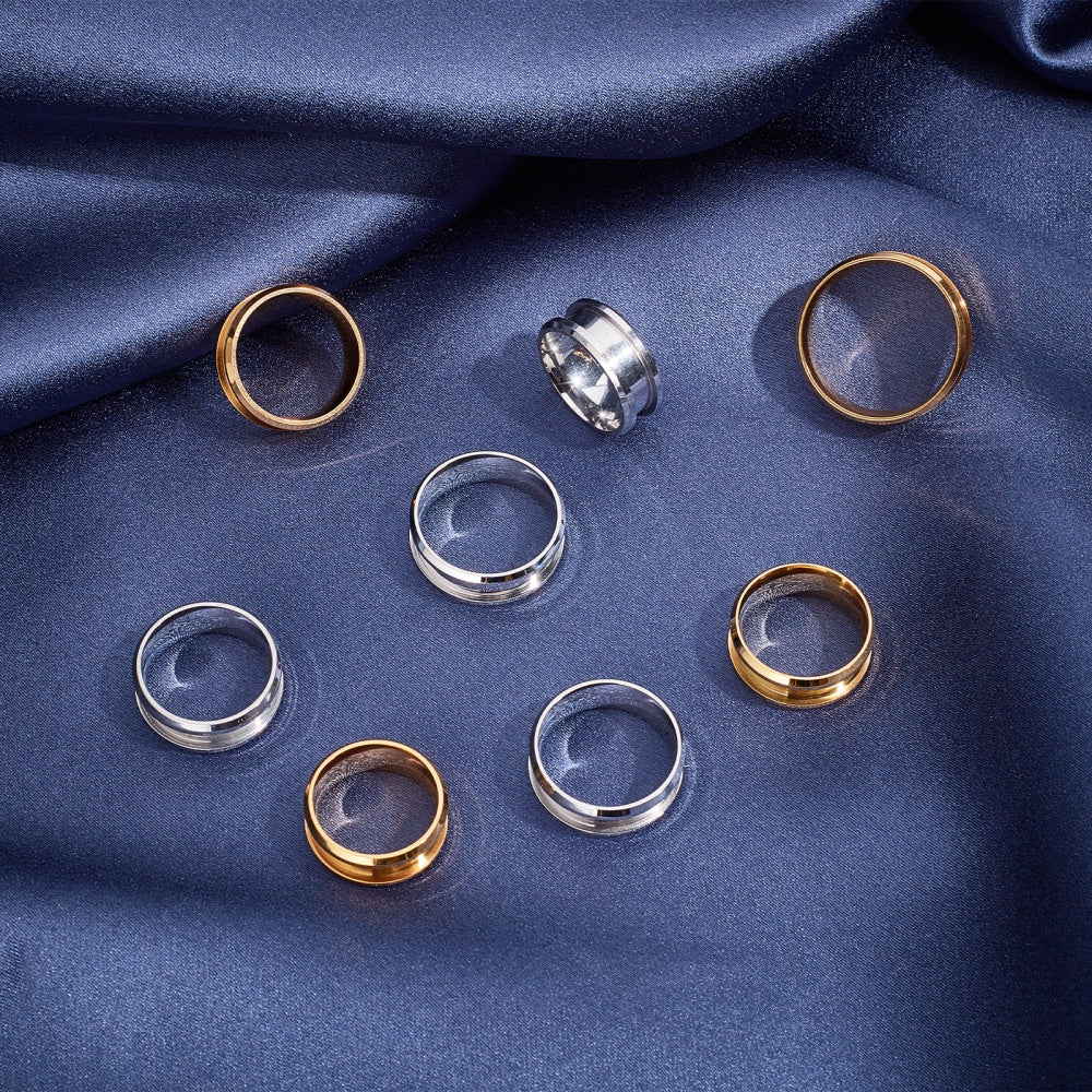 This set includes 8 different styles of stainless steel grooved finger ring settings for inlay ring DIY projects. The rings are golden and stainless steel, making them versatile for various jewelry designs.