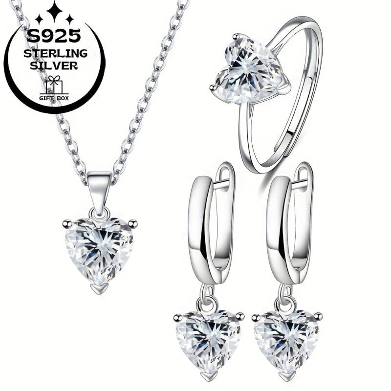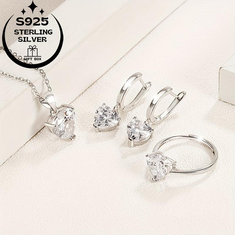 Complete your look with this elegant jewelry set featuring a 925 sterling silver pendant adorned with heart-shaped synthetic zirconia. The set includes a necklace, ring, and earrings, making it the perfect accessory for any outfit.