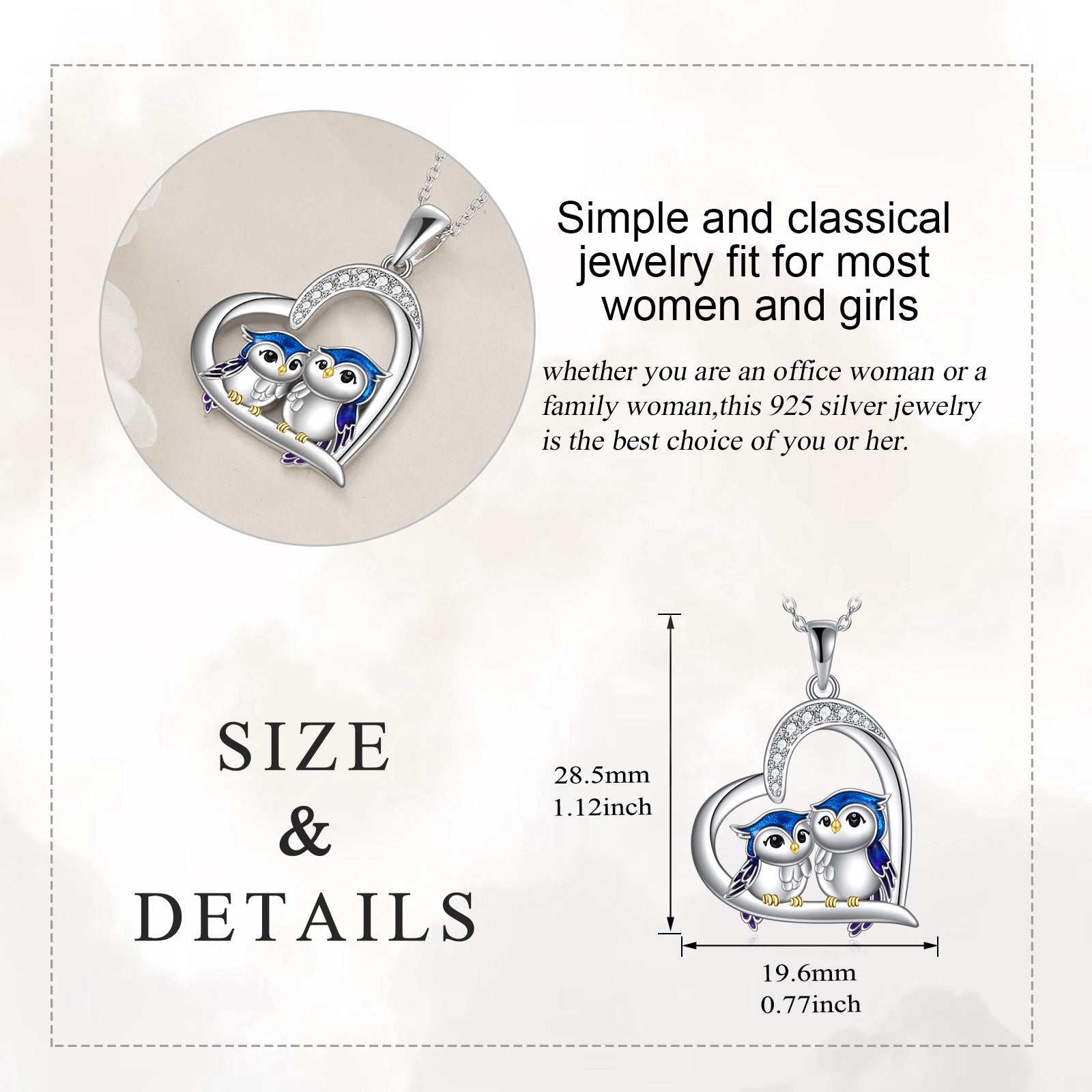 This stunning owl necklace is made of 925 sterling silver with synthetic zirconia stones. It is adjustable and lightweight, making it a perfect gift for both women and men.