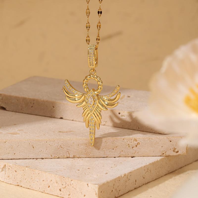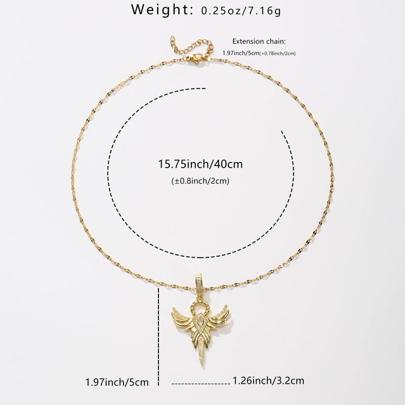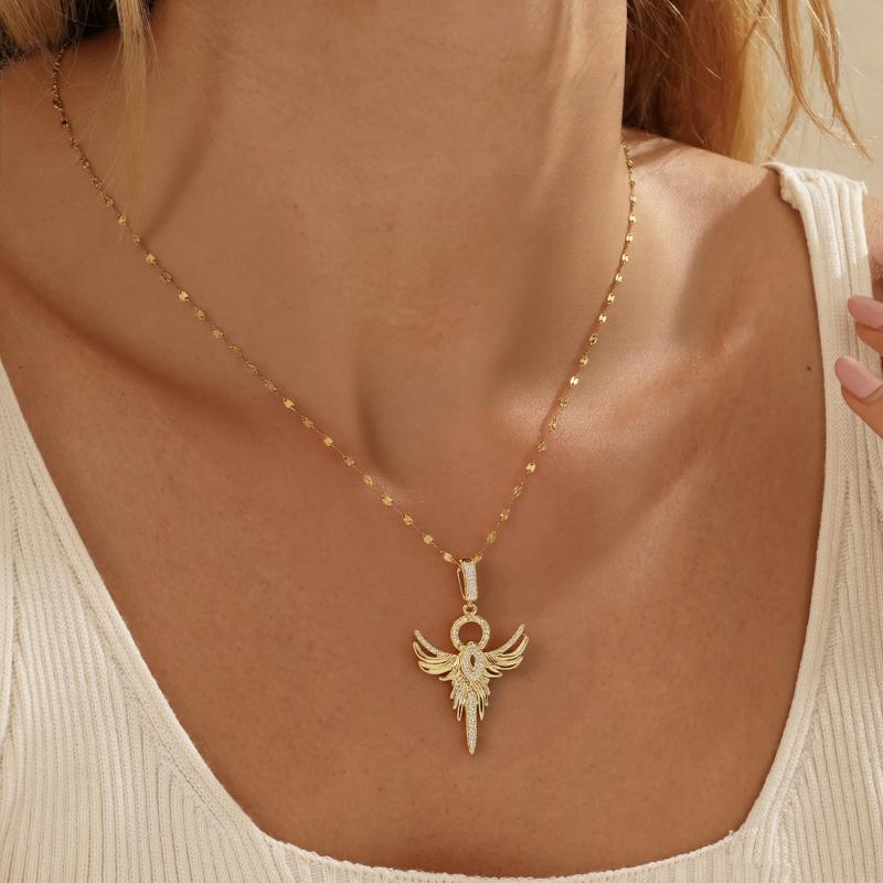 Elegant necklace with angel wings design, perfect for daily wear and vacations. Made of low-allergy stainless steel with synthetic zirconia stone for added sparkle.