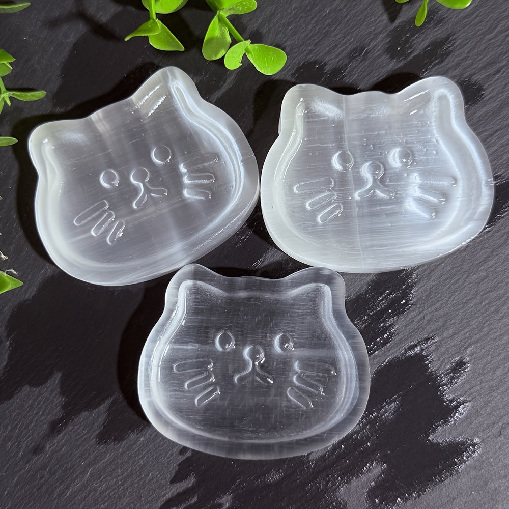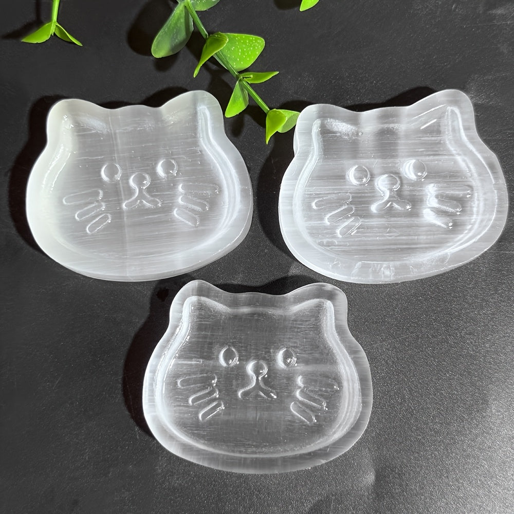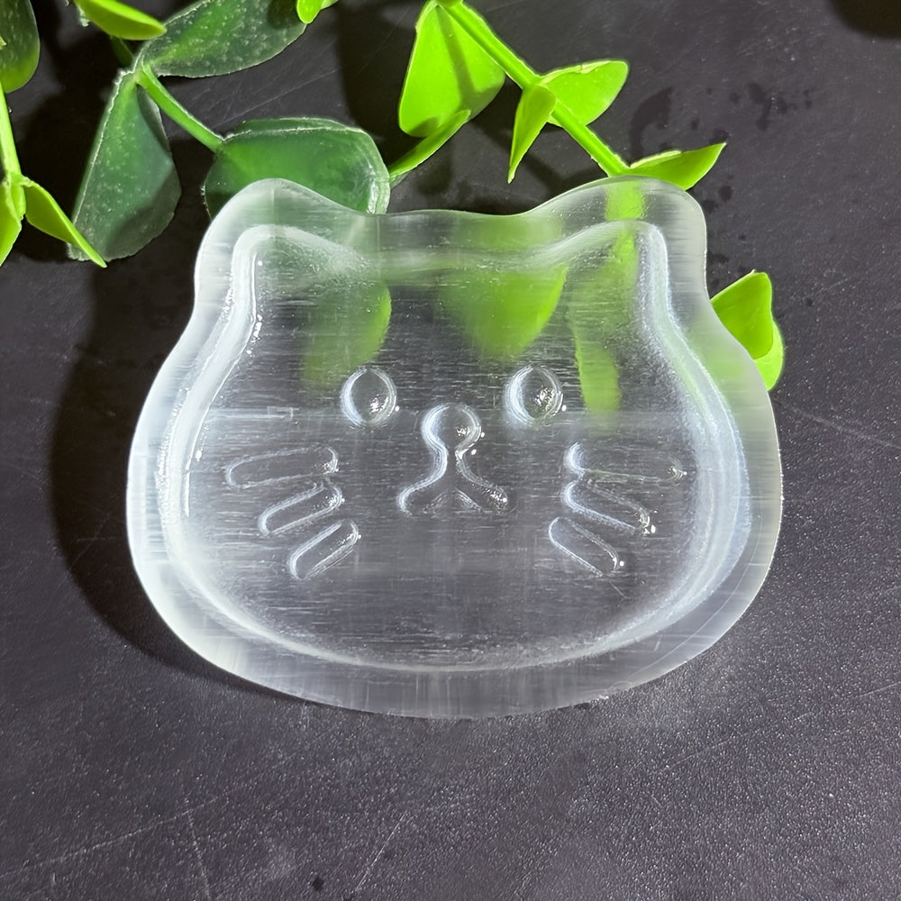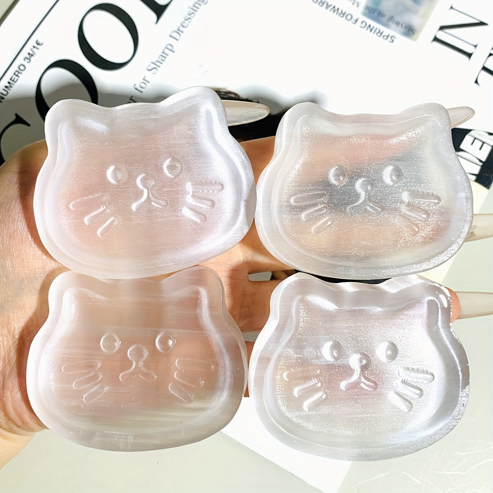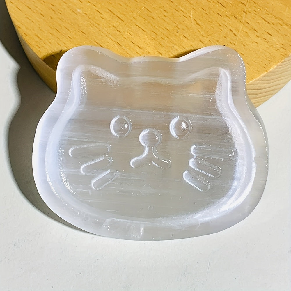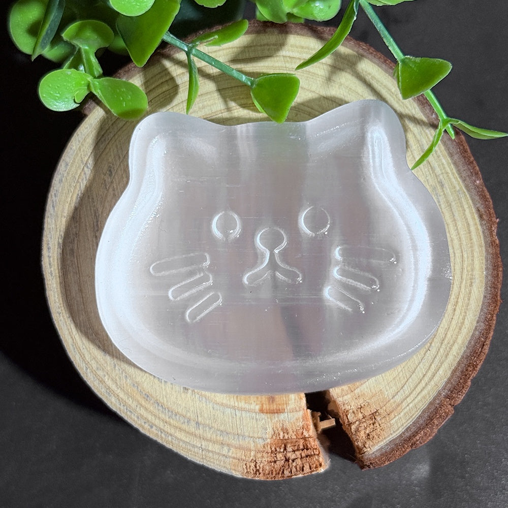 Elegant selenite cat bowl with a random cat face design that is both decorative and functional. Made from high-quality selenite crystal.