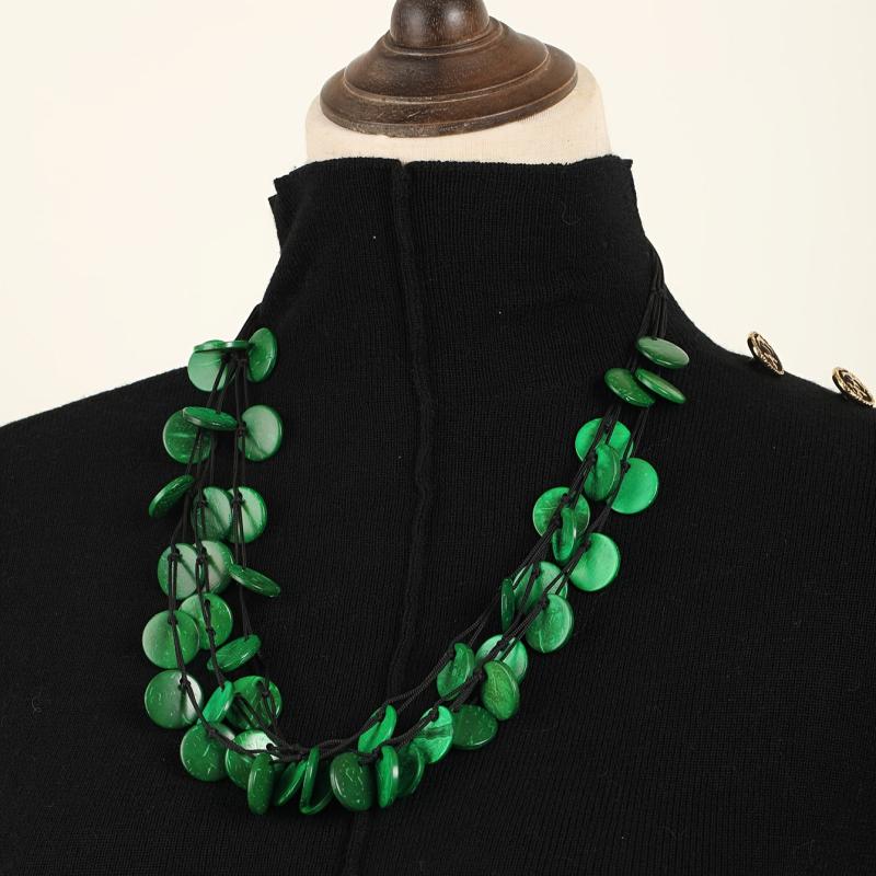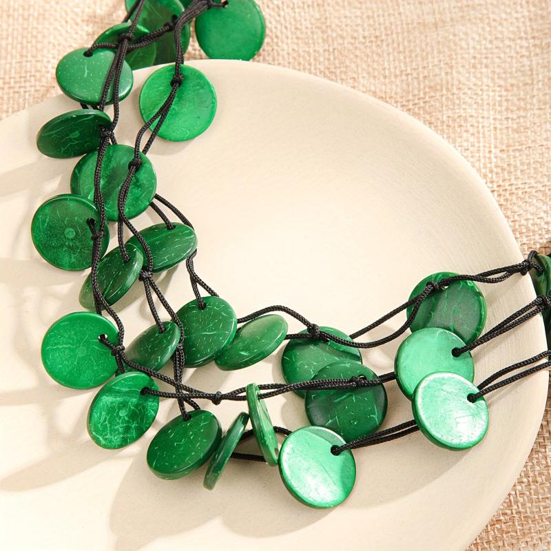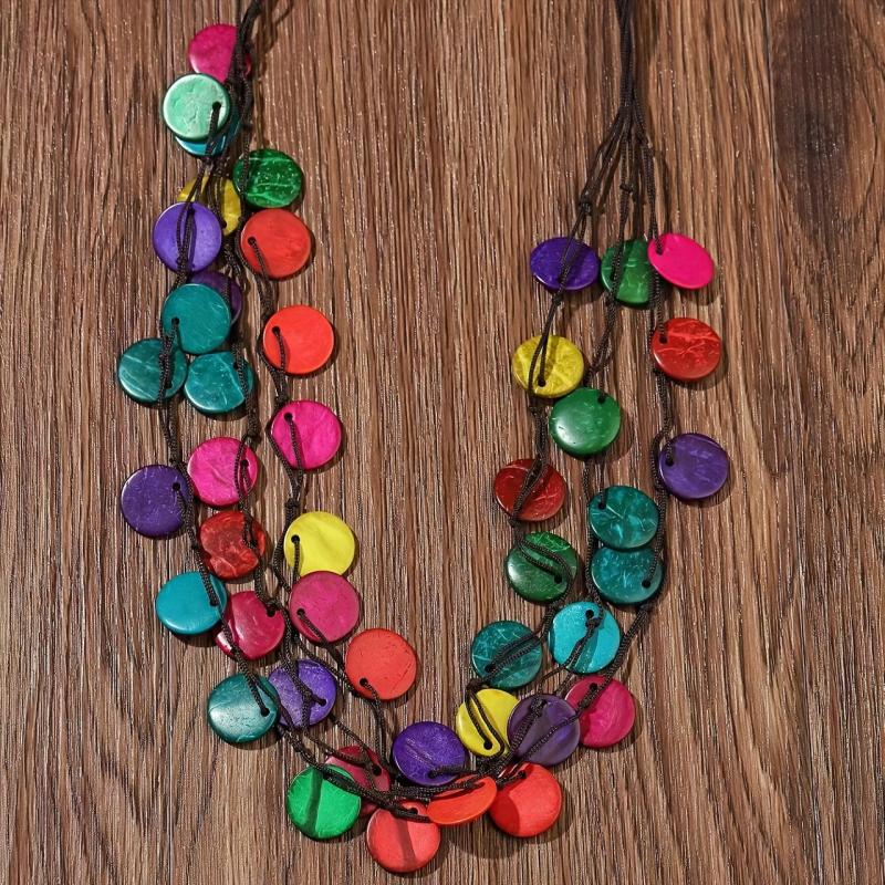 Elevate your casual attire with this Bohemian layer necklace featuring high recycled wood beads in golden yellow and accents on an adjustable brown cord. A perfect gift idea!