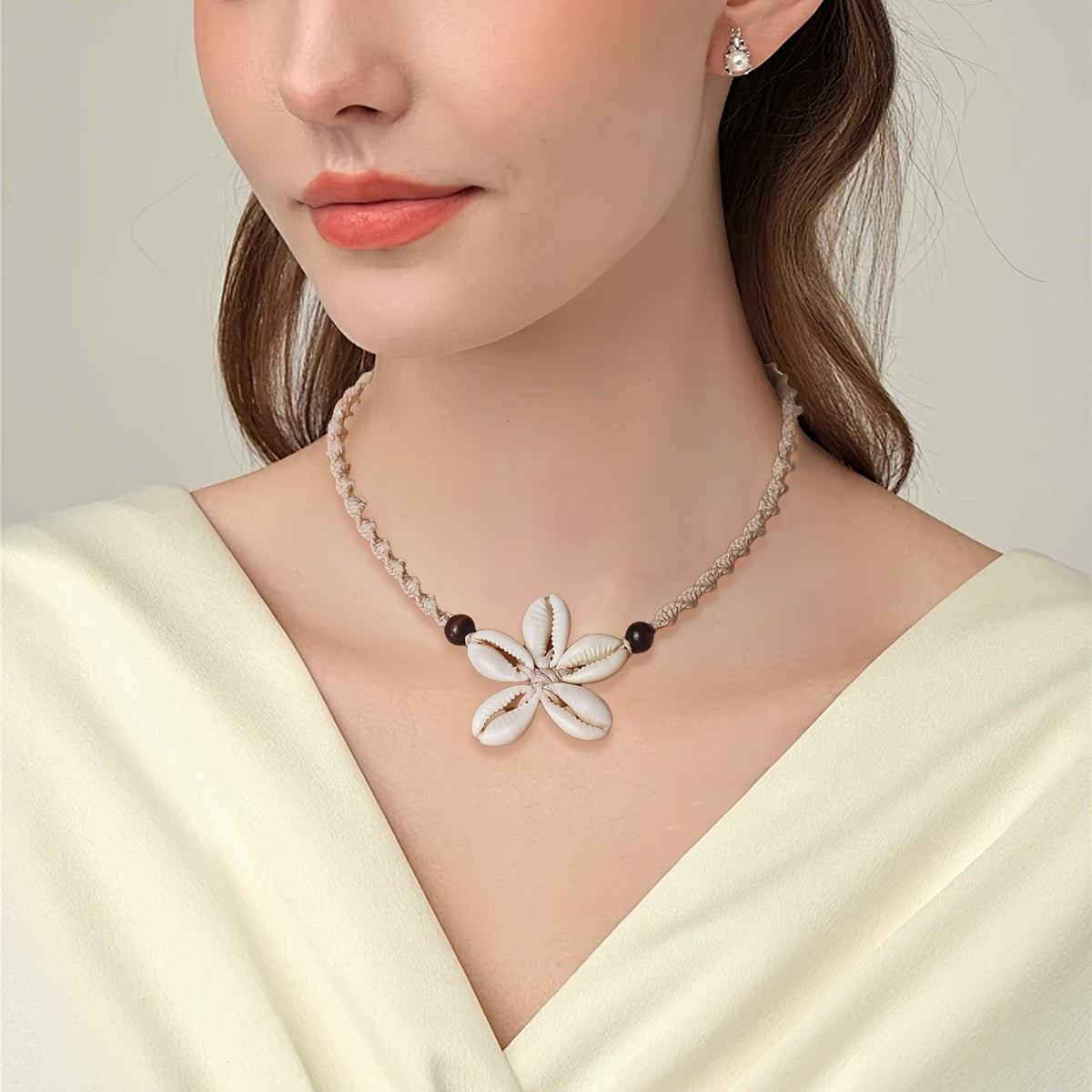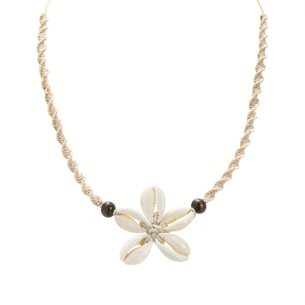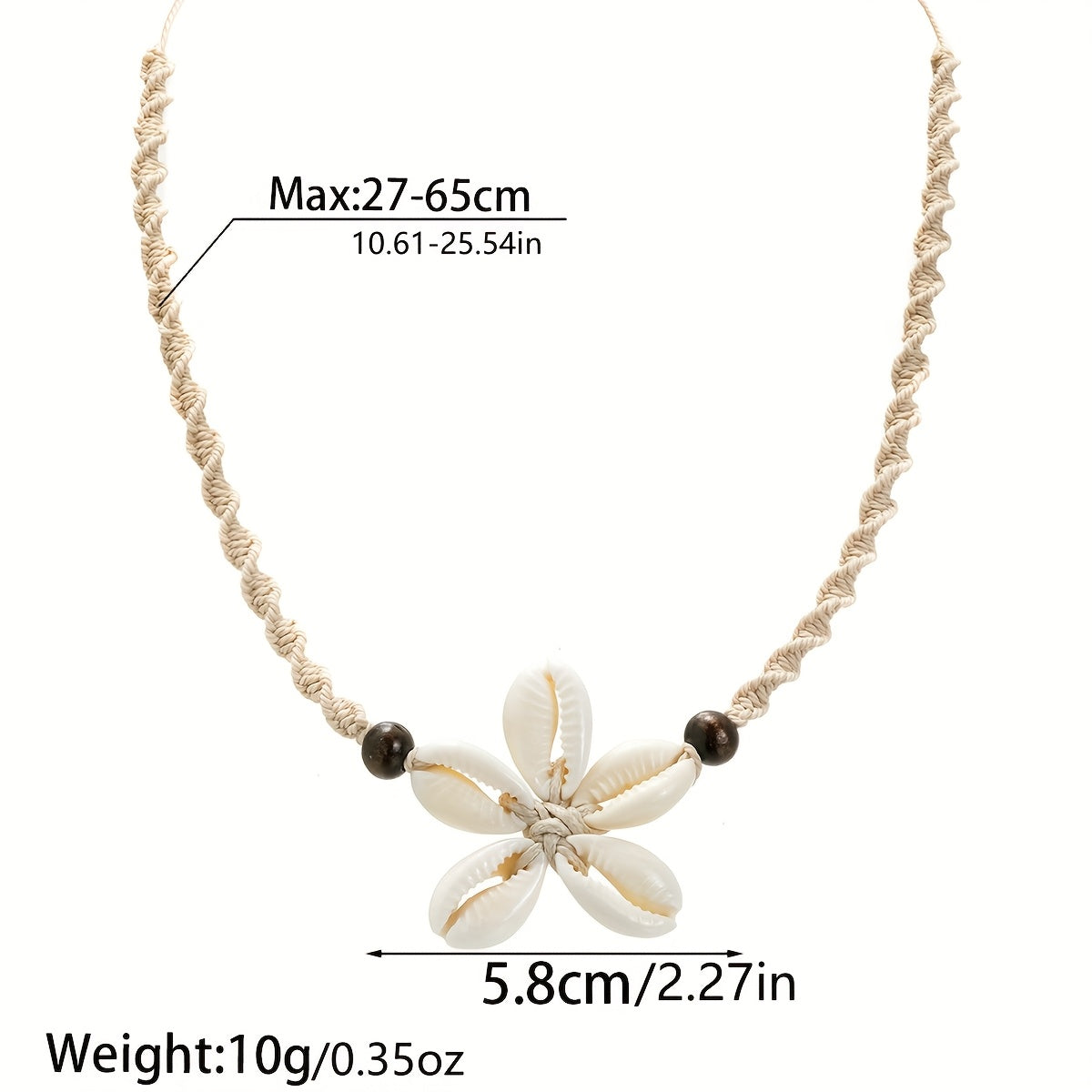 Adjustable necklace with woven shell flower pendant and bead accents. Lightweight beach jewelry for women, perfect for everyday wear or as a summer gift. Versatile style that can be worn year-round.