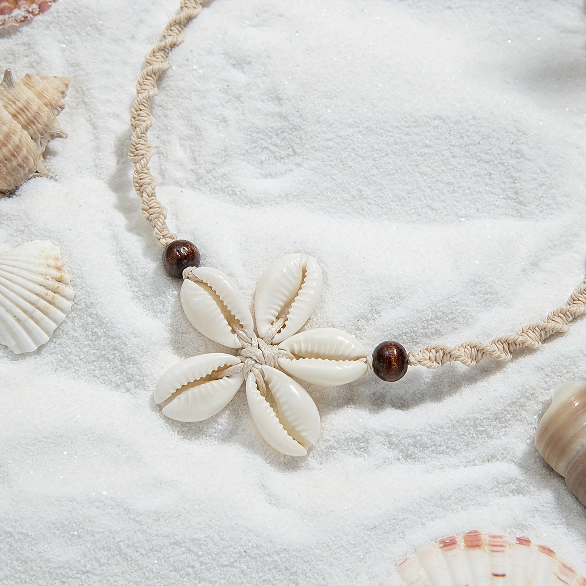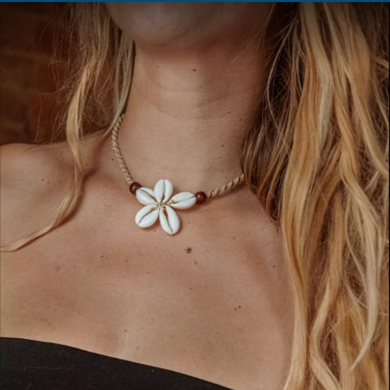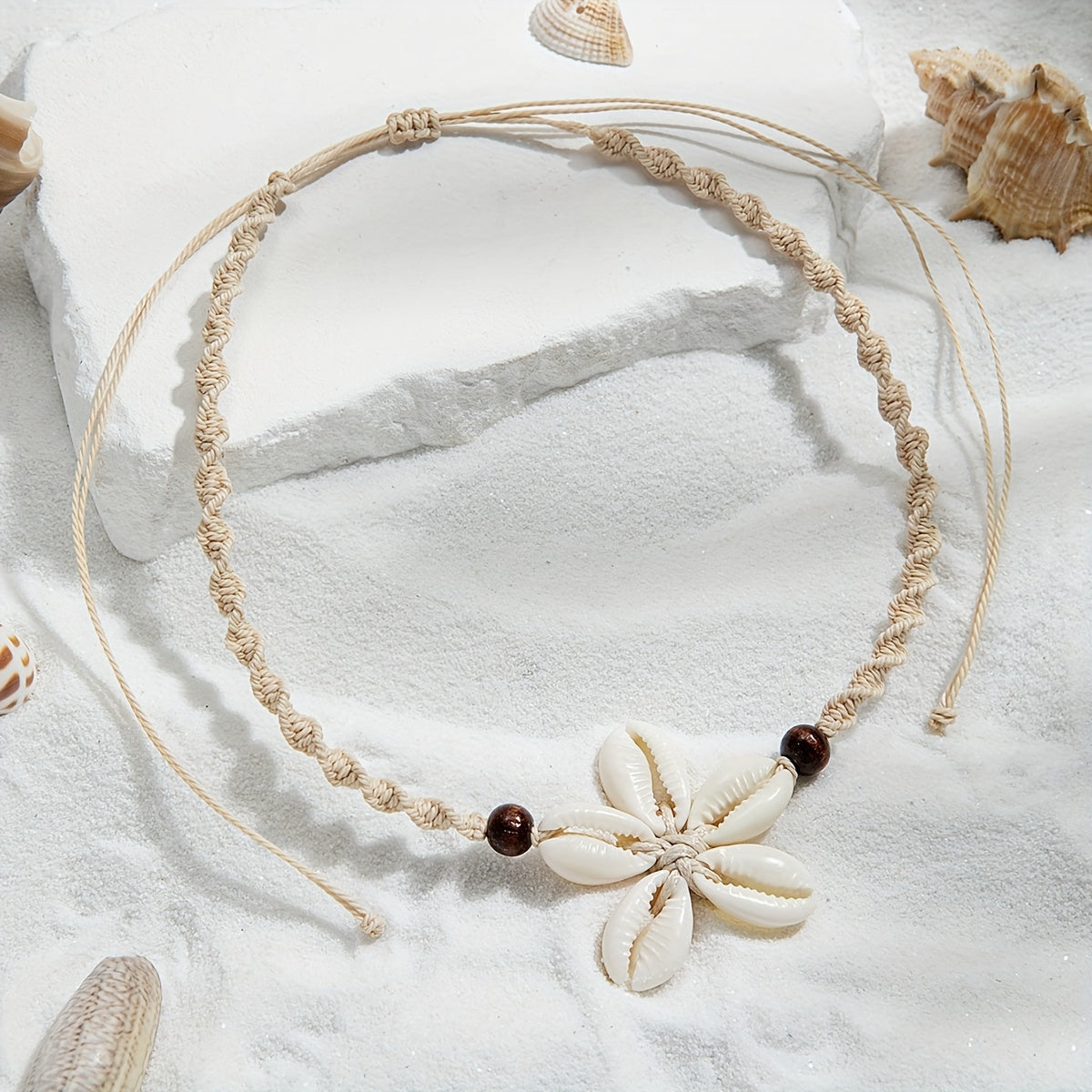 Adjustable necklace with woven shell flower pendant and bead accents. Lightweight beach jewelry for women, perfect for everyday wear or as a summer gift. Versatile style that can be worn year-round.