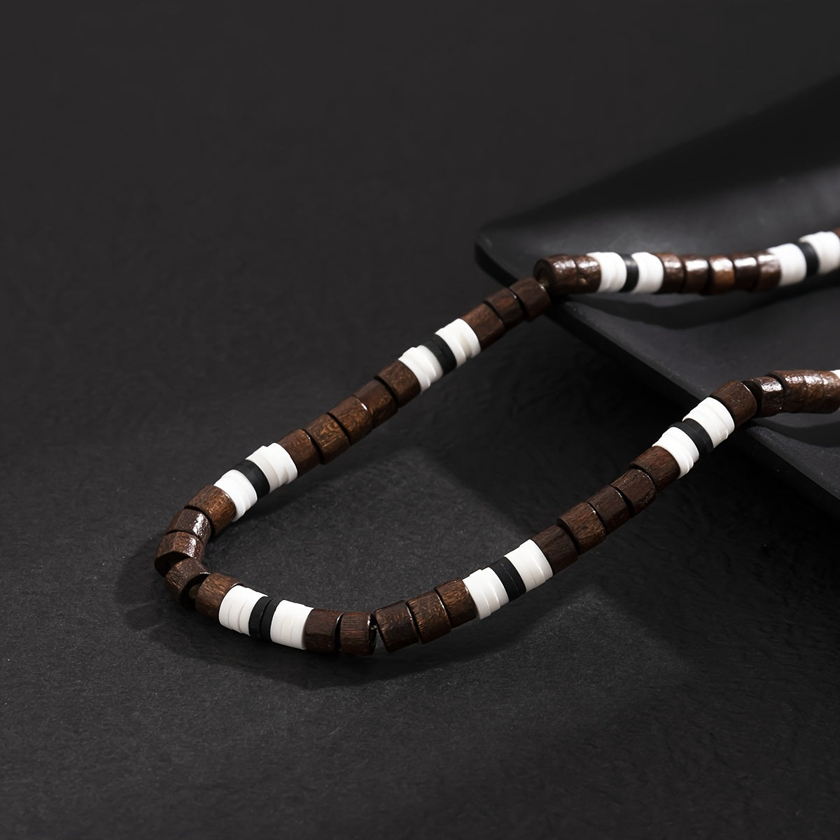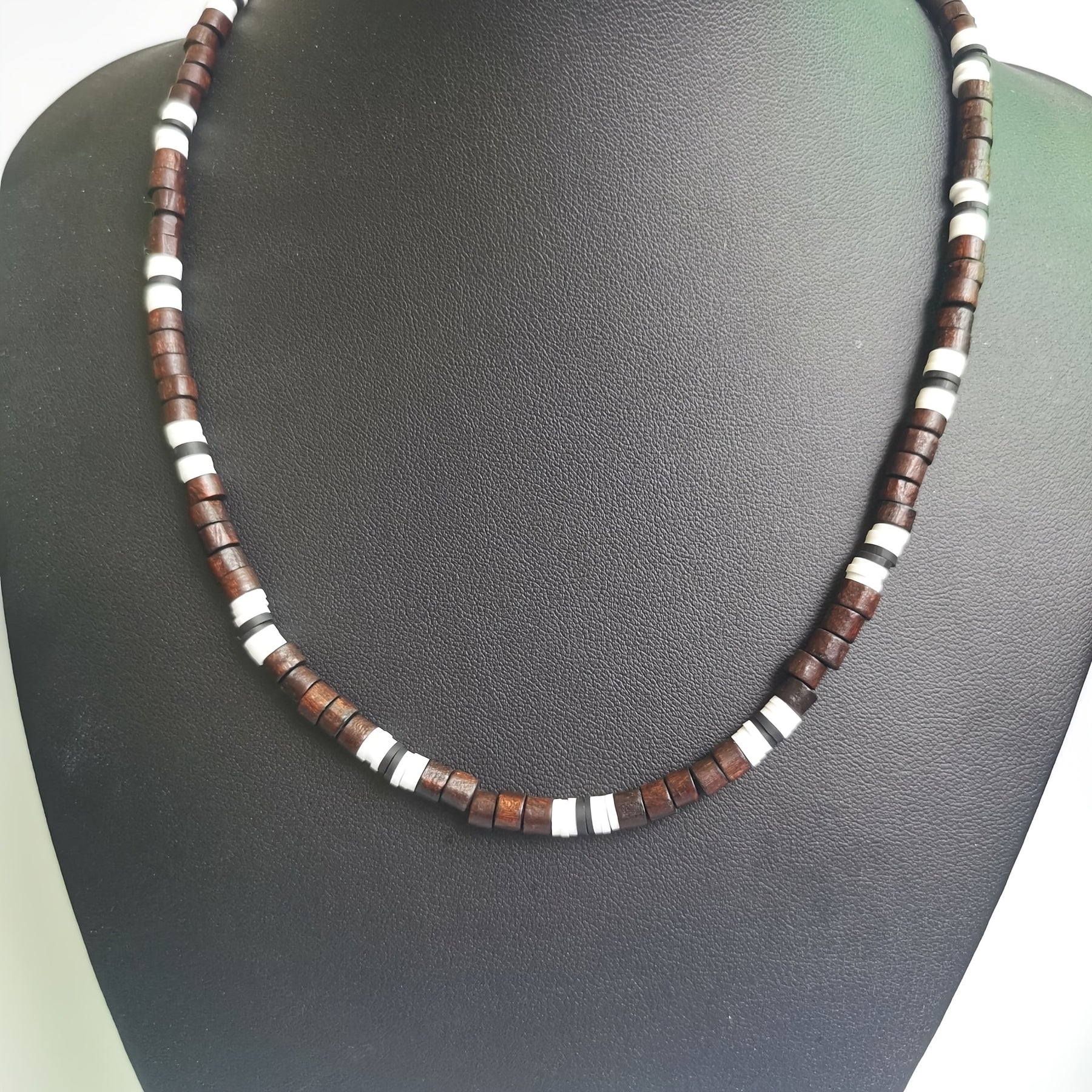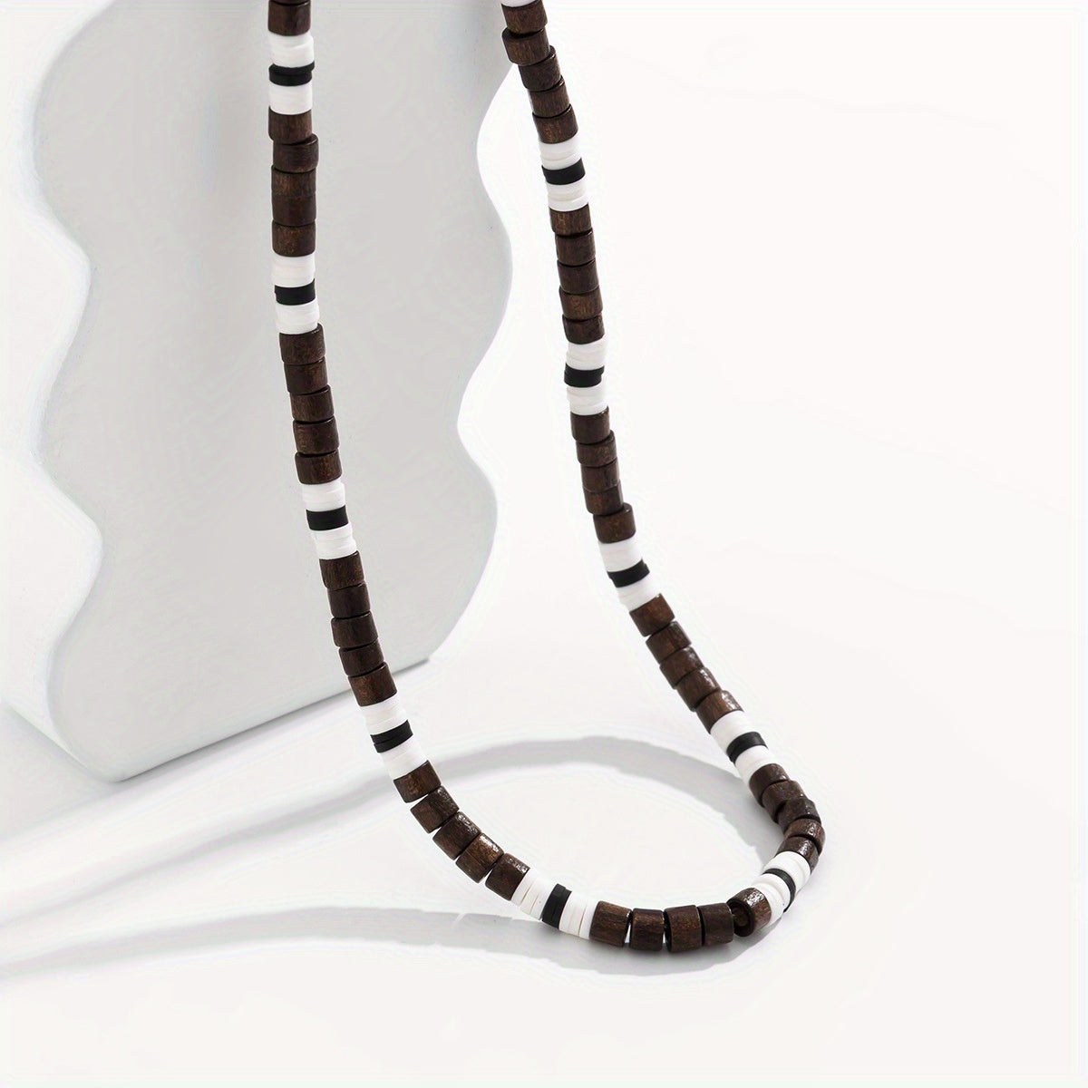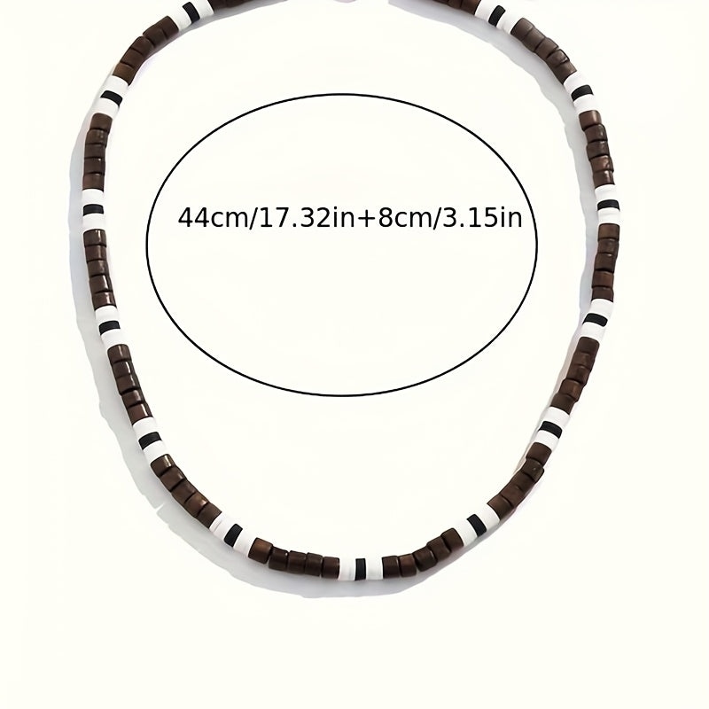This bohemian wood bead necklace features striped accents, making it a versatile accessory for both women and men. Lightweight and perfect for everyday wear or vacation.