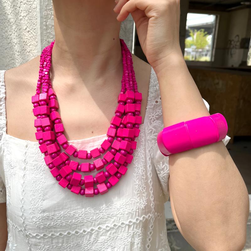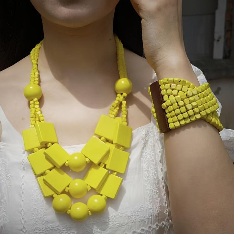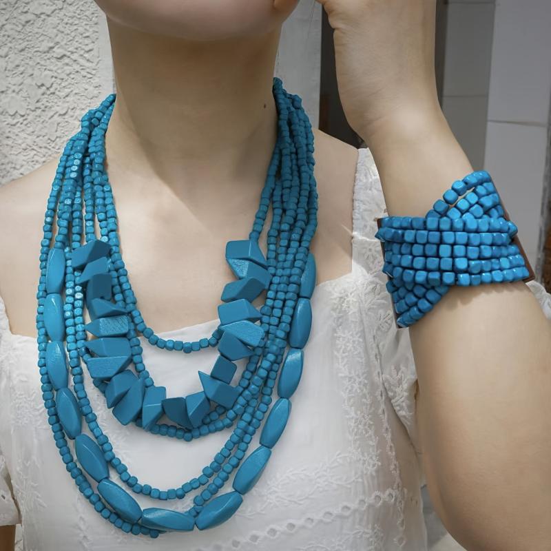 Elevate your style with this Bohemian layered wooden necklace and bracelet set. Perfect for adding a touch of nature-inspired charm to your outfit.