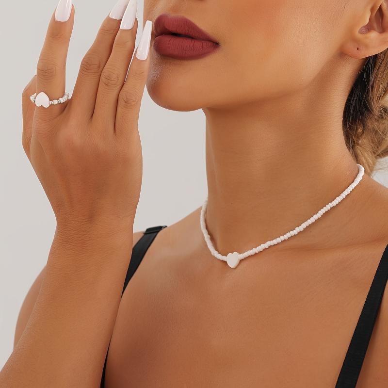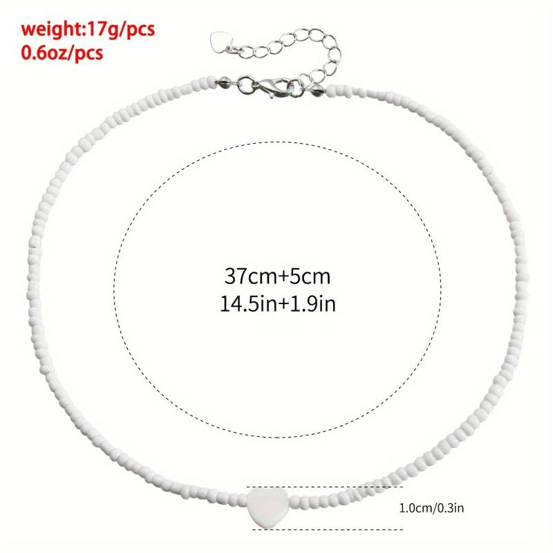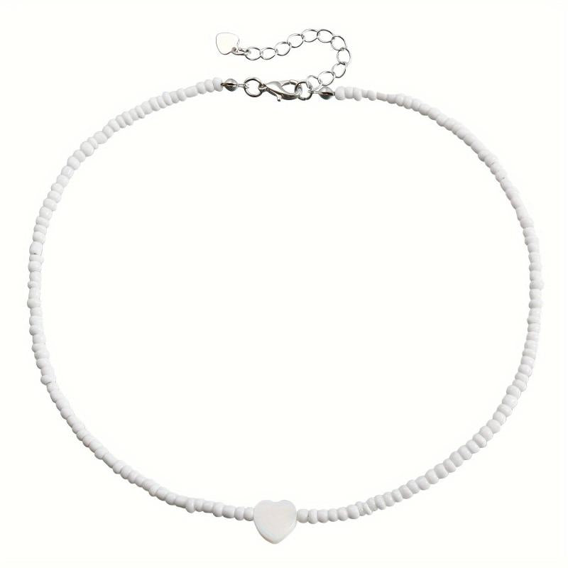 Elegant bohemian necklace featuring rice bead chain with heart-shaped mother of pearl pendant. Perfect for daily wear or as a gift for a loved one.