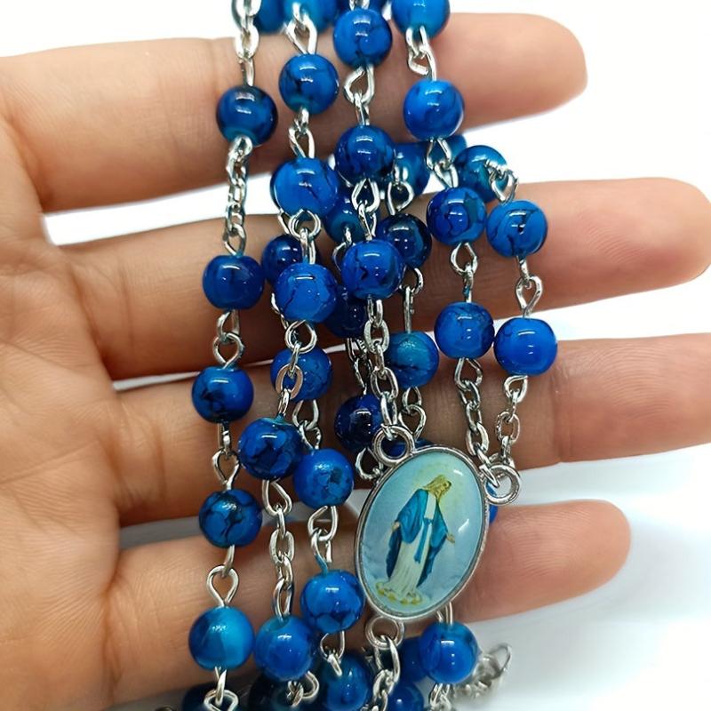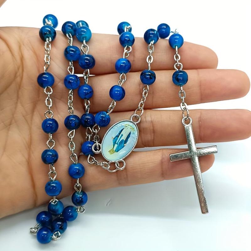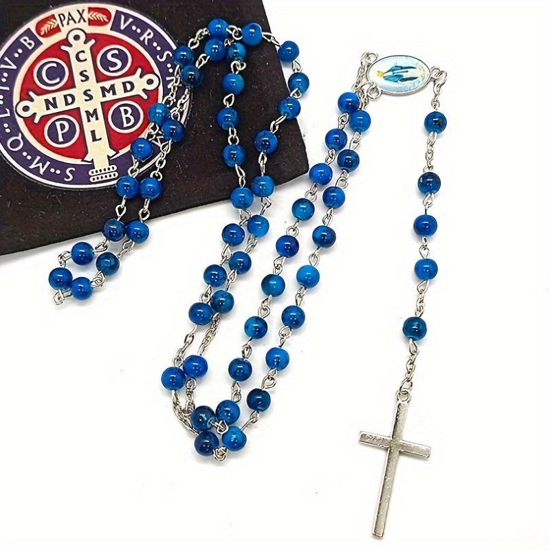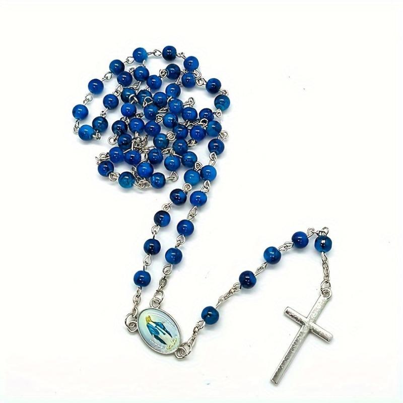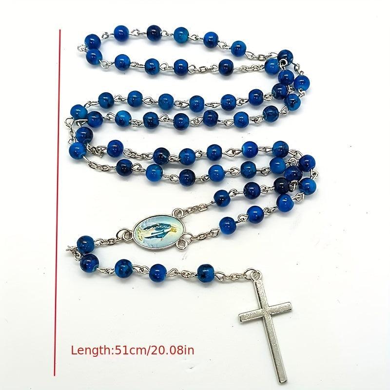 This boho rosary necklace features 6mm resin beads and a silver cross pendant, perfect for daily wear and spiritual expression. It makes a great gift for any season.