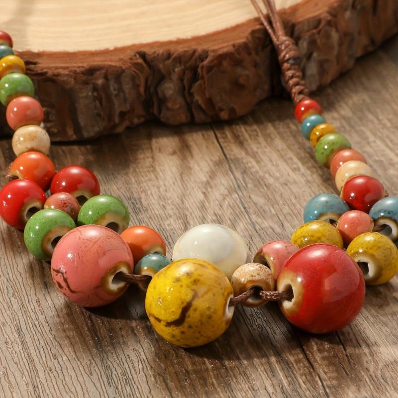 Elevate your style with this bohemian ceramic bead necklace crafted with a braided cord and multicolor beads. Perfect for vacation, parties, and everyday casual wear.