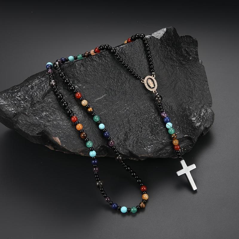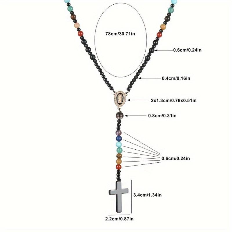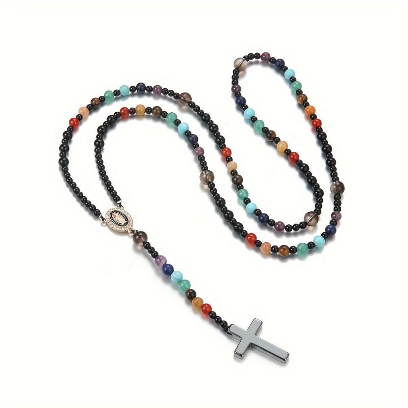 Enhance your style with this bohemian chakra beaded necklace featuring a cross pendant. It is a colorful and unique accessory suitable for both men and women. The necklace is made of natural stones and designed to be a long sweater chain.
