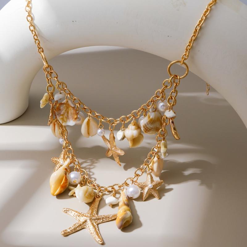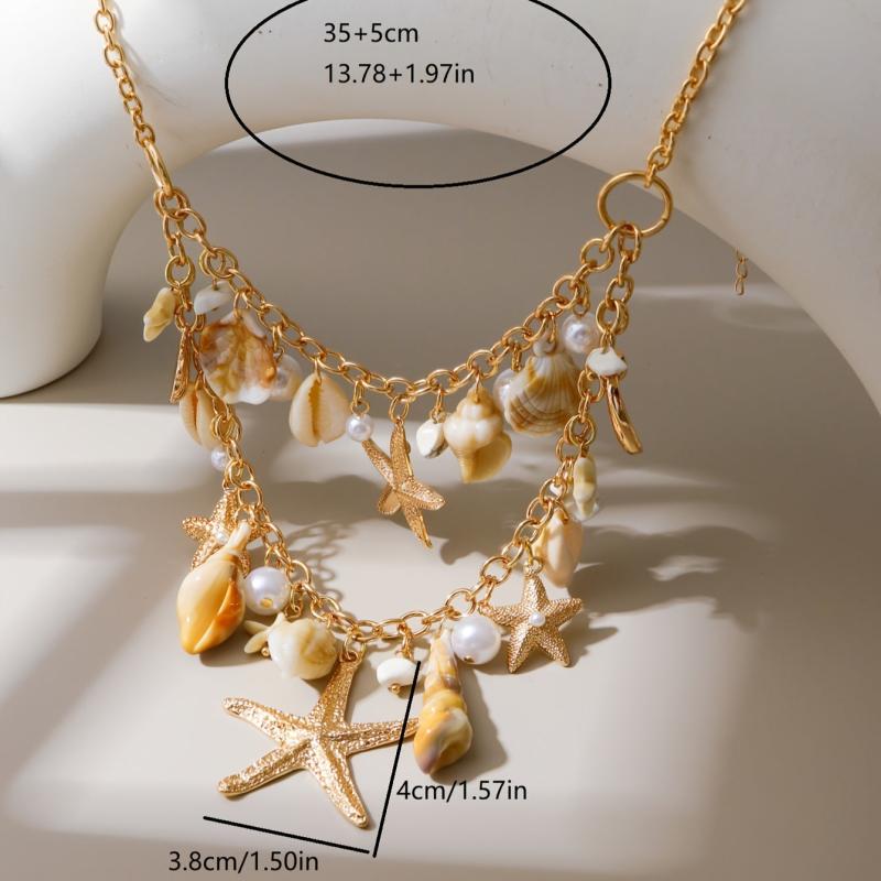 Elevate your summer look with this bohemian double layer necklace featuring starfish, seashell, and pendants in a golden tone. Perfect for vacation, parties, or casual attire.