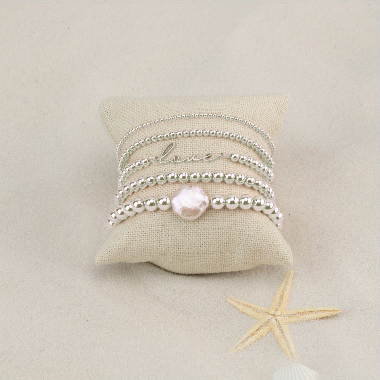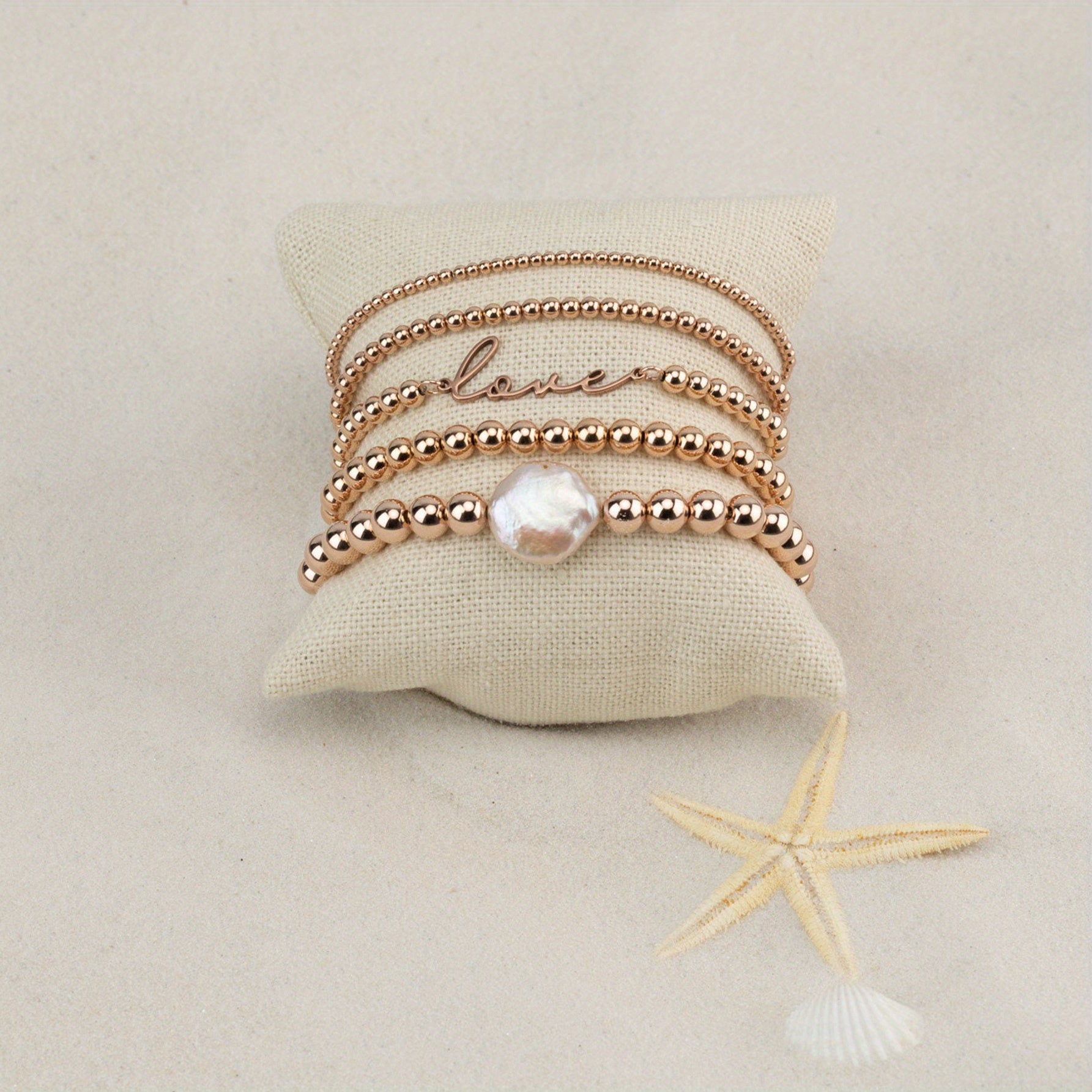 Enhance your style with this 5-piece set of boho ethnic style bracelets featuring love symbols and baroque faux pearls. The perfect accessory for girls.