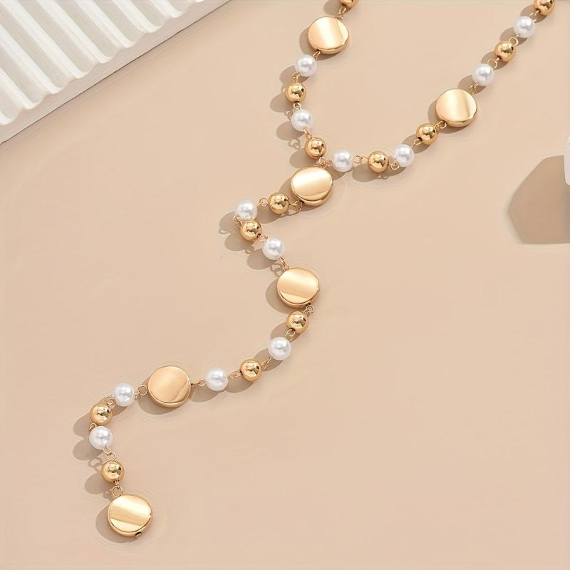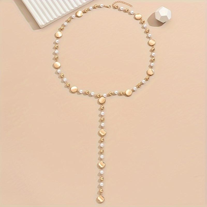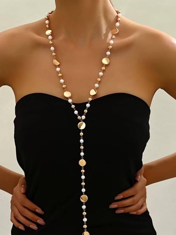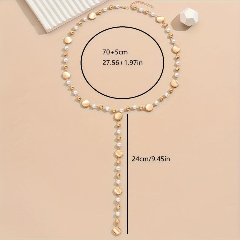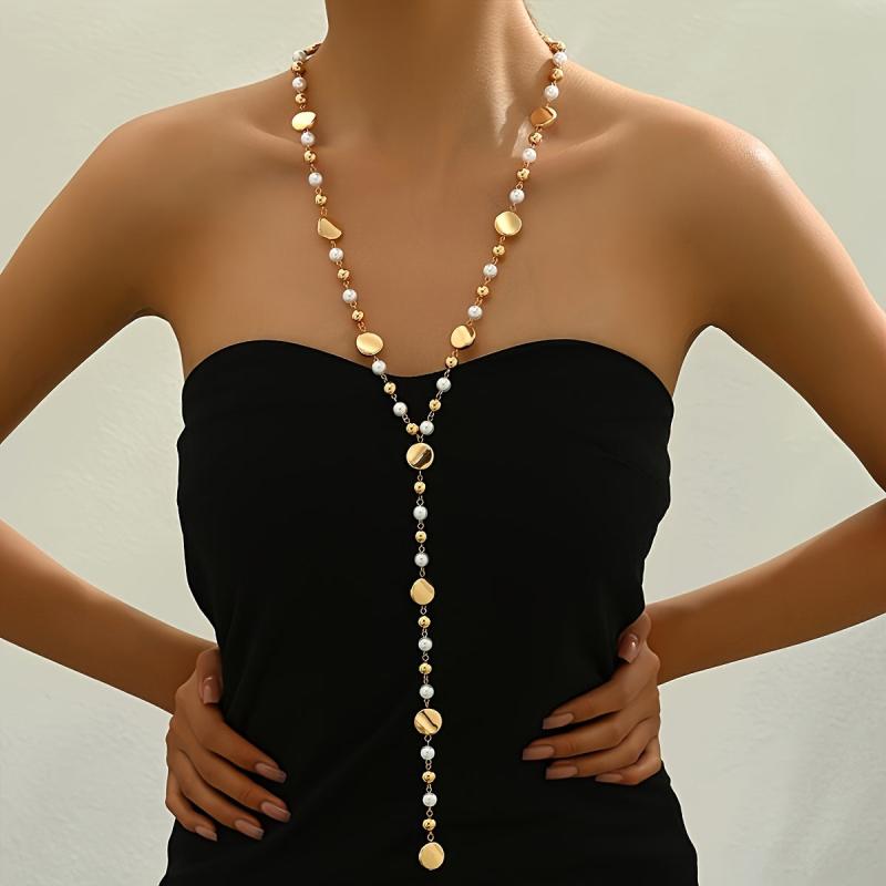 Add a touch of bohemian flair to your outfit with this long Y shape sweater necklace featuring faux and golden tone geometric beads. Ideal for daily wear, parties, and evening events.