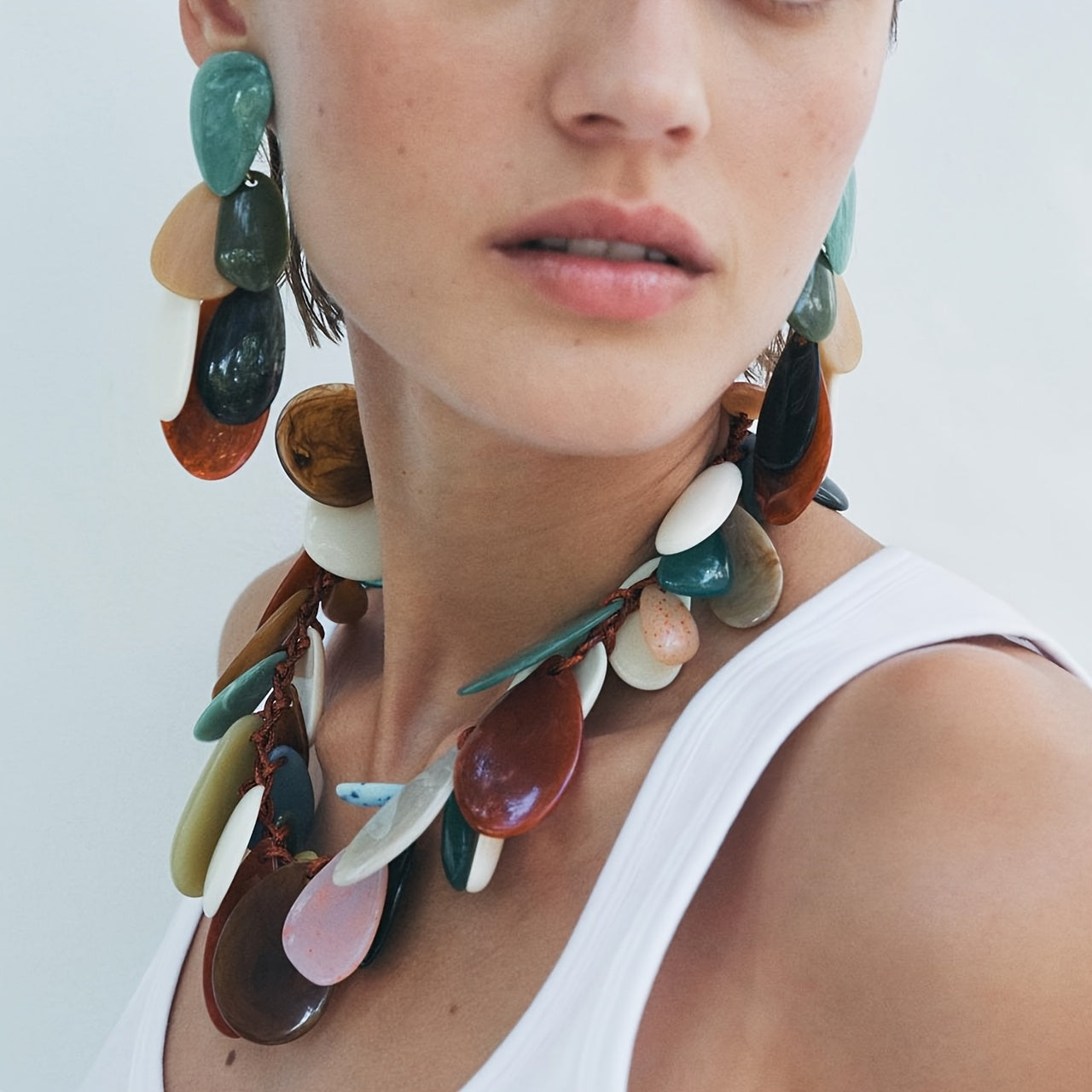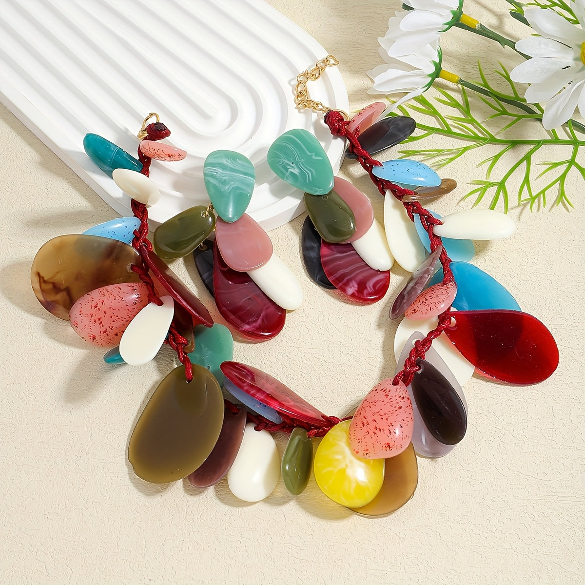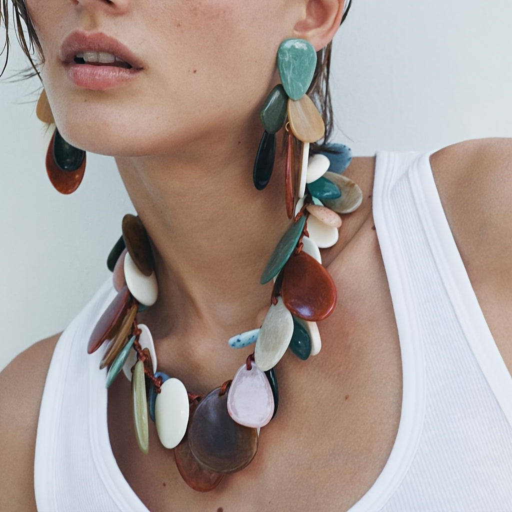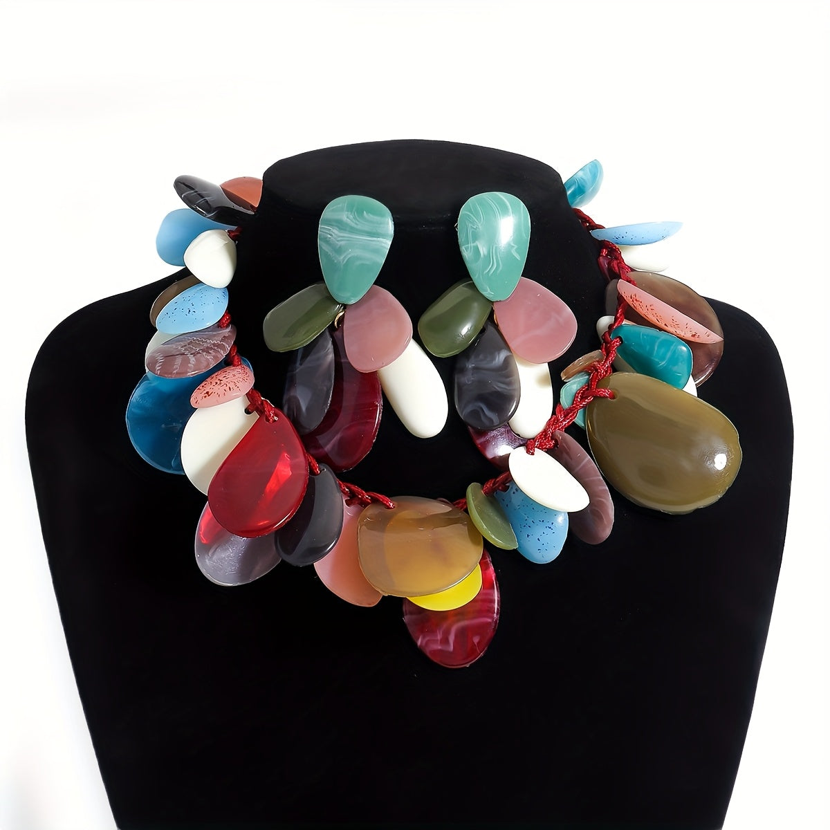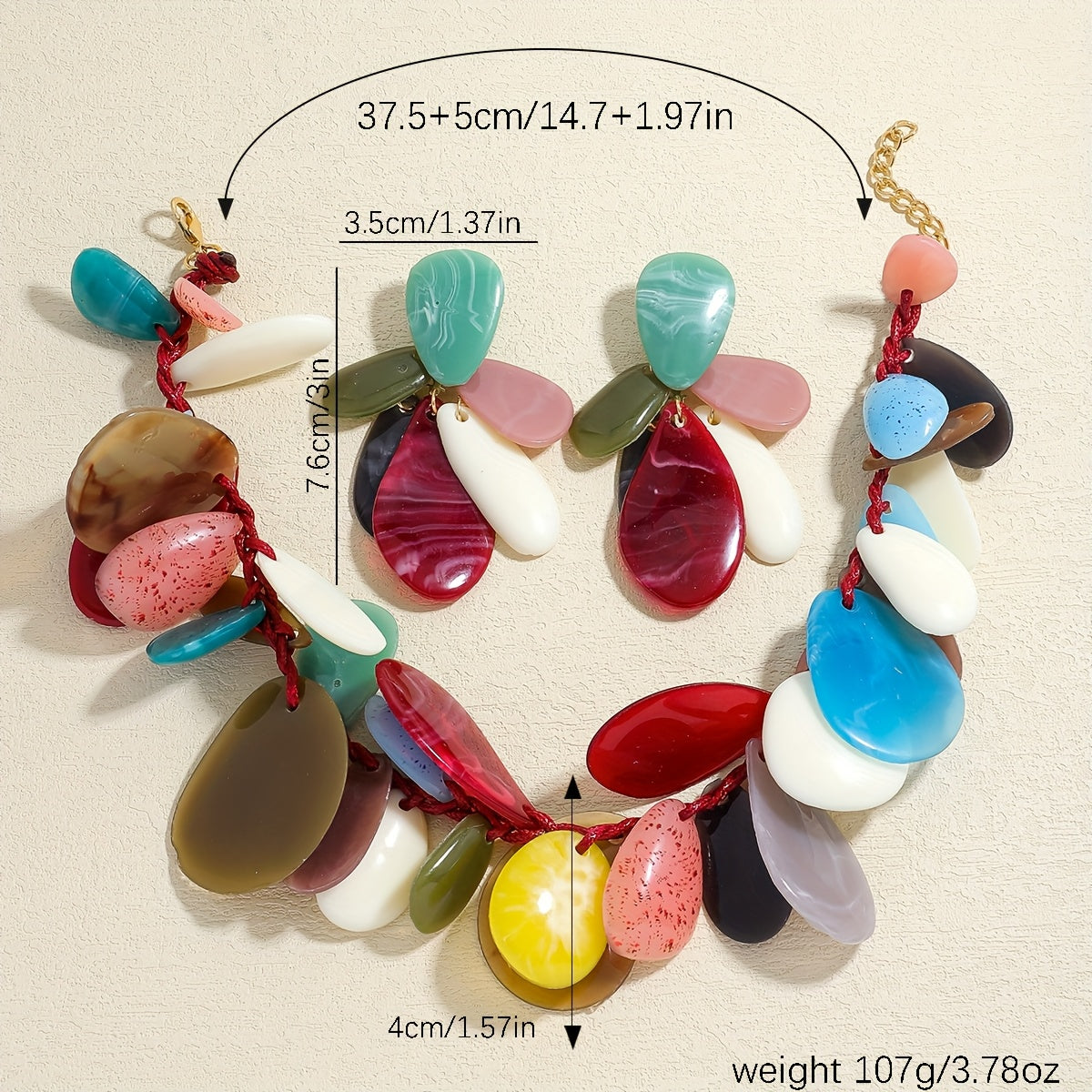 Add a splash of color to your look with this vibrant bohemian resin earrings and necklace set. Perfect for daily wear, vacations, or parties.