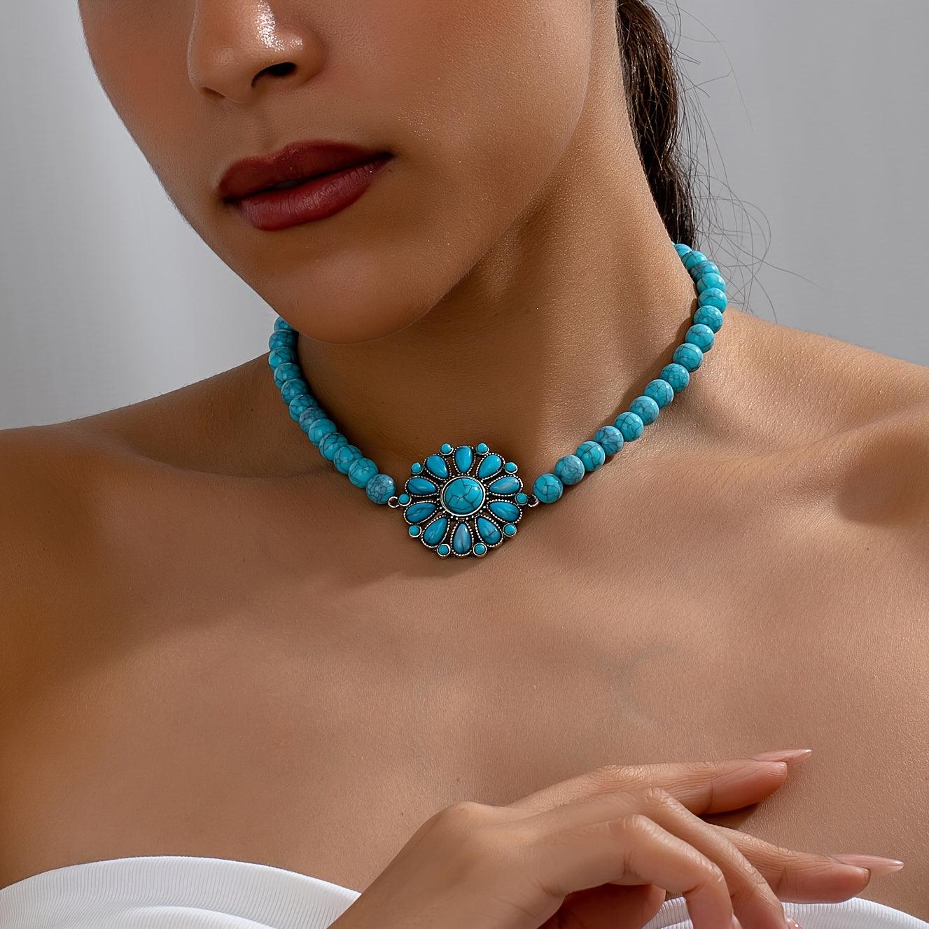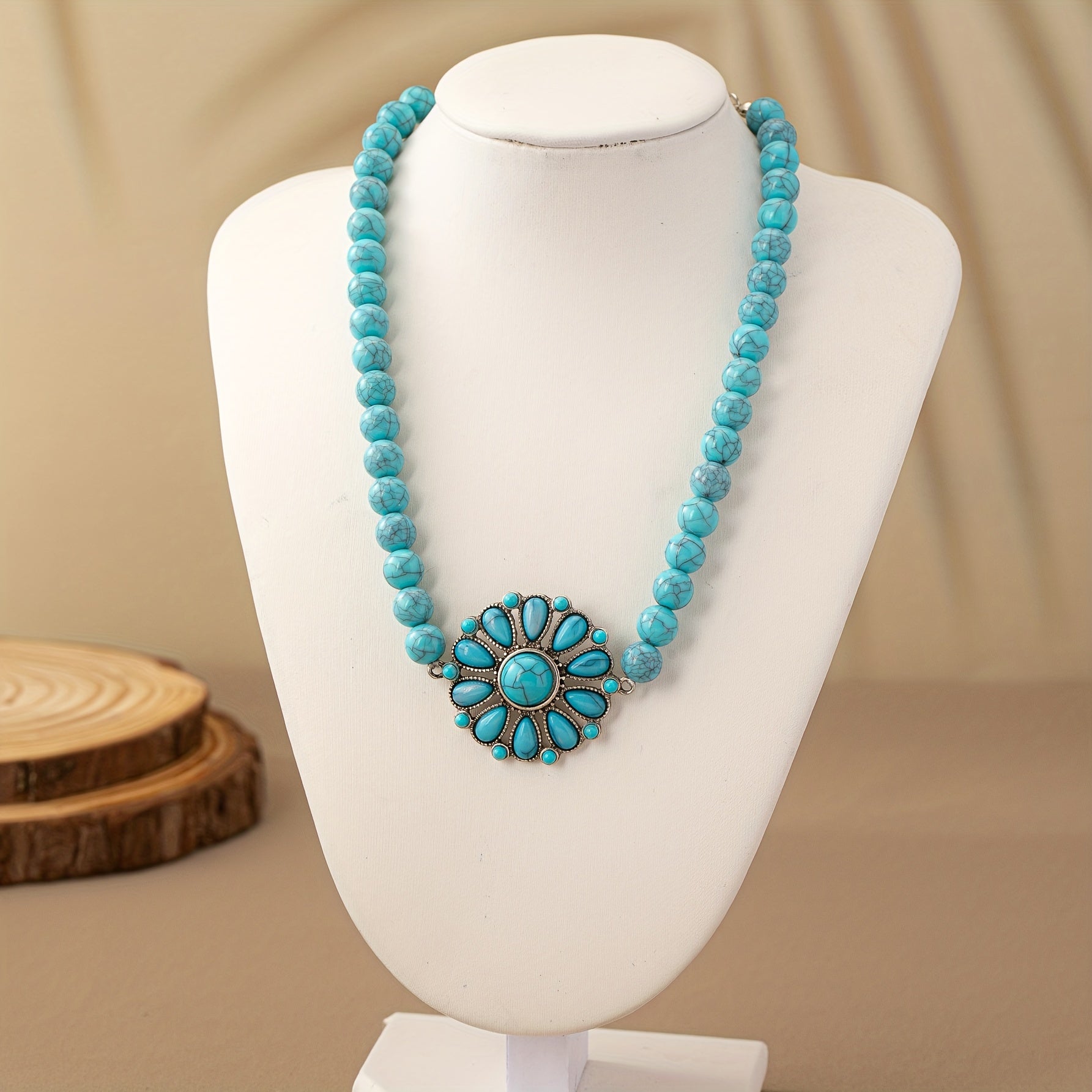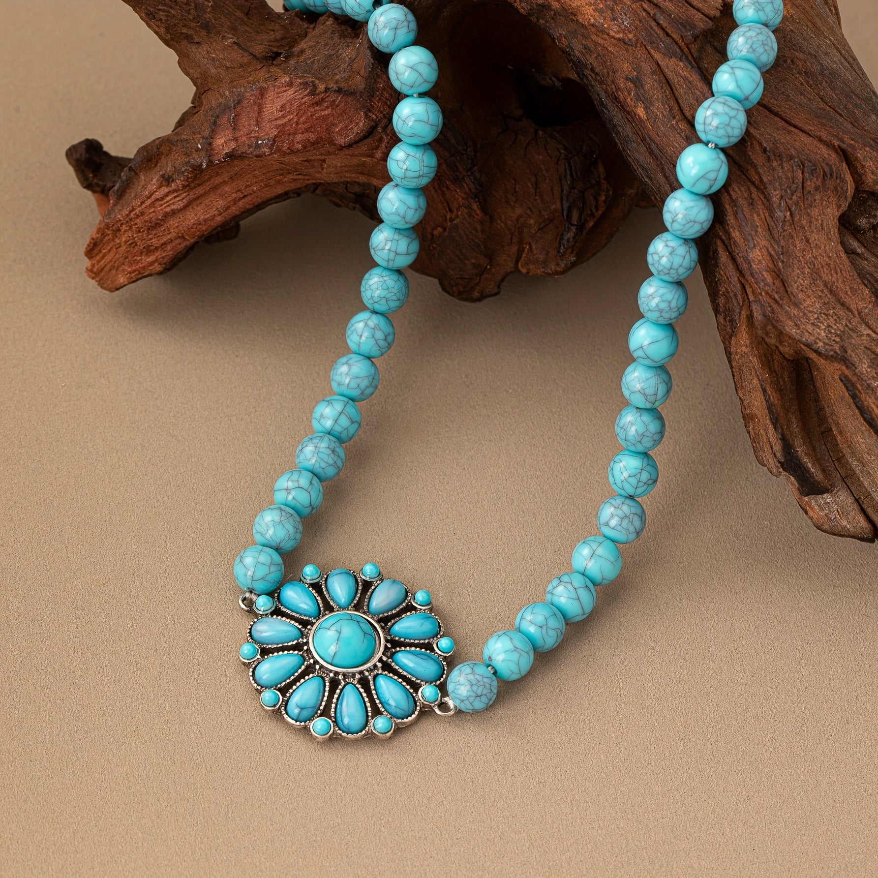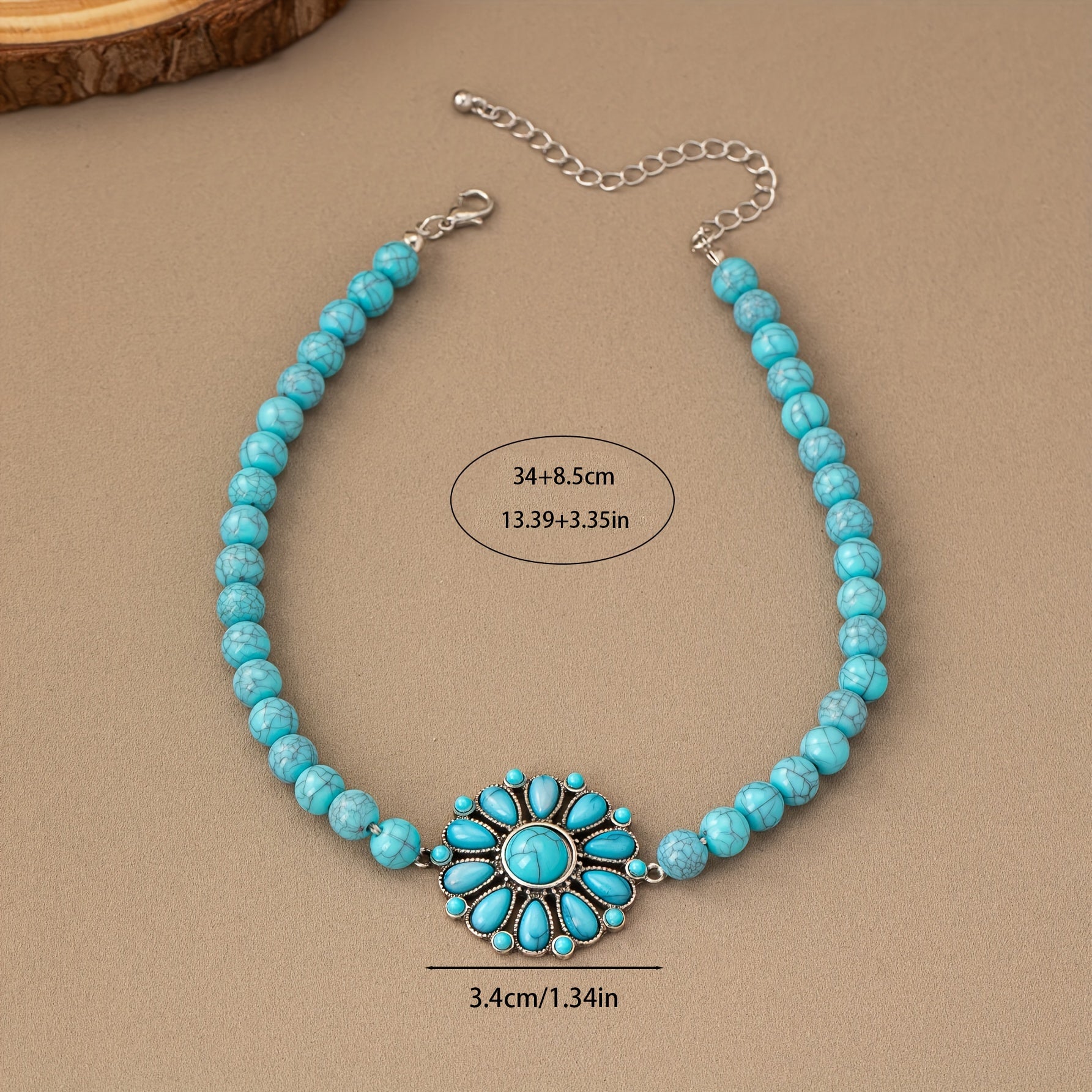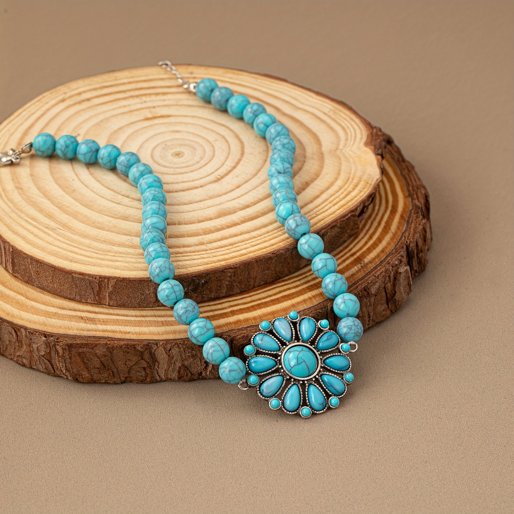 Vintage bohemian necklace featuring a green turquoise flower pendant with floral motif. Short chain design perfect for everyday wear and vacation outfits. Handmade beaded jewelry.