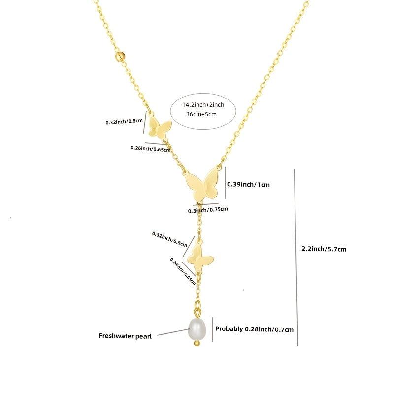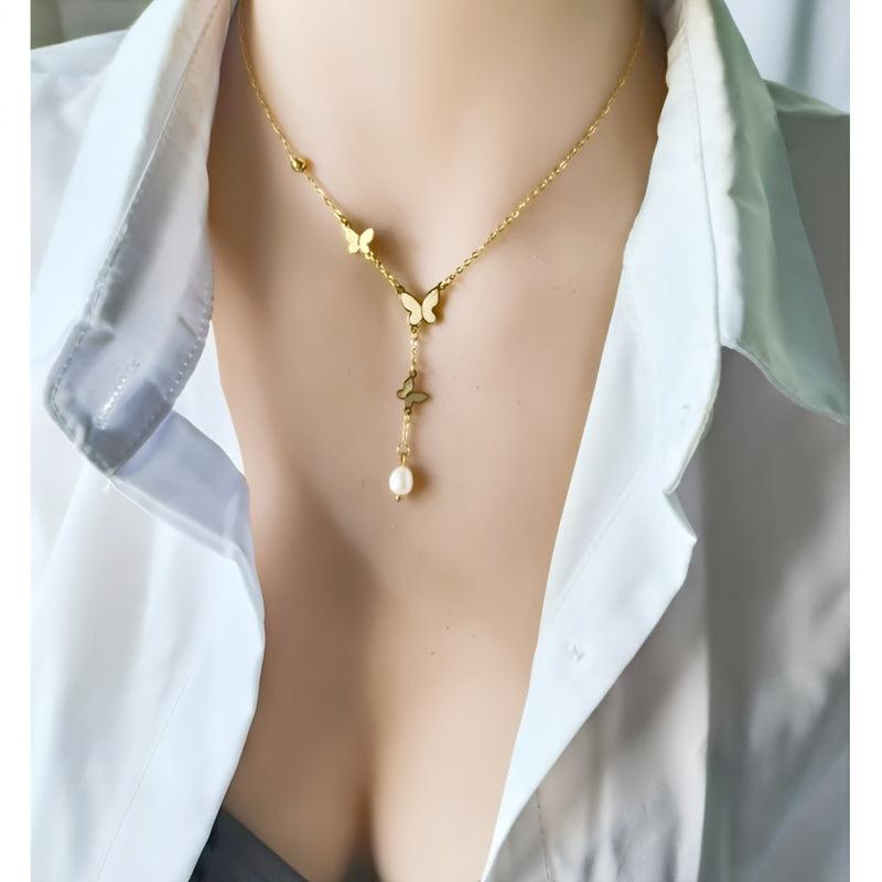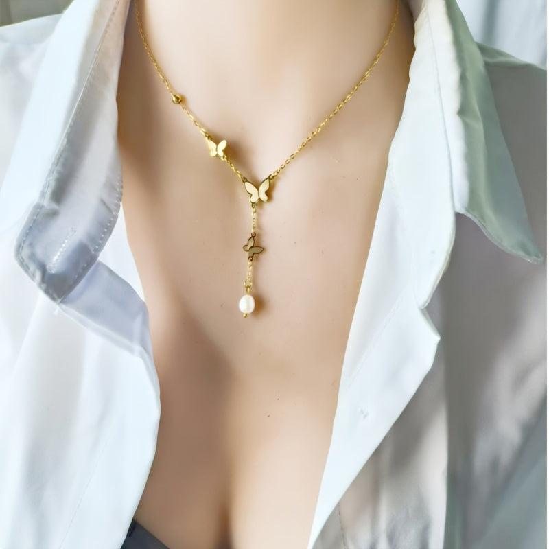 Vintage-inspired necklace featuring delicate chain with butterfly and freshwater pearls. Perfect for daily wear or parties.