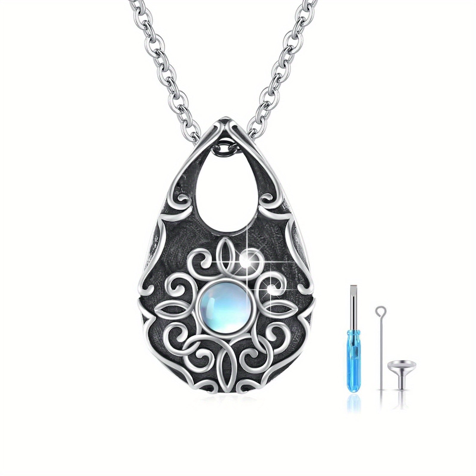 This stunning urn pendant necklace features a beautiful Celtic knot design crafted in sterling silver. The artificial moonstone vine teardrop adds an elegant touch, making it a unique ashes keepsake necklace.