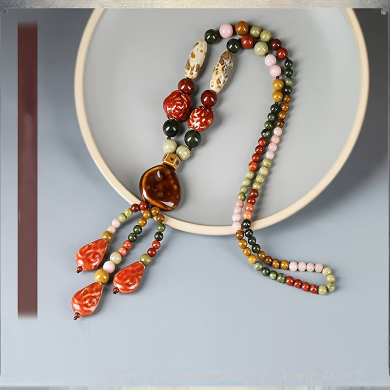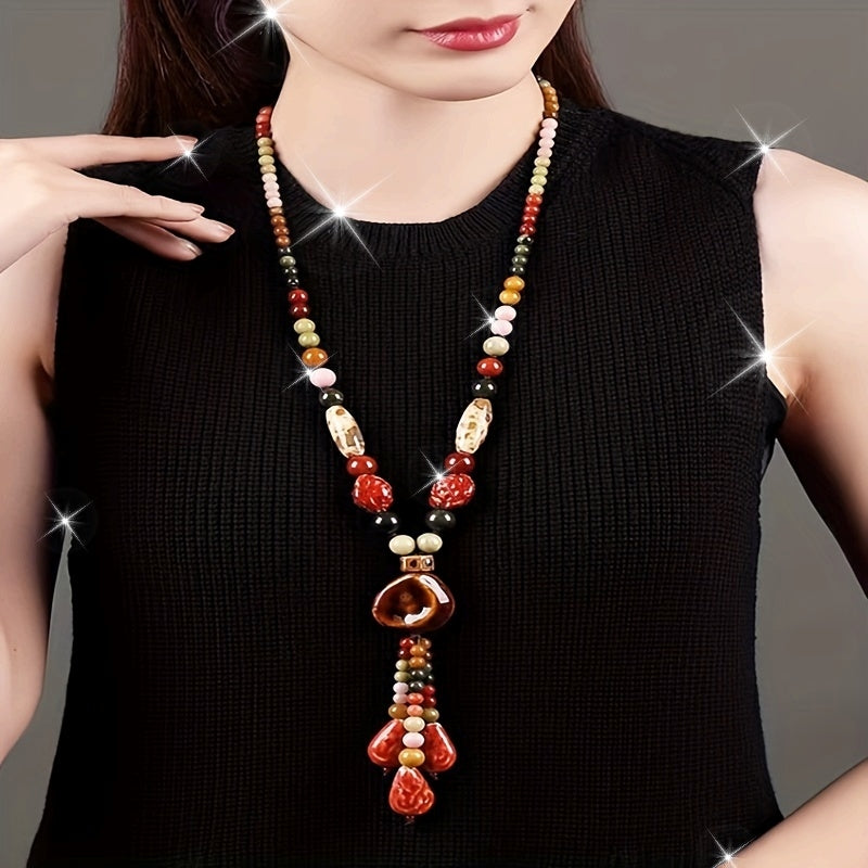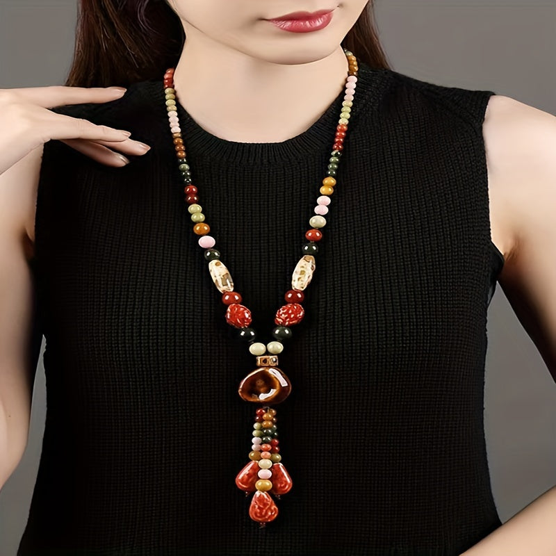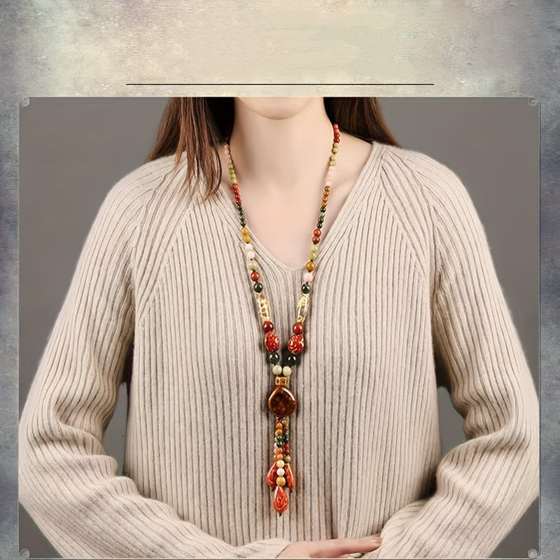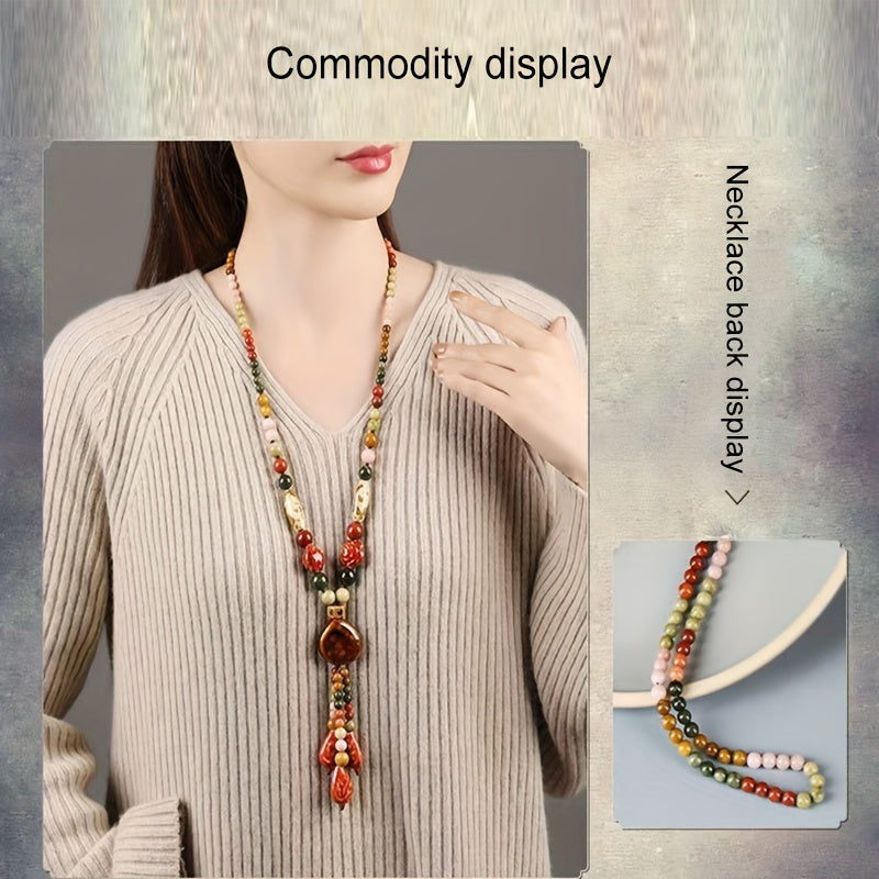 This fashionable ceramic Y necklace features a unique design inspired by tribal and Chinese styles. It is a perfect accessory for daily wear or as a gift for any occasion. The pendant is handcrafted and the chain has no plating, making it a durable and stylish choice.