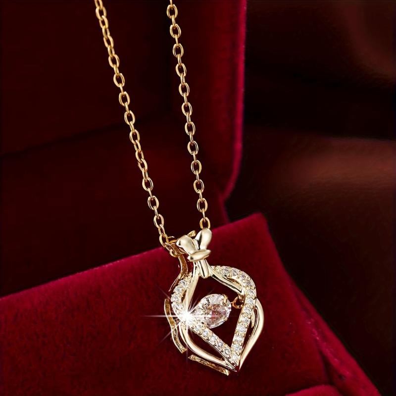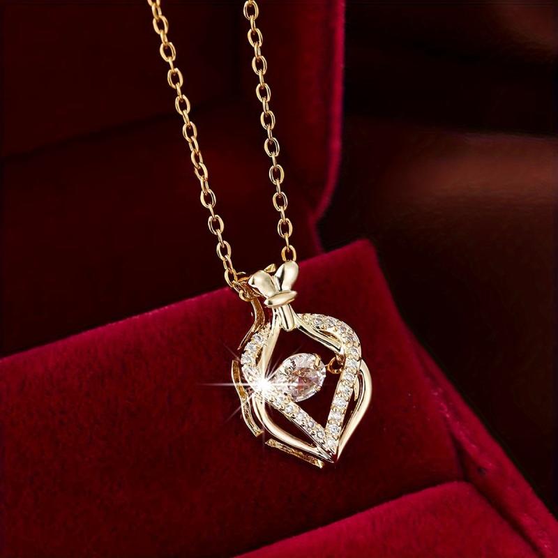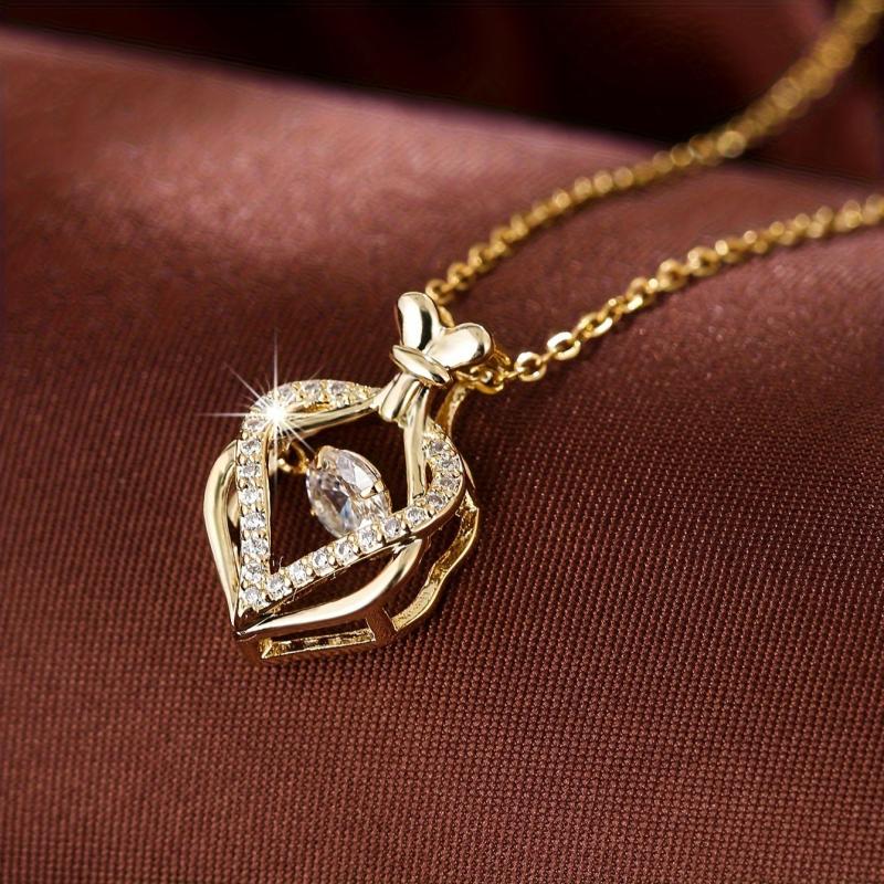 This golden tone necklace features a heart-shaped money bag pendant with synthetic zirconia crystals. Perfect gift for women.