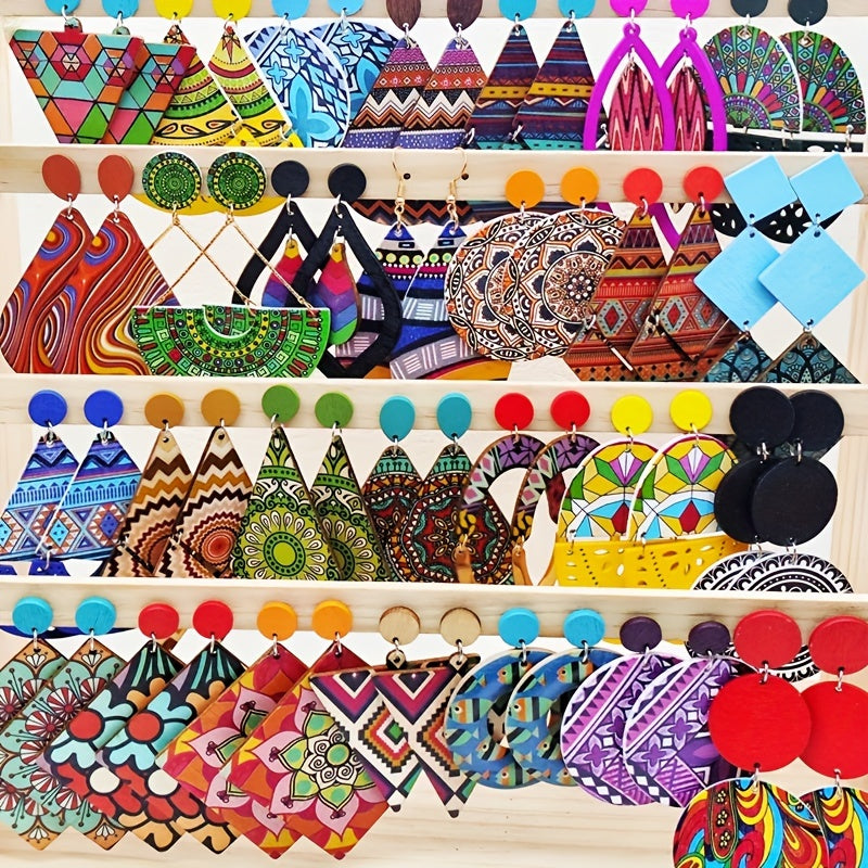 These retro bohemian style earrings feature colorful prints on wooden pendants in water drop and geometric shapes. Perfect for adding a fun and unique touch to your outfit.