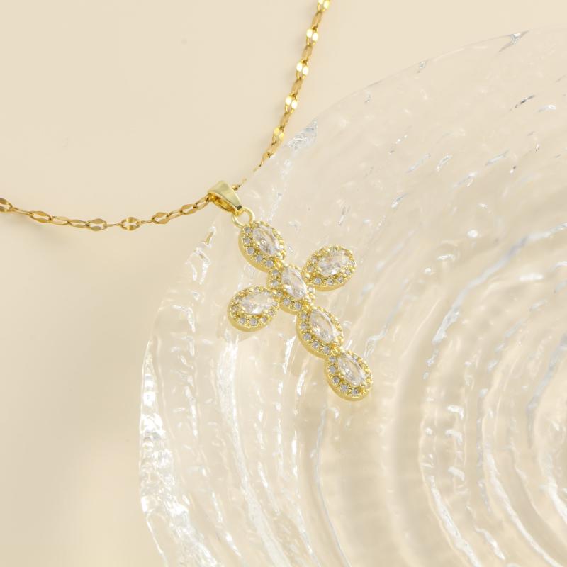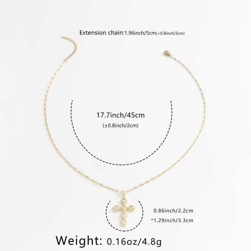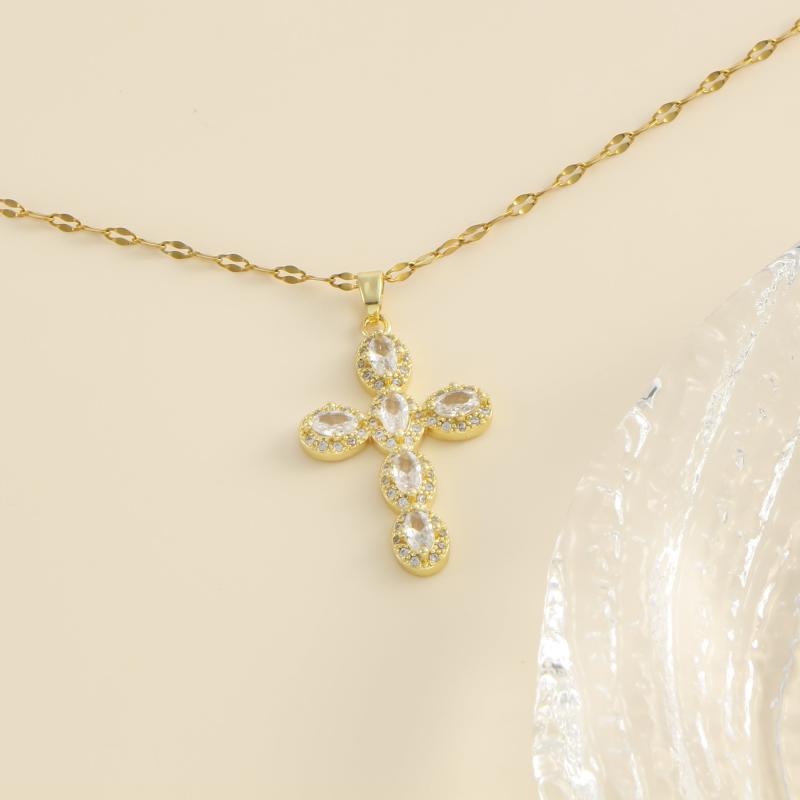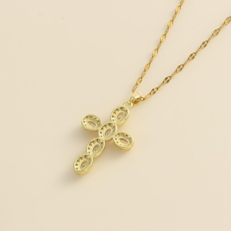 Elegant oval cut synthetic zirconia cross pendant necklace designed for parties and formal occasions. Hypoallergenic and durable stainless steel construction.