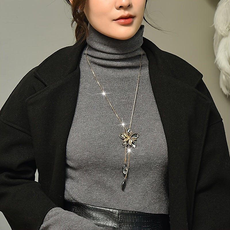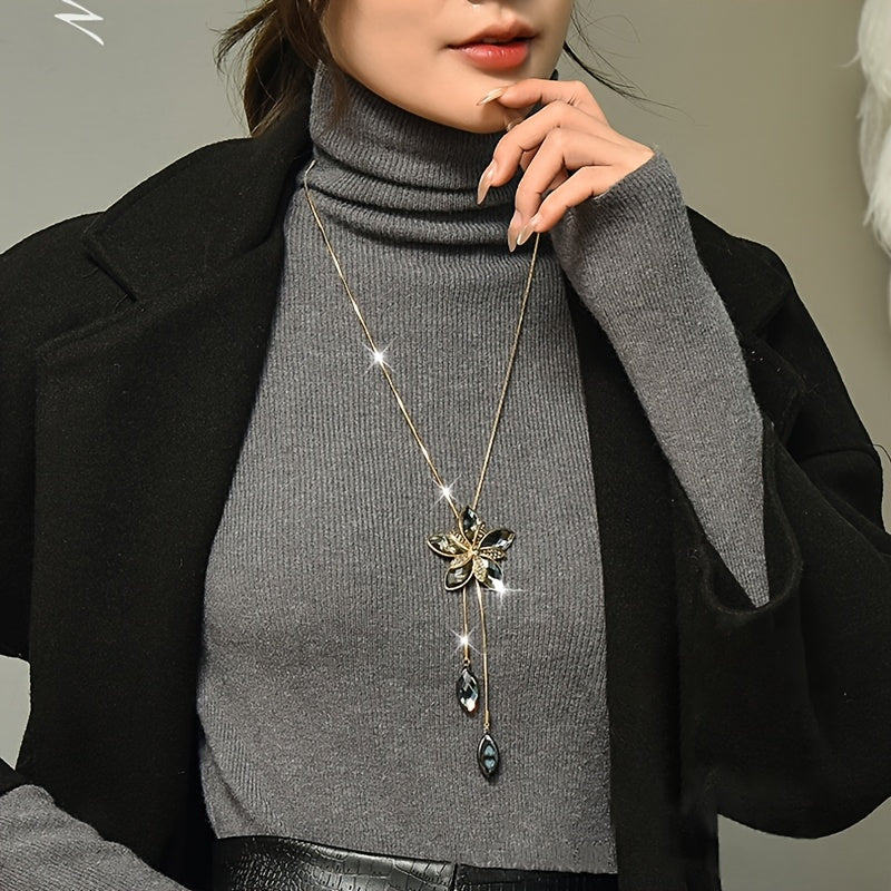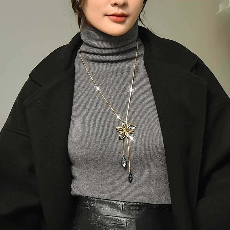 Elevate your style with this stunning long necklace featuring artificial crystal embellished marquise flower designs and teardrop pendant on a golden tone metal chain. Perfect for daily wear or formal events year-round.