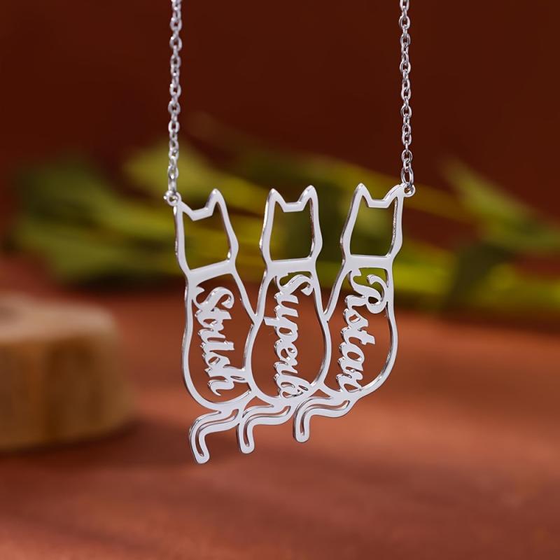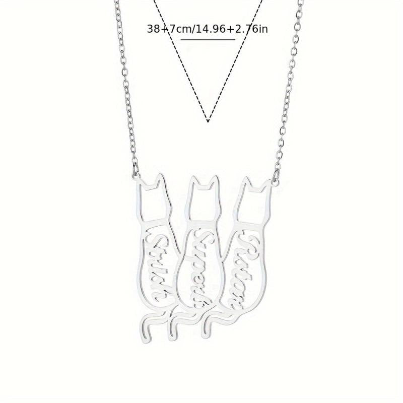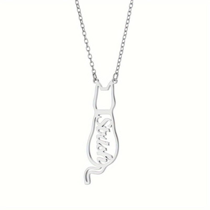 This personalized necklace features a hollow cat silhouette design with multiple English names, making it perfect for both casual and festive occasions.