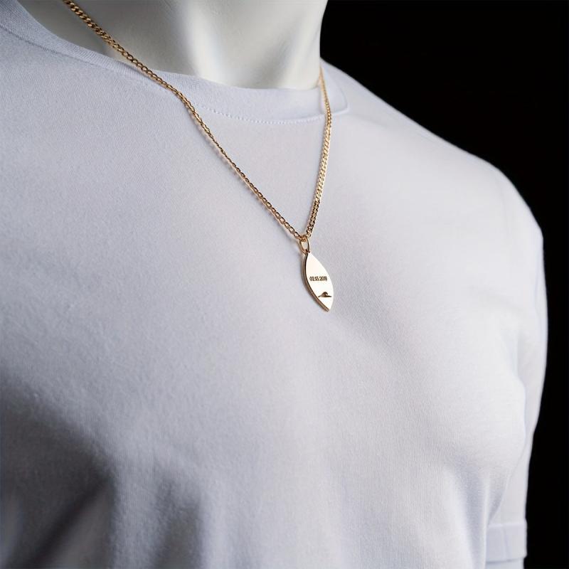 This surfboard necklace is a stylish accessory made from high-quality 304 stainless steel with an 18K golden plated finish. It is perfect for daily wear and makes a great gift for surf enthusiasts.