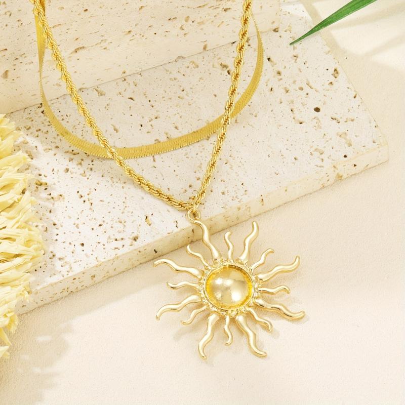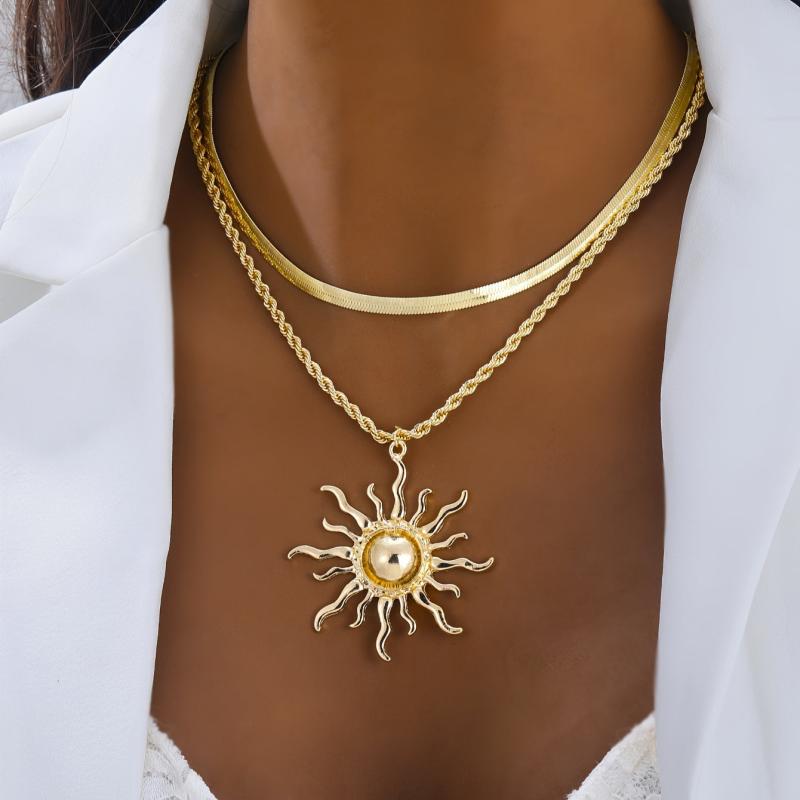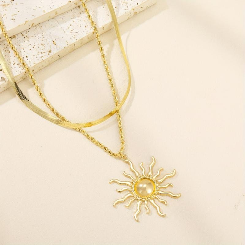 Add a touch of elegance with this double layer snake bone chain necklace featuring a sun flame pendant. Made from zinc alloy, this accessory is perfect for all seasons.
