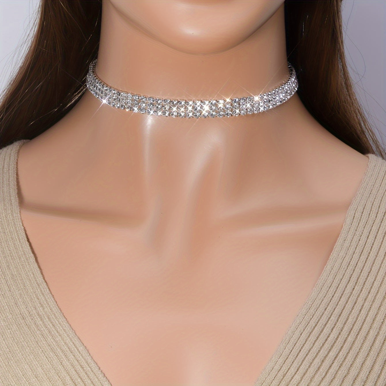This stunning three-row rhinestones necklace is perfect for parties, weddings, and banquets. It adds a touch of glamour to your outfit.