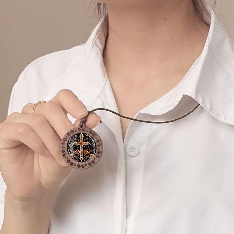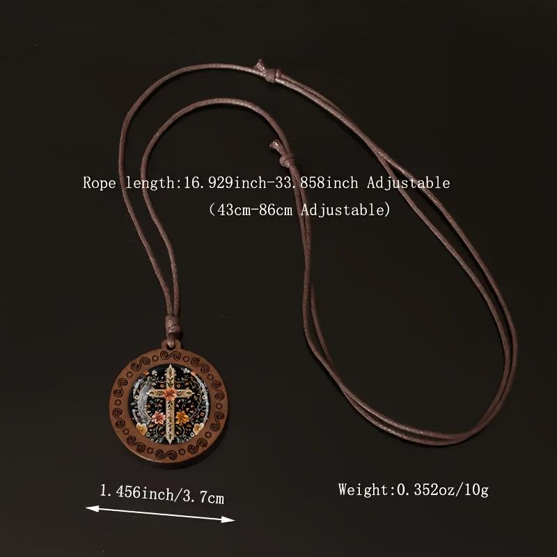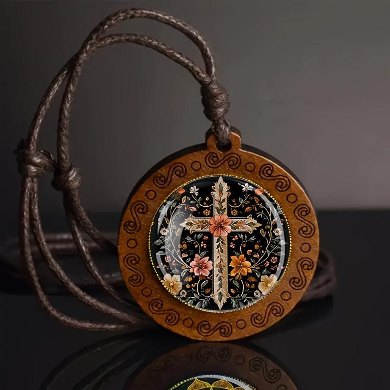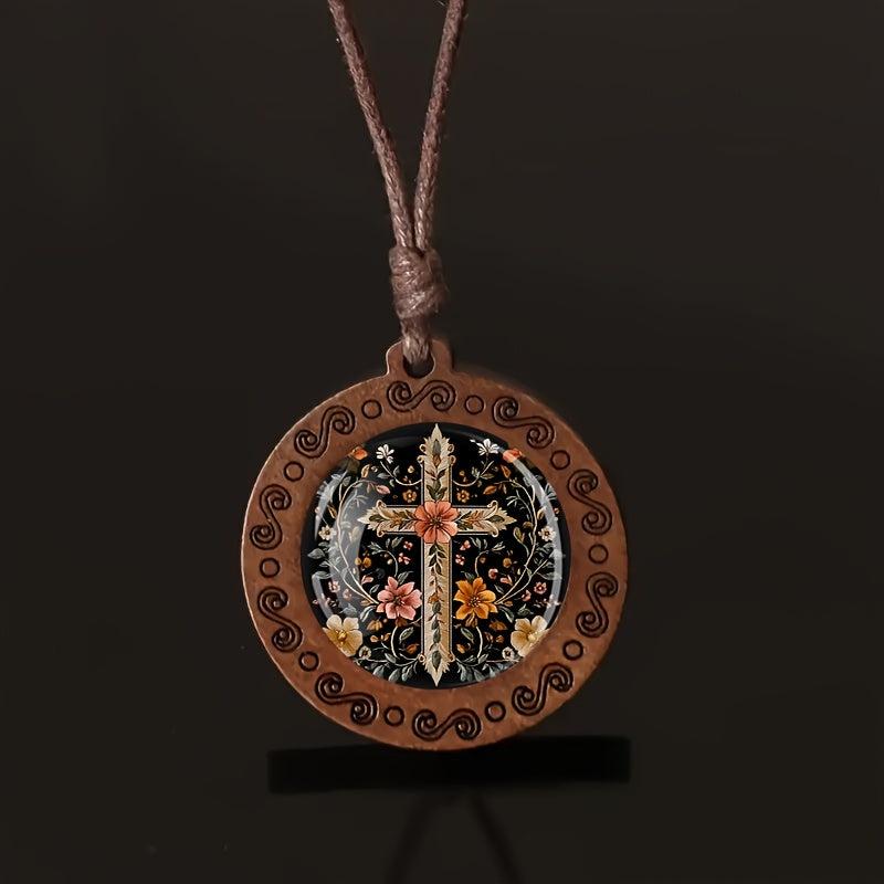 Elegant wooden pendant necklace featuring floral embroidery cross design. Adjustable cord for a comfortable fit. Perfect for daily wear or as a holiday gift.