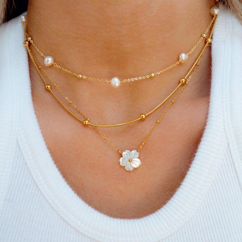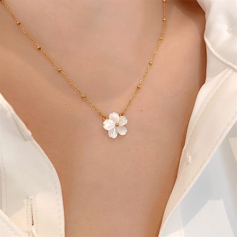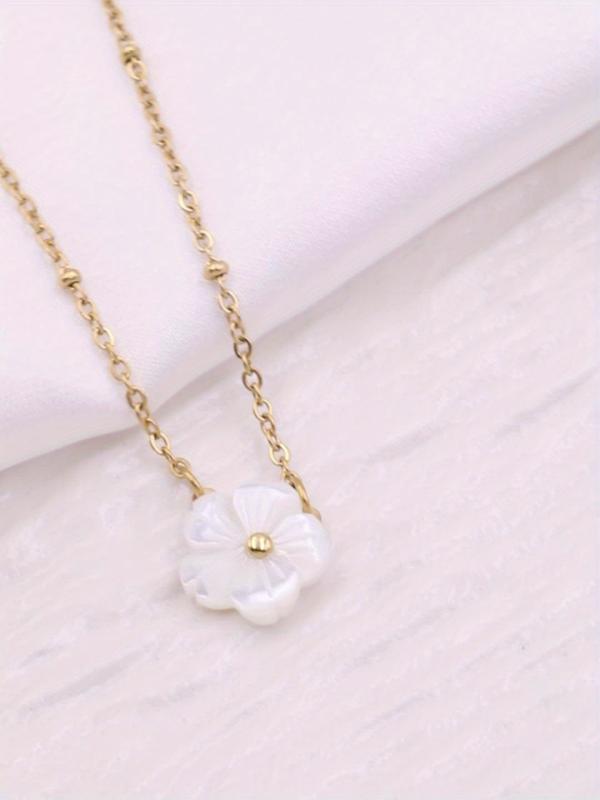 This stainless steel necklace features a delicate floral pendant adorned with golden tone beads. Perfect for daily wear, vacations, and holidays.